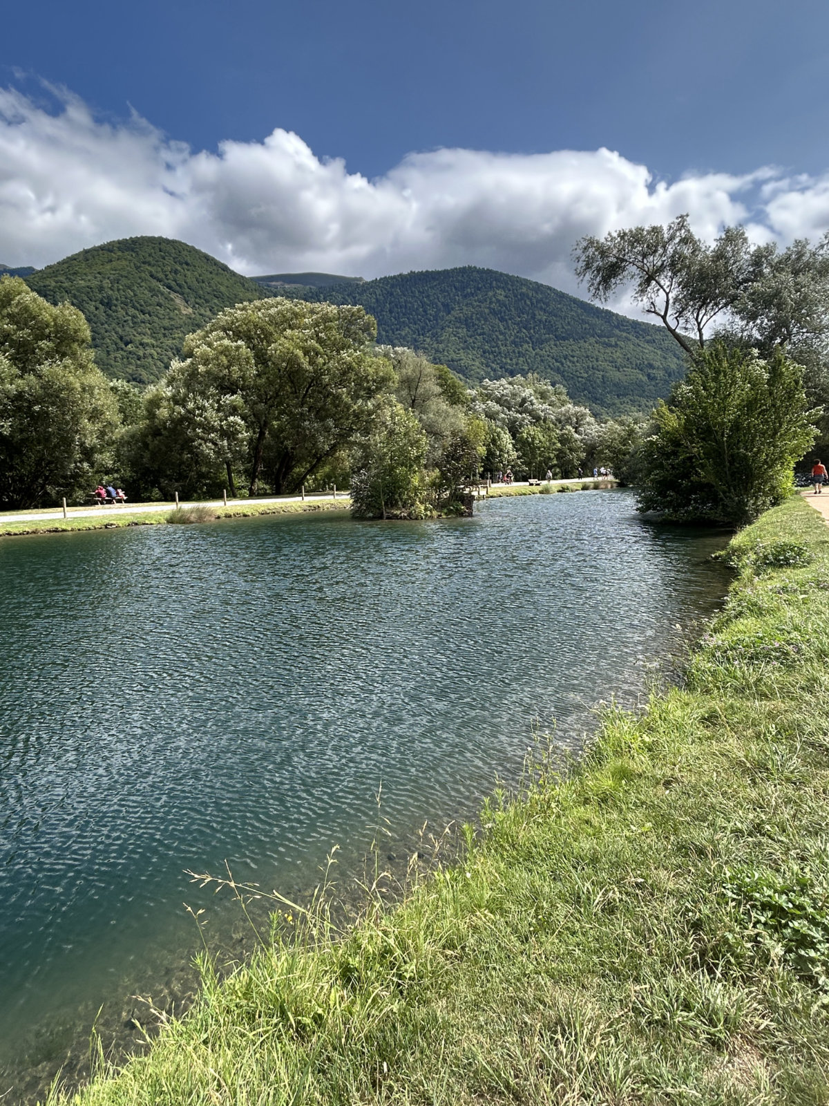 Wir sind zuerst fürs Mittagessen eingekehrt, bevor wir uns auf einen Spaziergang machten, der uns entlang des Flusses La Pique aus dem Städtchen hinausführte. Der Fluss wurde etwas gestaut und bildet einen länglichen See, an einer Stelle des Sees markieren Bojen das putzige Freibad. Zu unserer linken liegt der Flugplatz mit Graspiste, wir sahen nur Segelflieger.