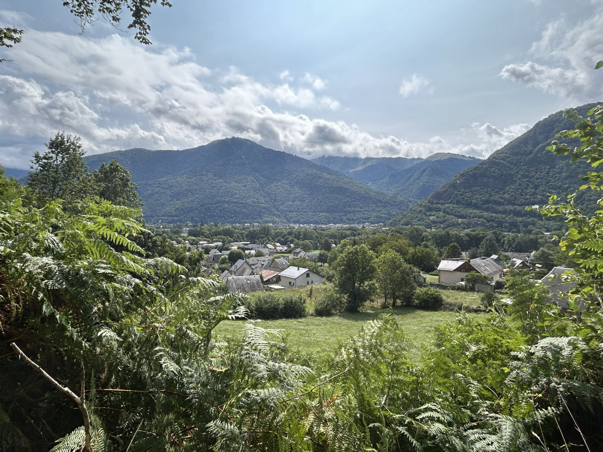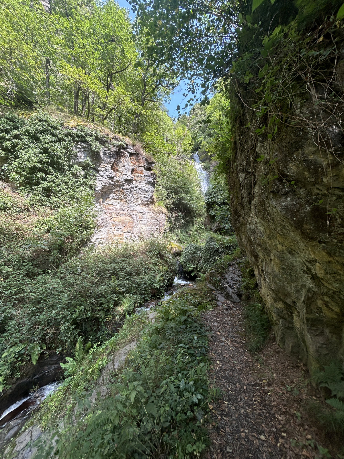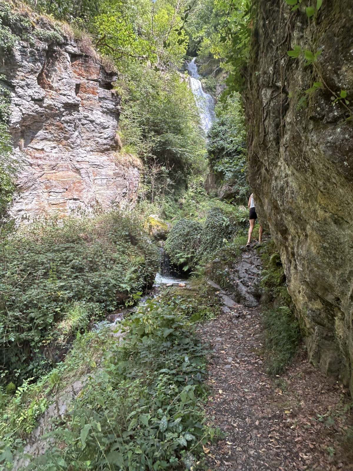 Am Ende des Sees erreichten wir einen Wasserfall (Cascade), von da an gings im Zickzack durch den Wald bergan und später durch schöne Quartiere mit hübschen Häusern aus Stein und Holz zur Nachbarsgemeinde von Luchon.