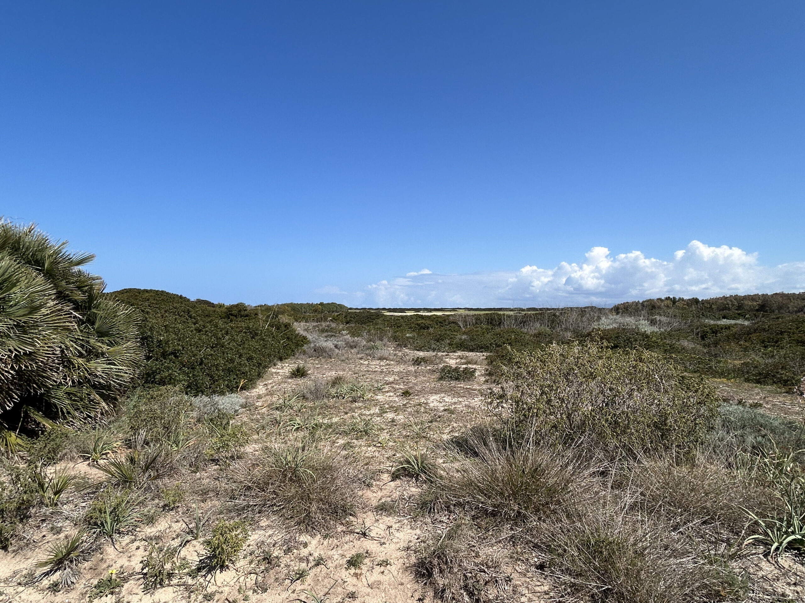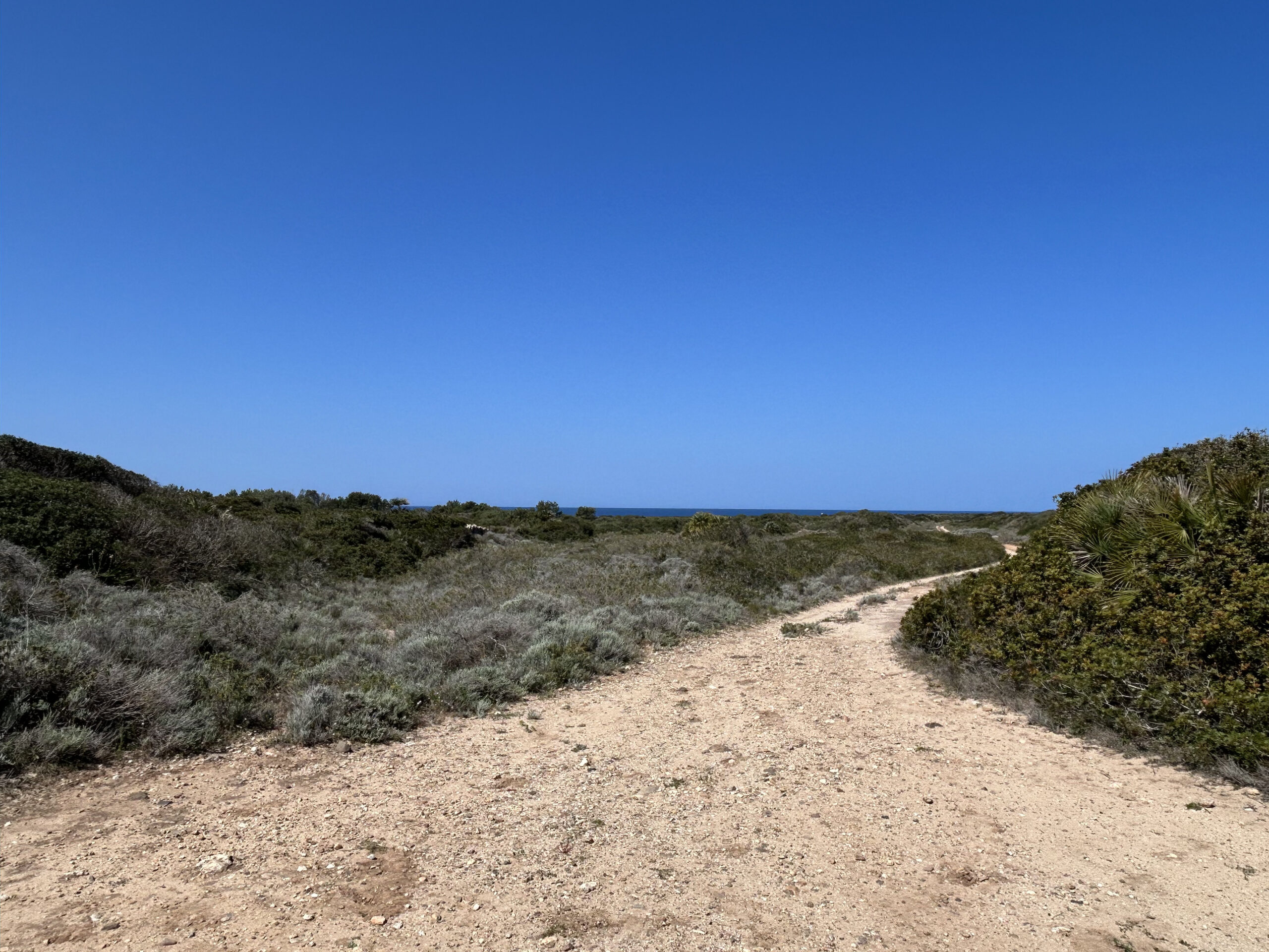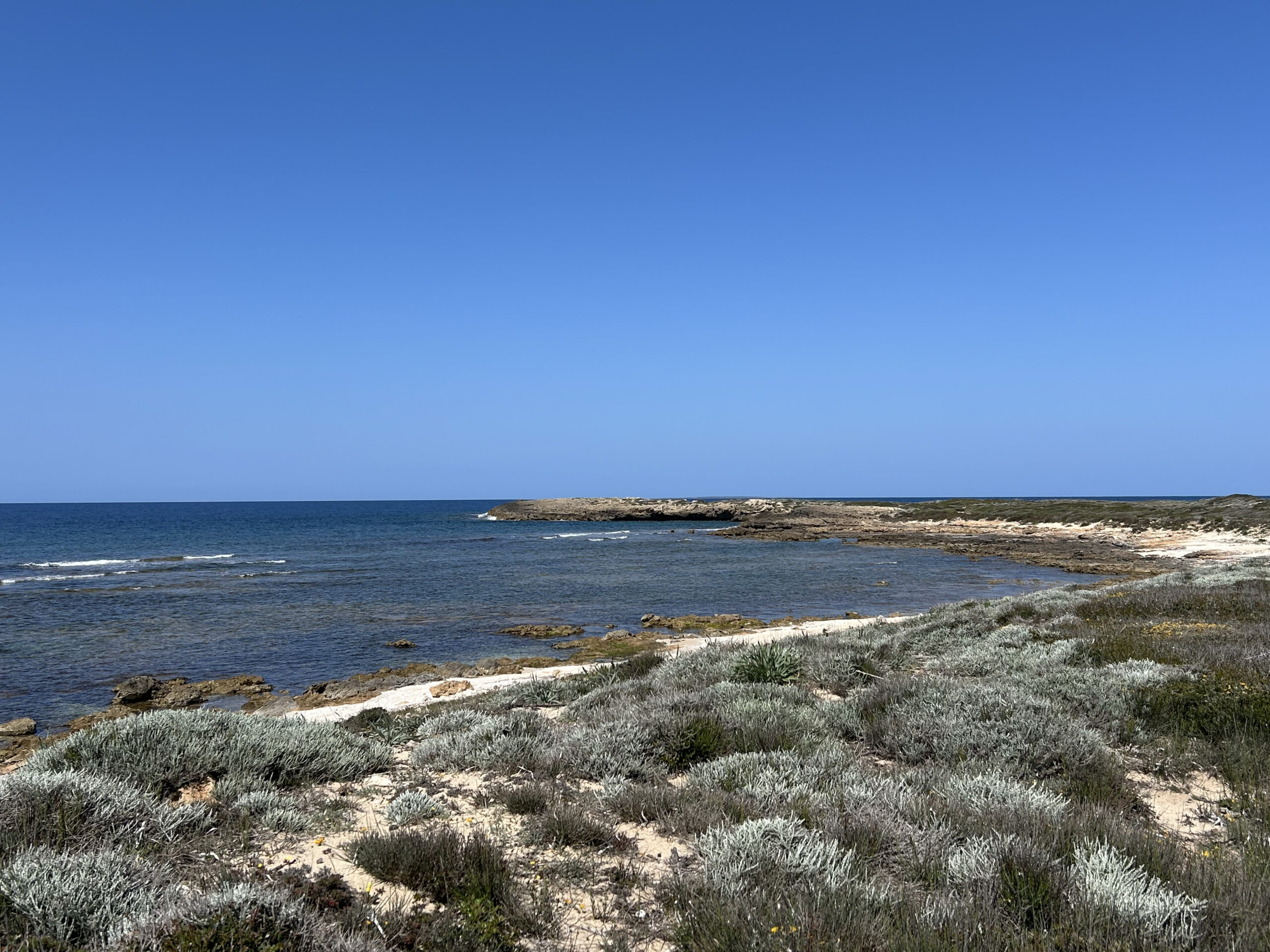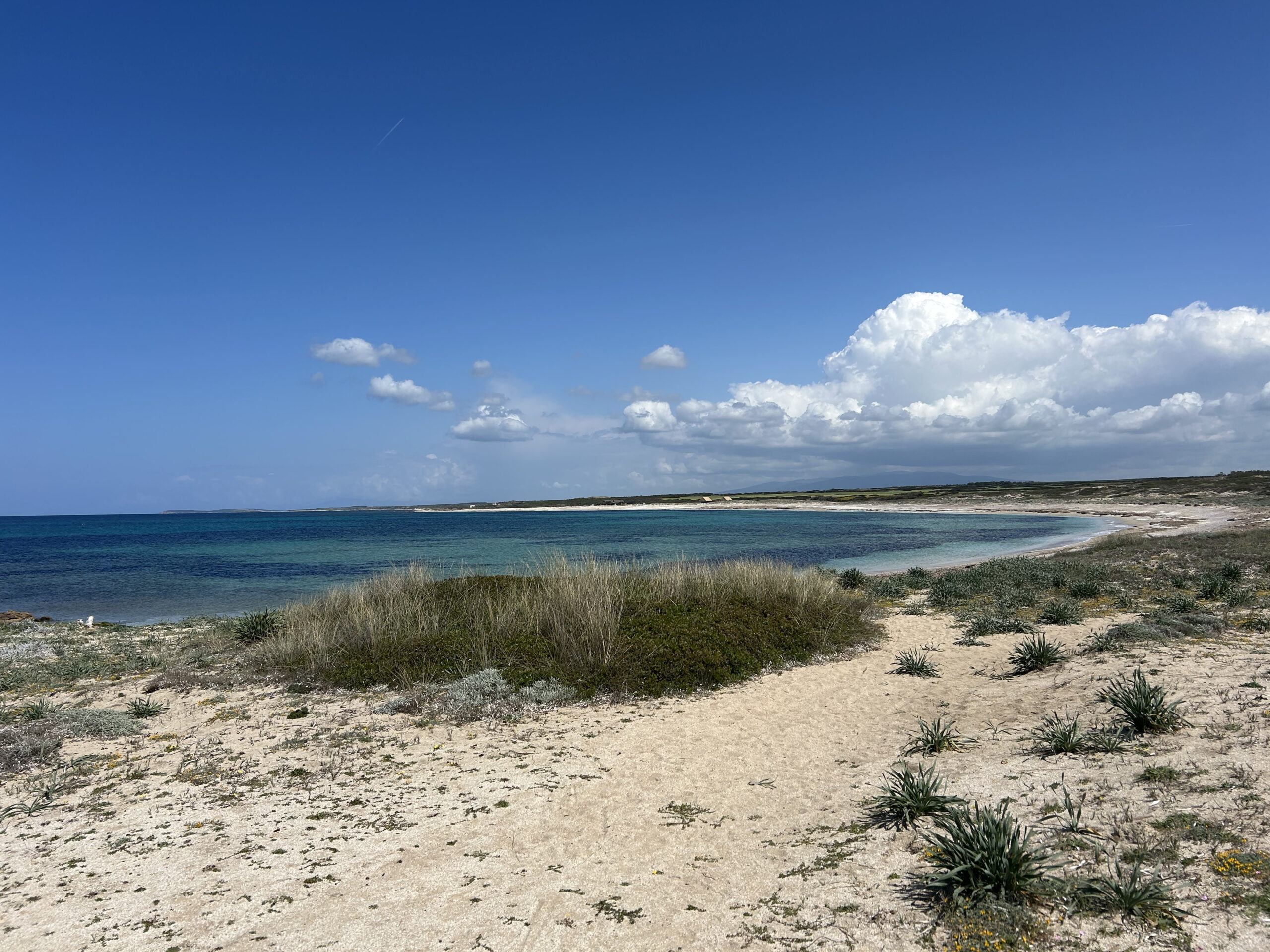Heute gehen wir durch den Naturpark Turr e Seu, durch dichte, hüfthohe Macchia, eine Vielzahl an ineinander verschachtelten Pflanzen drängen sich hier auf engem Raum, von Zeit zu Zeit bilden Bäume einen schattigen Spalier, durch den unser Weg führt, wo die Macchia im Landesinnern endet, schliessen sich gelbe und grüne Flächen an, es sind landwirtschaftliche Felder. Als wir die Küste erreichen, haben wir Ausblick auf das Cap San Marco, wir gehen am Torre di Seu vorbei und erreichen die Spiaggia di Maimoni. Der Strand besteht grösstenteils aus reiskorngrossen, rundgewaschenen Quarzteilchen. Wir gehen der Küste entlang, der Maestrale sorgt dafür, dass wir nicht überhitzen, die Sonne scheint kräftig von einem beinahe wolkenlosen Himmel. Die Macchia entlang der Küste gleicht nun bodendeckenden Pflanzen, die uns kaum bis zum Knie reichen. Wir setzen uns an den Strand, essen Salami und Käse und bewundern den schönen Küstenstreifen, bevor wir ins nur wenige Kilometer entfernte San Giovanni di Sinis fahren, um uns einen Apéro zu gönnen.