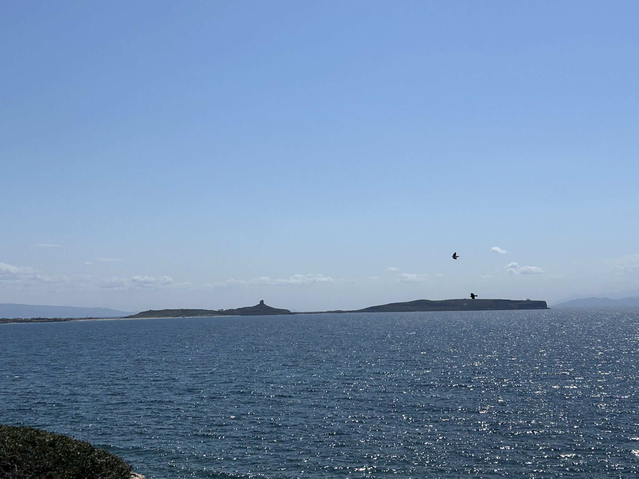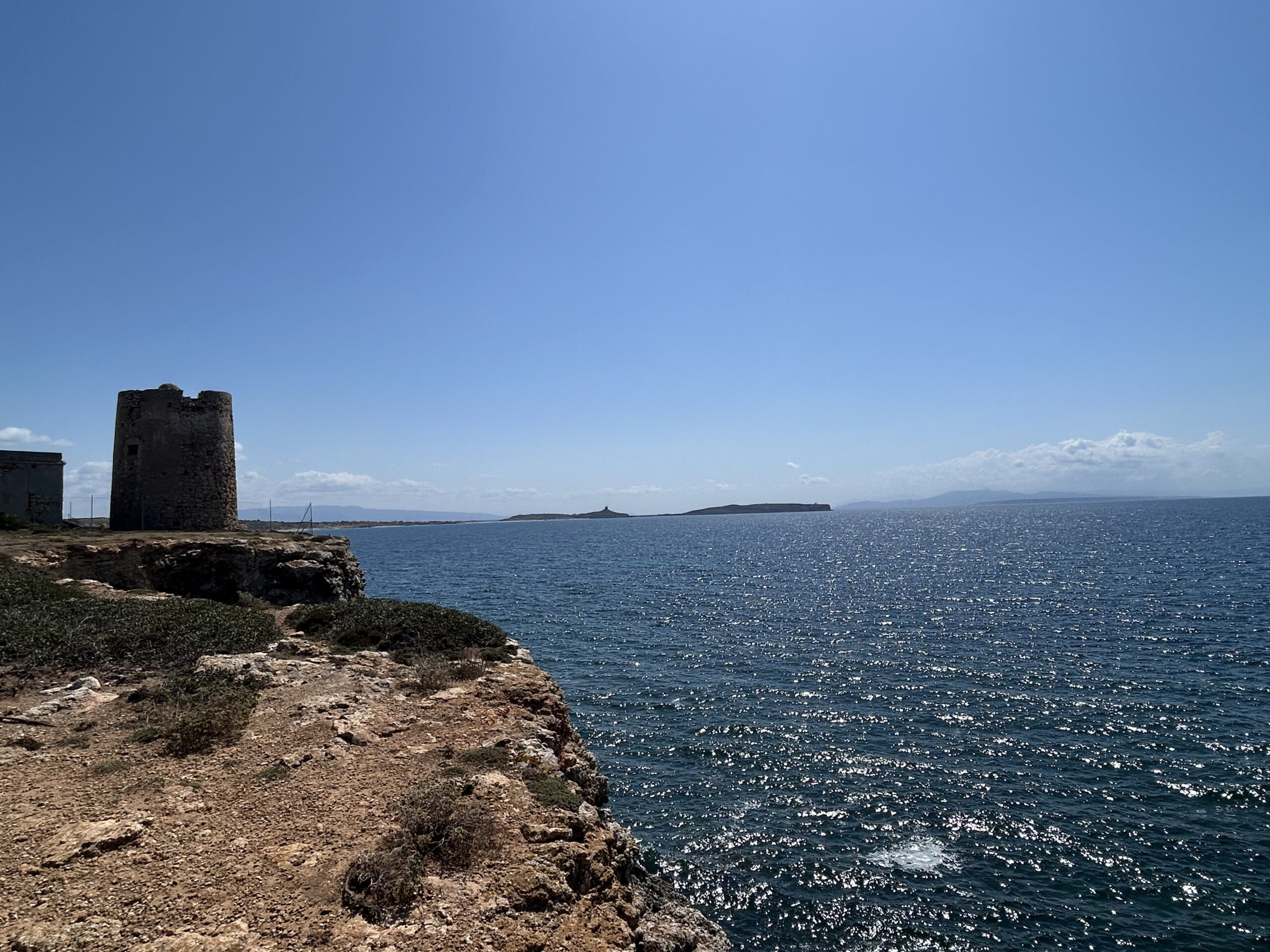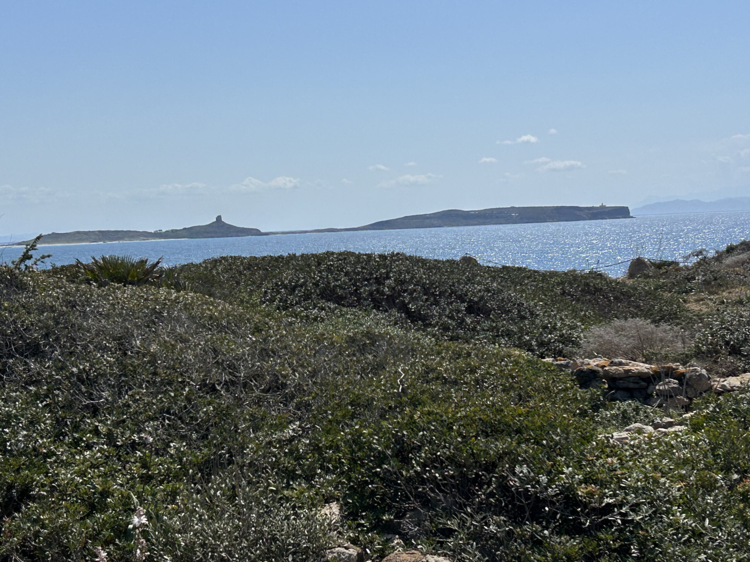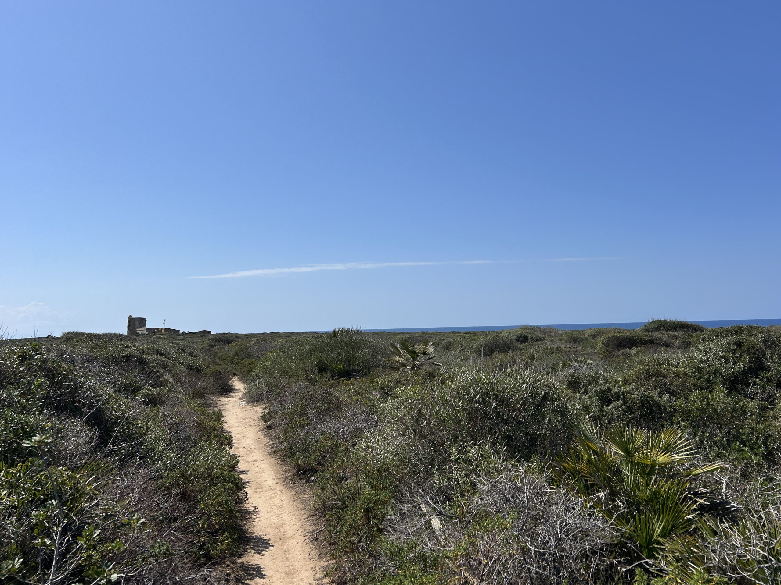 Heute gehen wir durch den Naturpark Turr e Seu, durch dichte, hüfthohe Macchia, eine Vielzahl an ineinander verschachtelten Pflanzen drängen sich hier auf engem Raum, von Zeit zu Zeit bilden Bäume einen schattigen Spalier, durch den unser Weg führt, wo die Macchia im Landesinnern endet, schliessen sich gelbe und grüne Flächen an, es sind landwirtschaftliche Felder. Als wir die Küste erreichen, haben wir Ausblick auf das Cap San Marco, wir gehen am Torre di Seu vorbei und erreichen die Spiaggia di Maimoni. Der Strand besteht grösstenteils aus reiskorngrossen, rundgewaschenen Quarzteilchen. Wir gehen der Küste entlang, der Maestrale sorgt dafür, dass wir nicht überhitzen, die Sonne scheint kräftig von einem beinahe wolkenlosen Himmel. Die Macchia entlang der Küste gleicht nun bodendeckenden Pflanzen, die uns kaum bis zum Knie reichen. Wir setzen uns an den Strand, essen Salami und Käse und bewundern den schönen Küstenstreifen, bevor wir ins nur wenige Kilometer entfernte San Giovanni di Sinis fahren, um uns einen Apéro zu gönnen.