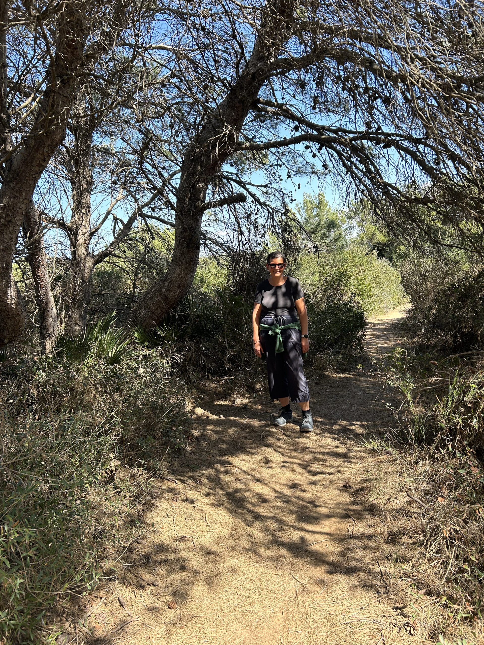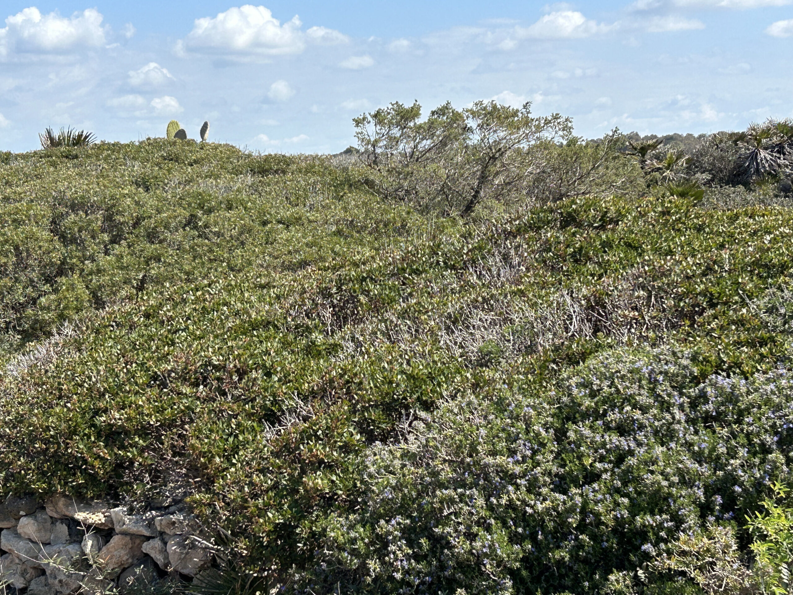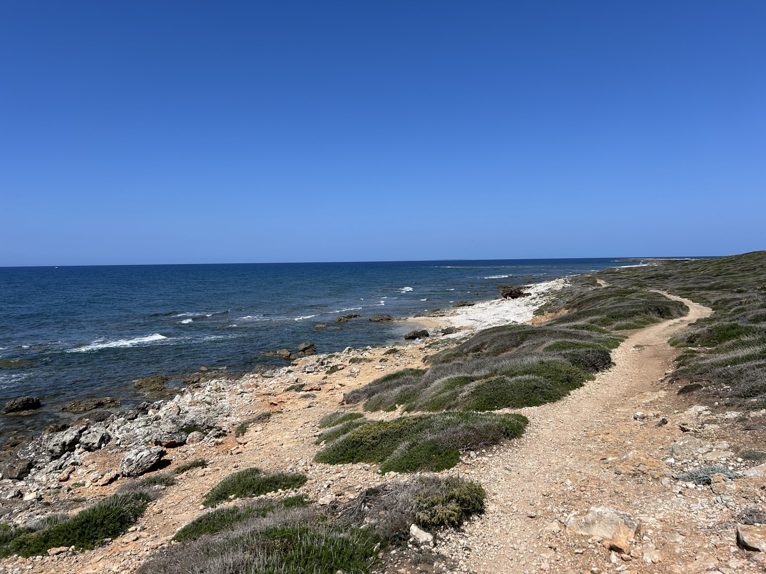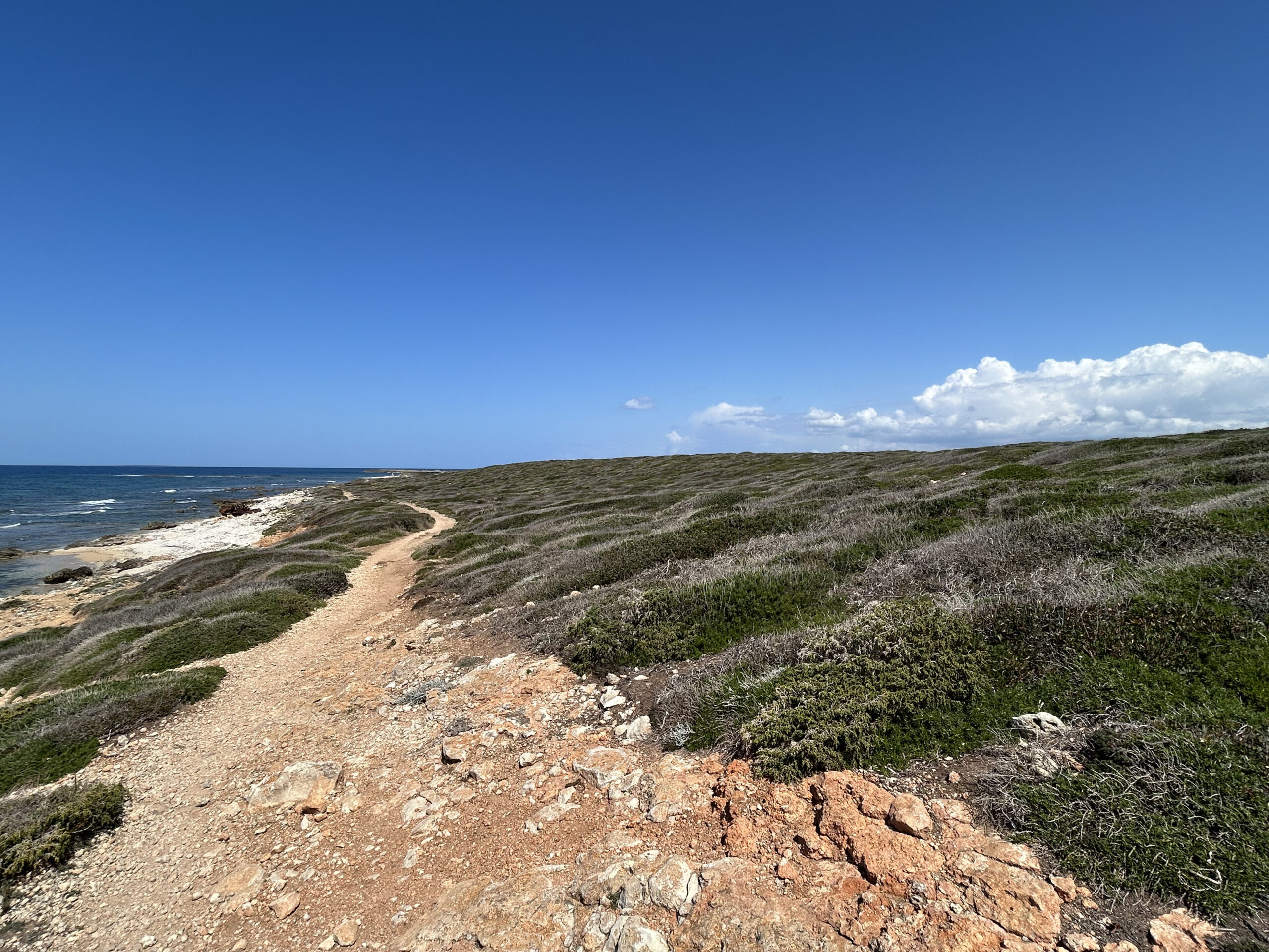 Heute gehen wir durch den Naturpark Turr e Seu, durch dichte, hüfthohe Macchia, eine Vielzahl an ineinander verschachtelten Pflanzen drängen sich hier auf engem Raum, von Zeit zu Zeit bilden Bäume einen schattigen Spalier, durch den unser Weg führt, wo die Macchia im Landesinnern endet, schliessen sich gelbe und grüne Flächen an, es sind landwirtschaftliche Felder. Als wir die Küste erreichen, haben wir Ausblick auf das Cap San Marco, wir gehen am Torre di Seu vorbei und erreichen die Spiaggia di Maimoni. Der Strand besteht grösstenteils aus reiskorngrossen, rundgewaschenen Quarzteilchen. Wir gehen der Küste entlang, der Maestrale sorgt dafür, dass wir nicht überhitzen, die Sonne scheint kräftig von einem beinahe wolkenlosen Himmel. Die Macchia entlang der Küste gleicht nun bodendeckenden Pflanzen, die uns kaum bis zum Knie reichen. Wir setzen uns an den Strand, essen Salami und Käse und bewundern den schönen Küstenstreifen, bevor wir ins nur wenige Kilometer entfernte San Giovanni di Sinis fahren, um uns einen Apéro zu gönnen.