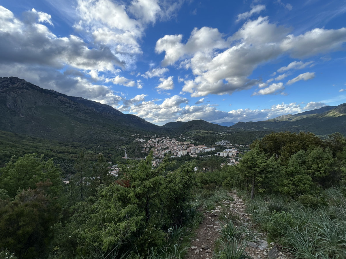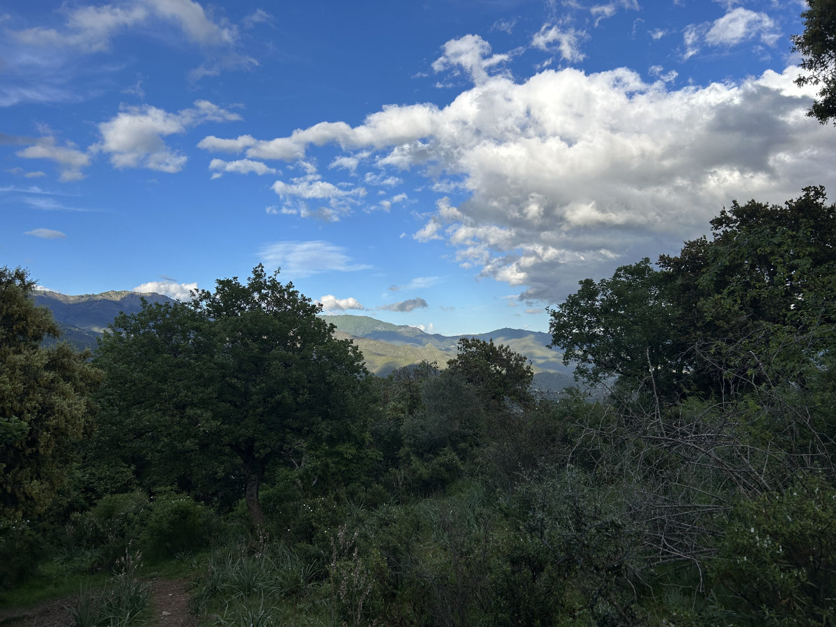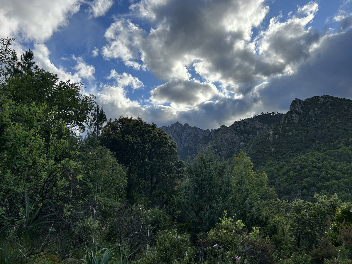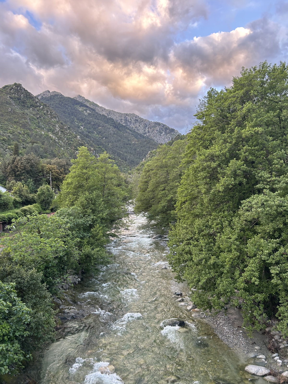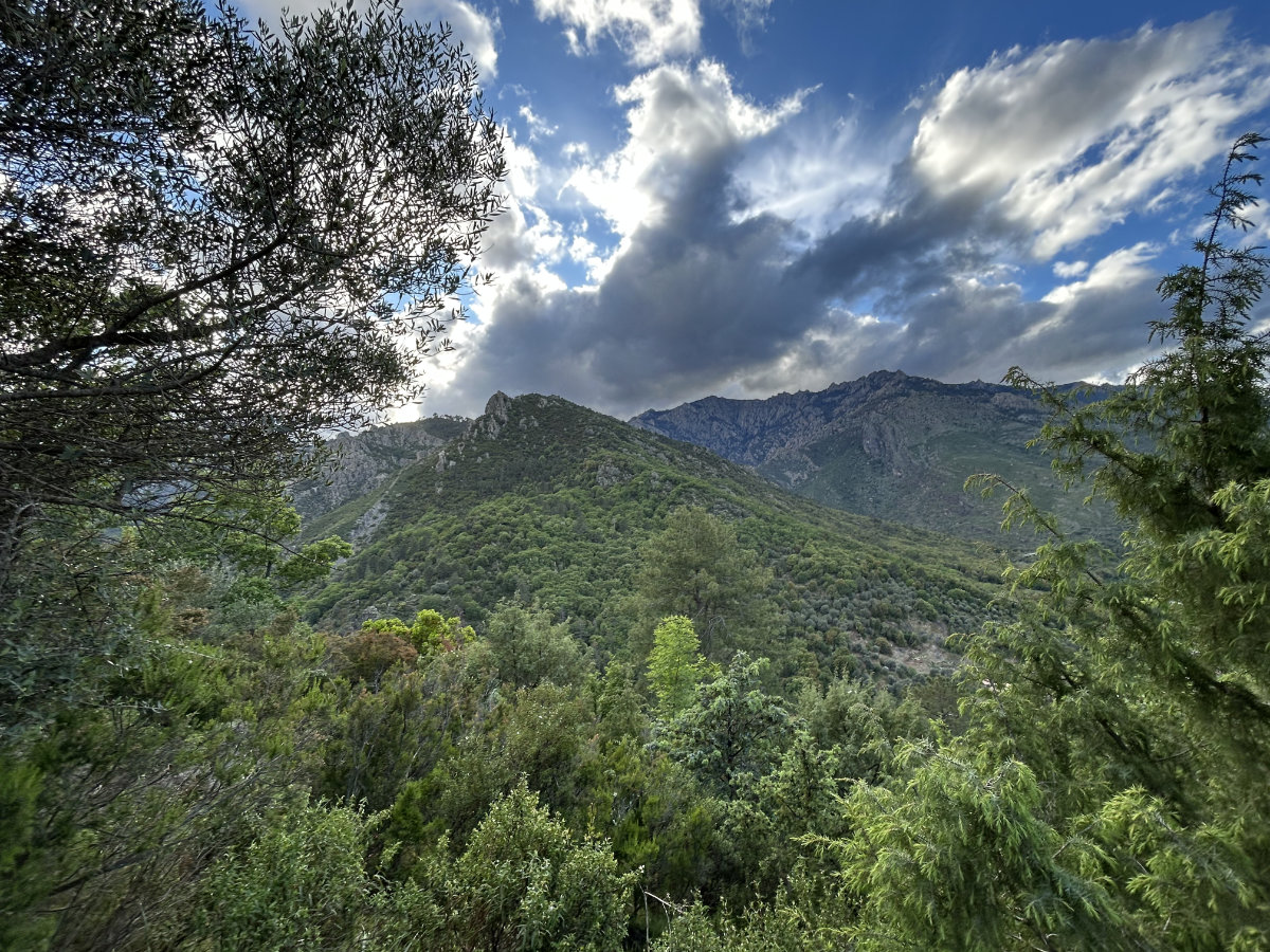 Anhaltender Regen hält uns davon ab, das Haus zu verlassen. Als im späteren Nachmittag das Wetter aufklart, verpassen wir den geigneten Zeitpunkt, uns auf den Weg zu machen. Kurz nach 18.30 Uhr beschliessen wir spontan, doch noch aufzubrechen. Der Einstieg ins Restonica-Tal beginnt gleich bei uns um die Ecke. Voller Elan steigen wir den steilen Pfad im Hang hoch, bald schon haben wir Ausblick auf Corte unter uns, die Brücke über die Restonica und die Strasse das Tal hoch. Nach einer Stunde legen wir eine Rauchpause ein und kehren dann um, wir wollen noch bei Tageslicht wieder in Corte eintreffen. Noch einmal begeben wir uns ins Stadtzentrum um einzukehren, wir haben nie zweimal im selben Restaurant gegessen, wurden aber jedesmal charmant bedient und das Essen war vorzüglich, sei es ein Rindsfilet mit Kartoffeln, Salat und Kastanien, Linsen mit Würstchen oder ein Salat mit Kartoffeln und heissem Ziegenkäse.