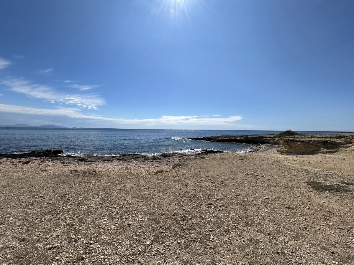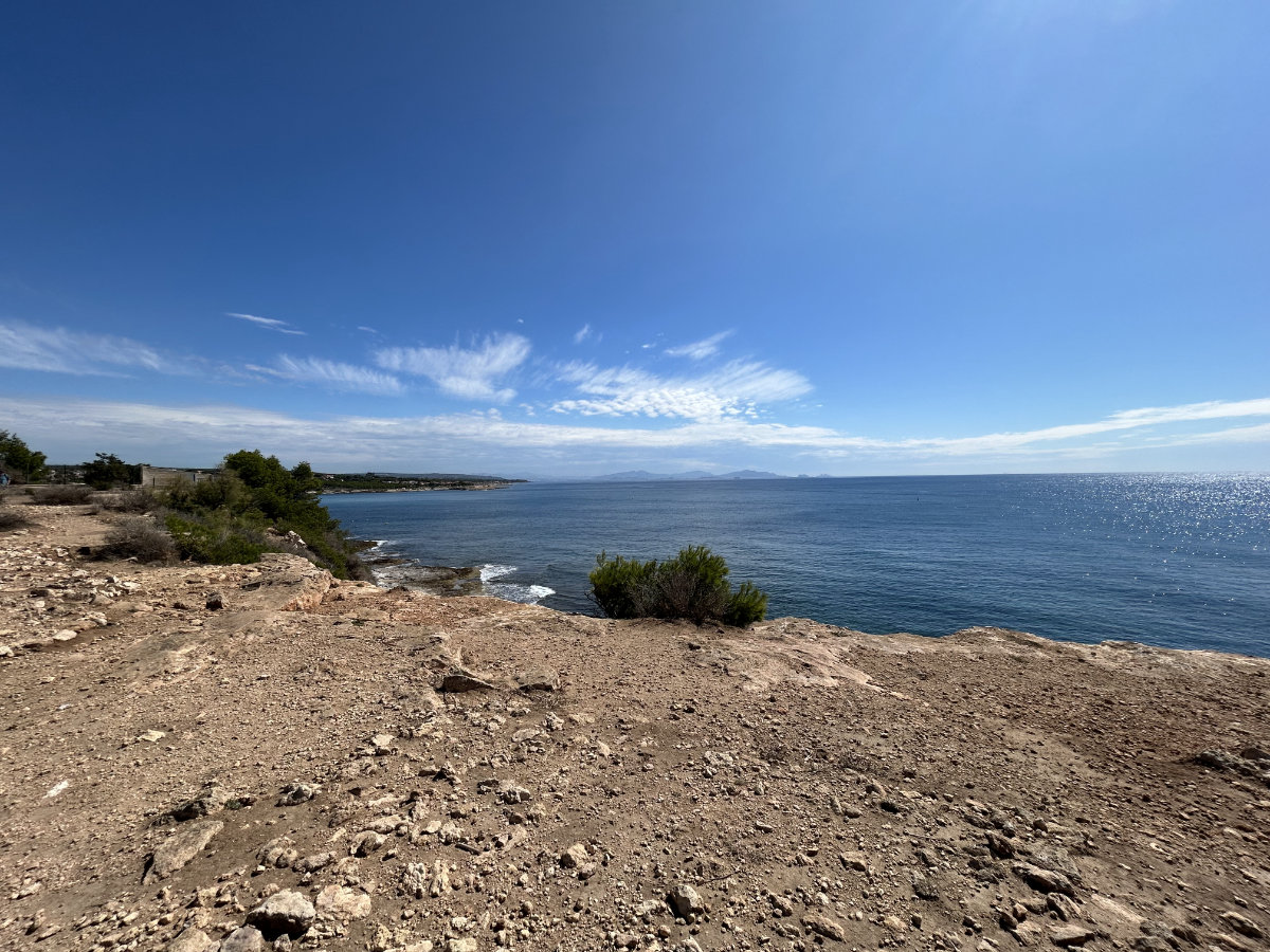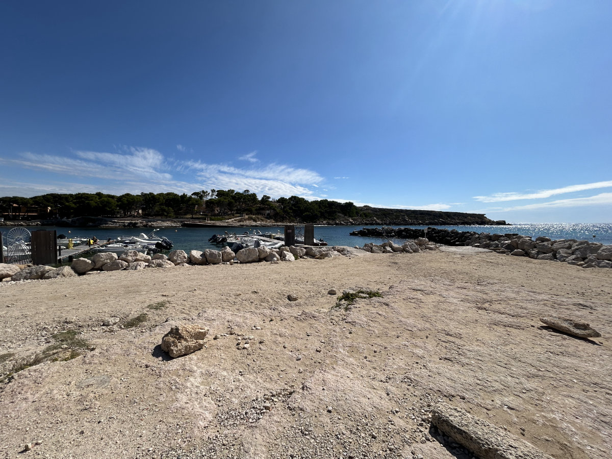 Wir folgen dem Weg von einer schönen Bucht in die andere, einige mit Sandstrand, einige mit Steinstrand, einige mit beidem. Das Wasser des Mittelmeers glitzert in der Sonne, sowohl im Hafen von Tamaris als auch in den Badebuchten ist das Wasser glasklar.