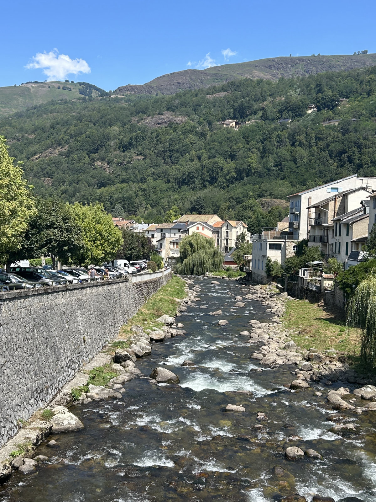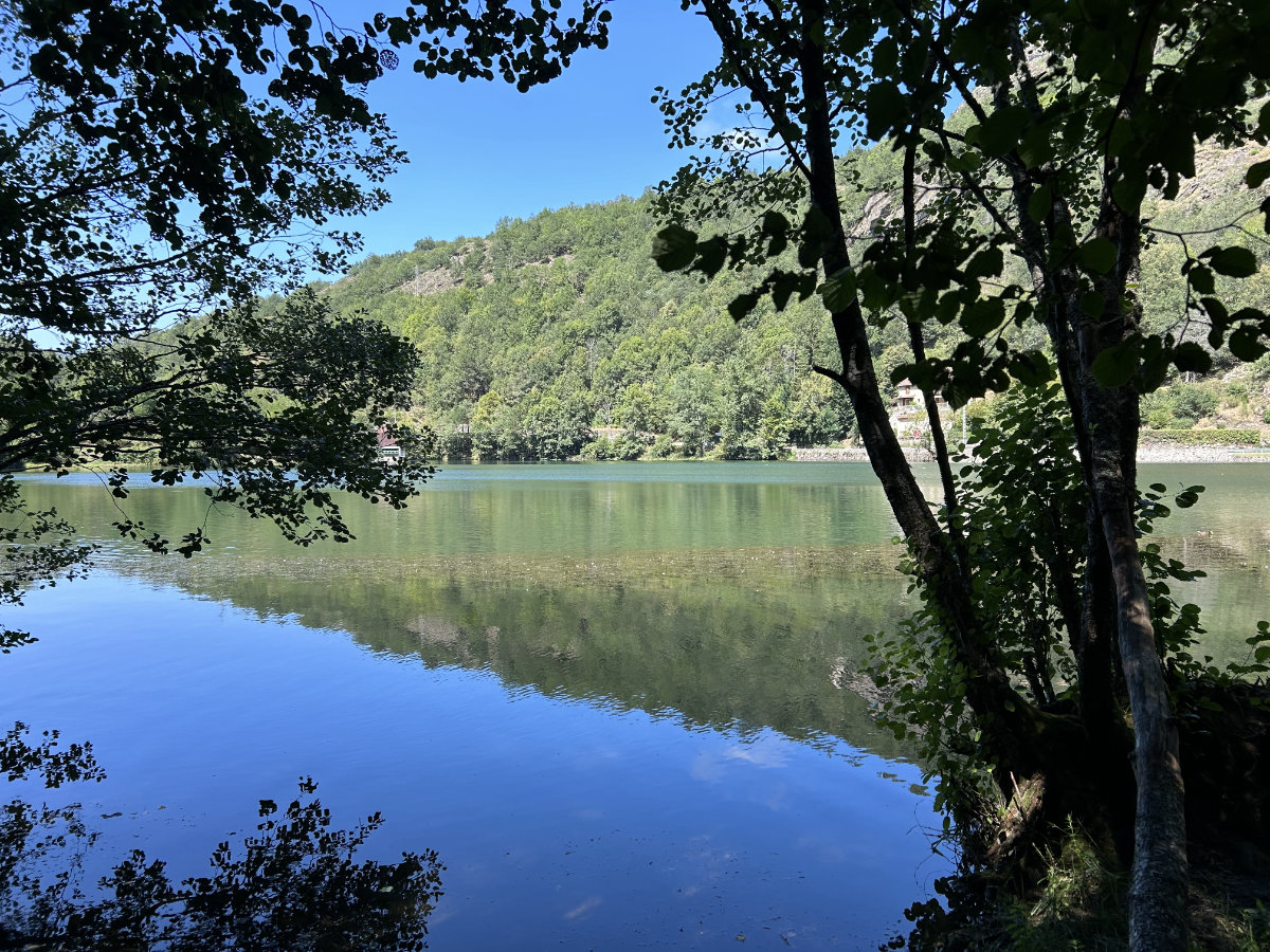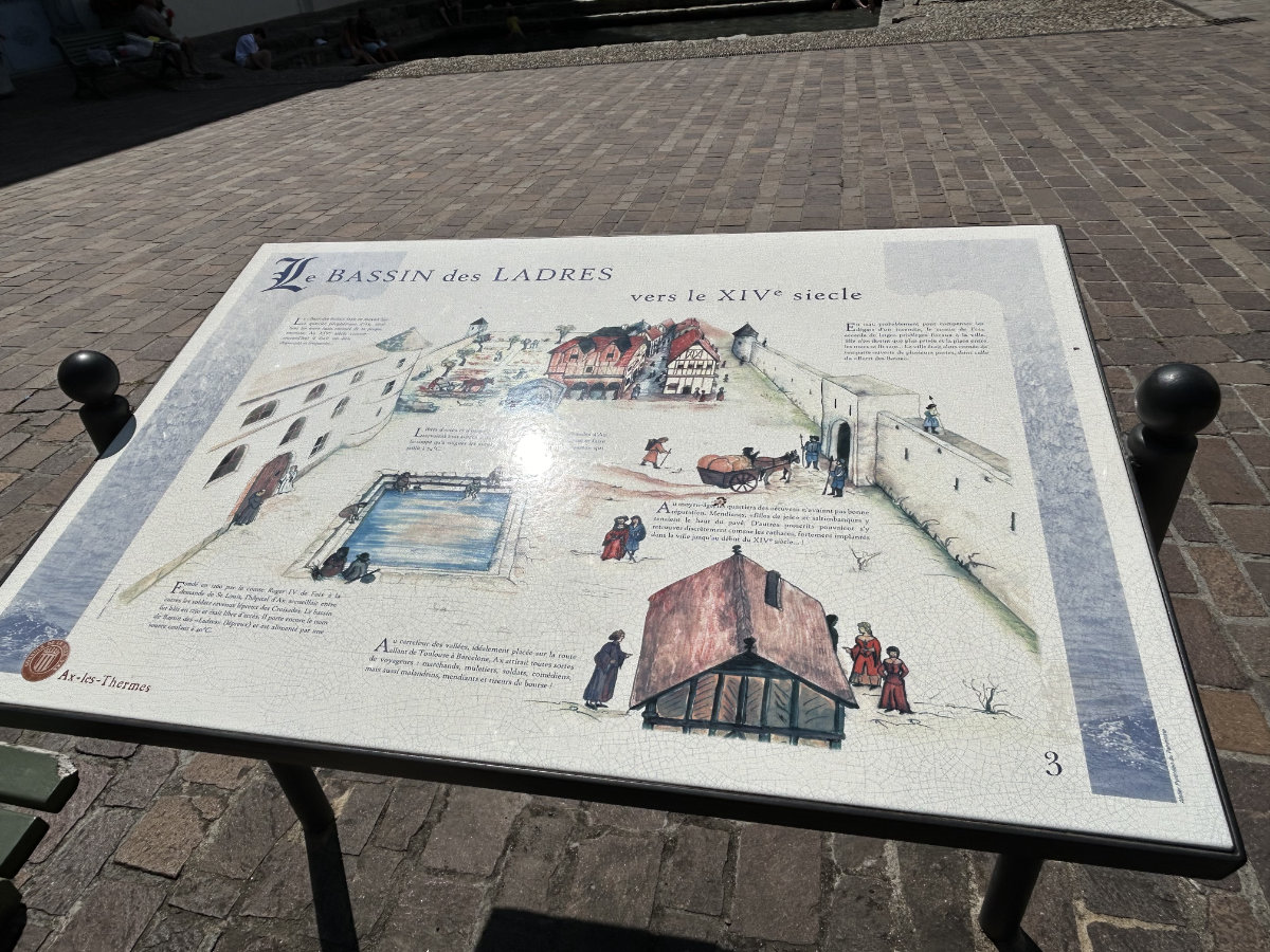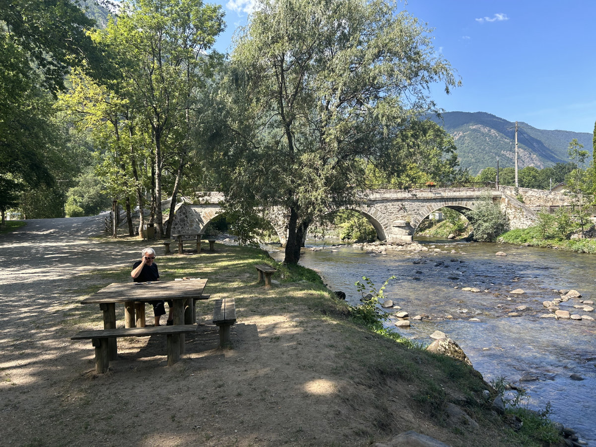 Auch heute startet unser Ausflug direkt vom Zeltplatz, die drei Weiher sind bis zum Rand mit Wasser gefüllt und die Ariège führt vielmehr Wasser als in den vergangenen Tagen, was sicher dem gestrigen Regen geschuldet ist. In Ax-les-Thermes angekommen beginnt der kurze aber steile Aufstieg und danach der Abstieg ins schöne Dorf Orgeix. Von dort wandern wir auf einem schönen Weg entlang der Oriège, die in Ax-les-Thermes in die Ariège mündet, durch den Wald am Lac de Campauleil vorbei zurück nach Ax-les-Thermes. Nachdem wir dort fein gegessen haben, ziehen wir die Schuhe aus und stecken die Füsse in eine heisse Quelle, die dort in einem schmucken, flachen Brunnen gefasst wird.