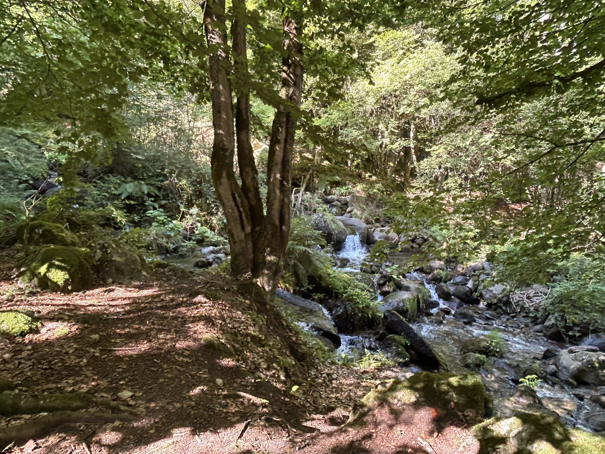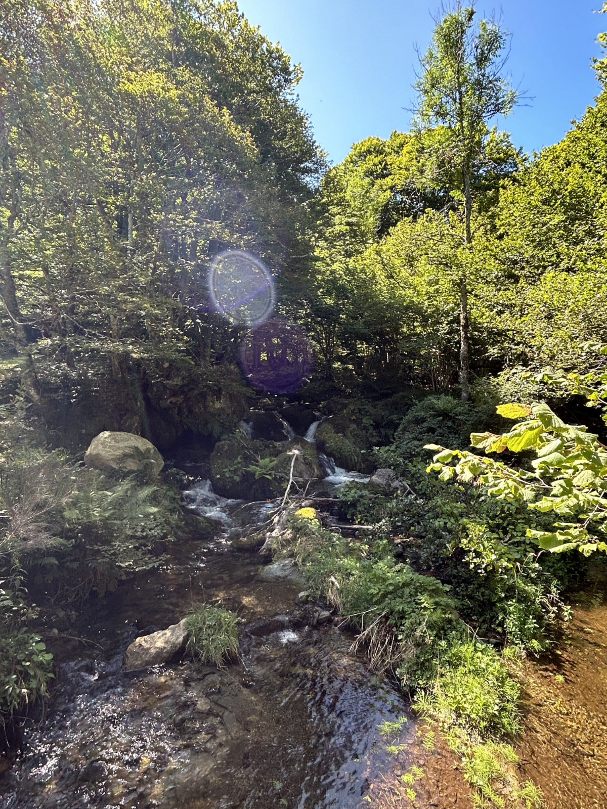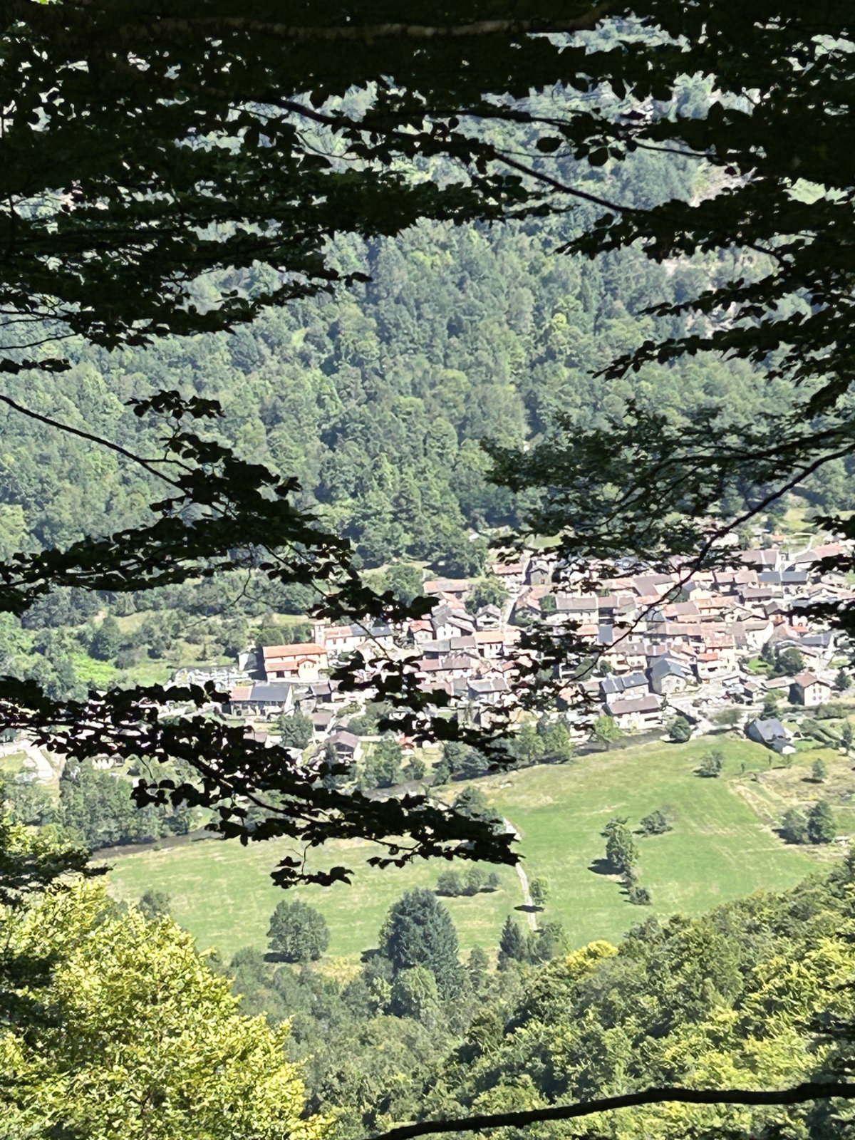 Auch heute startet unser Ausflug direkt vom Zeltplatz, die drei Weiher sind bis zum Rand mit Wasser gefüllt und die Ariège führt vielmehr Wasser als in den vergangenen Tagen, was sicher dem gestrigen Regen geschuldet ist. In Ax-les-Thermes angekommen beginnt der kurze aber steile Aufstieg und danach der Abstieg ins schöne Dorf Orgeix. Von dort wandern wir auf einem schönen Weg entlang der Oriège, die in Ax-les-Thermes in die Ariège mündet, durch den Wald am Lac de Campauleil vorbei zurück nach Ax-les-Thermes. Nachdem wir dort fein gegessen haben, ziehen wir die Schuhe aus und stecken die Füsse in eine heisse Quelle, die dort in einem schmucken, flachen Brunnen gefasst wird.