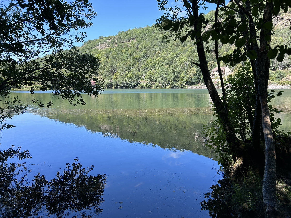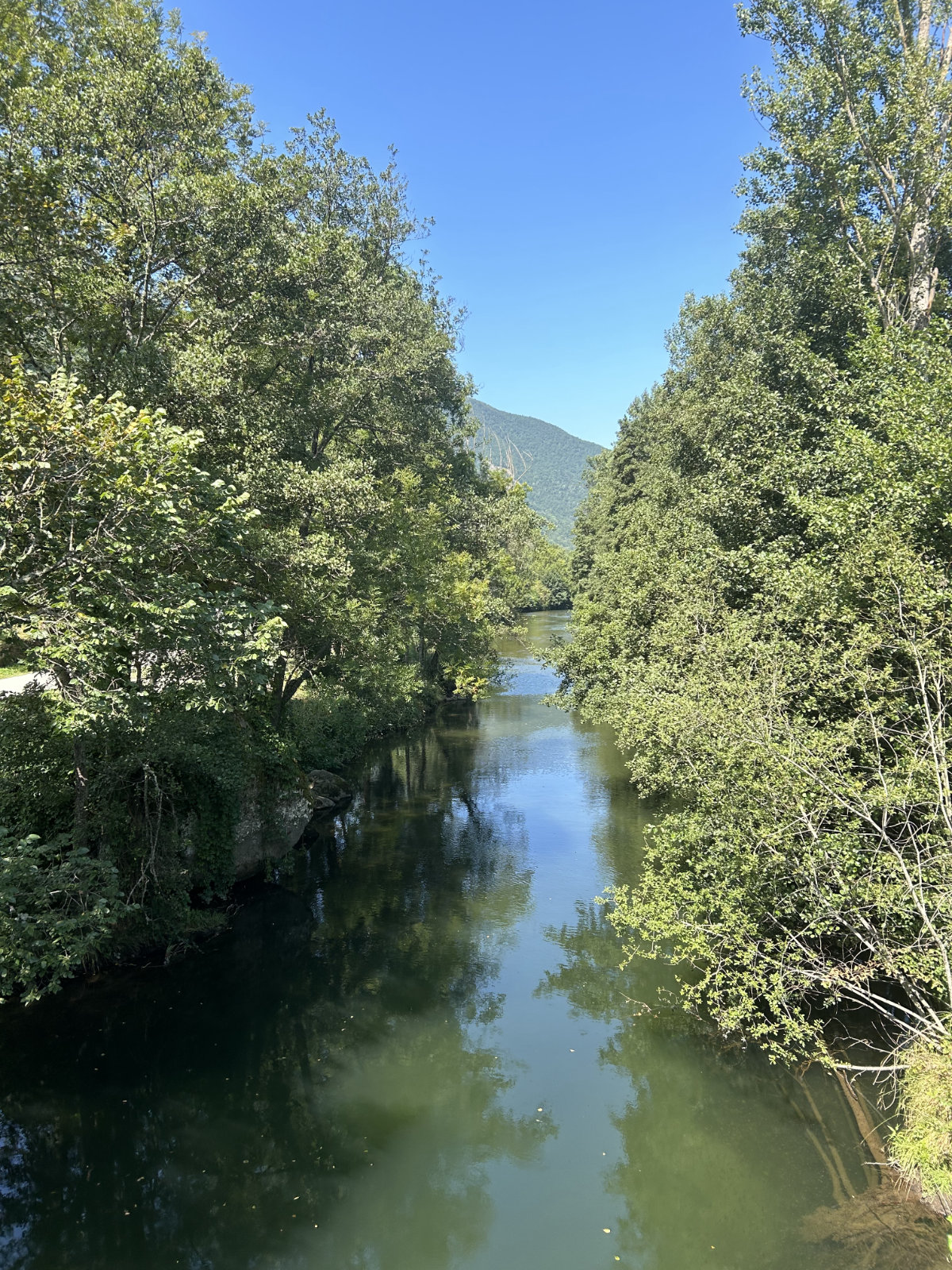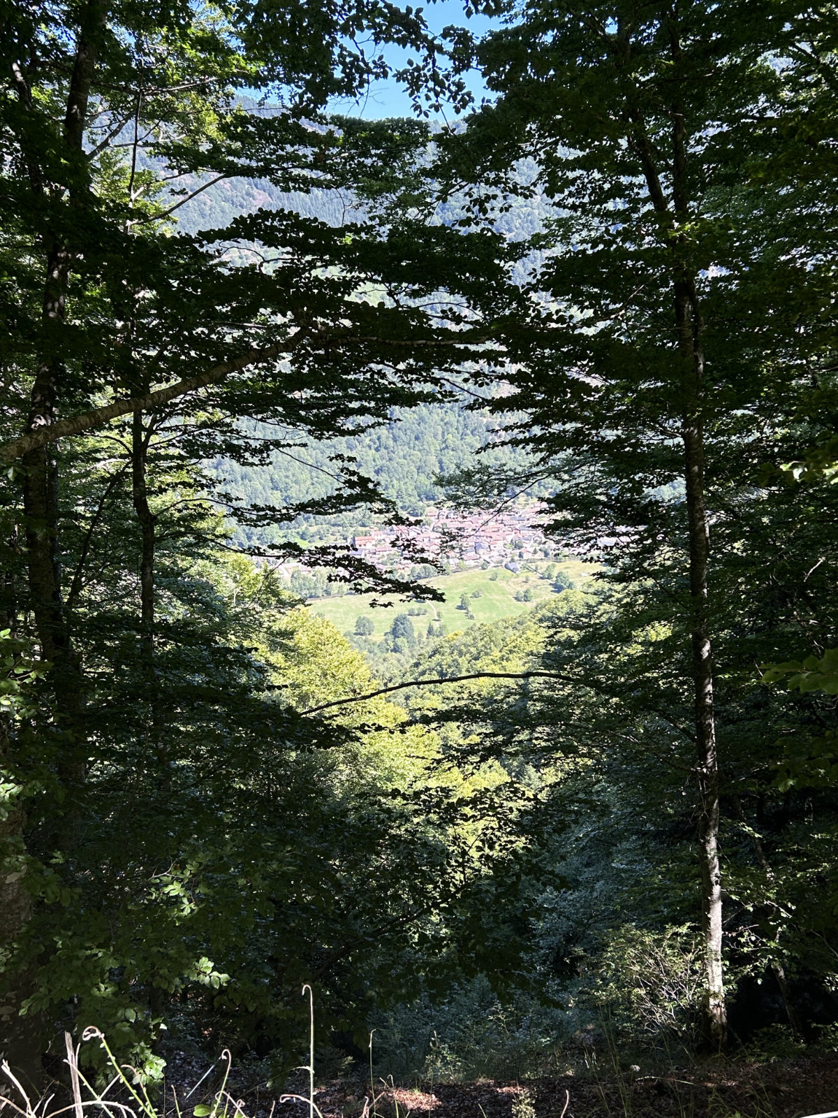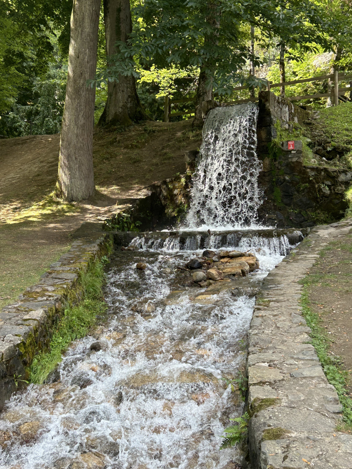 Auch heute startet unser Ausflug direkt vom Zeltplatz, die drei Weiher sind bis zum Rand mit Wasser gefüllt und die Ariège führt vielmehr Wasser als in den vergangenen Tagen, was sicher dem gestrigen Regen geschuldet ist. In Ax-les-Thermes angekommen beginnt der kurze aber steile Aufstieg und danach der Abstieg ins schöne Dorf Orgeix. Von dort wandern wir auf einem schönen Weg entlang der Oriège, die in Ax-les-Thermes in die Ariège mündet, durch den Wald am Lac de Campauleil vorbei zurück nach Ax-les-Thermes. Nachdem wir dort fein gegessen haben, ziehen wir die Schuhe aus und stecken die Füsse in eine heisse Quelle, die dort in einem schmucken, flachen Brunnen gefasst wird.