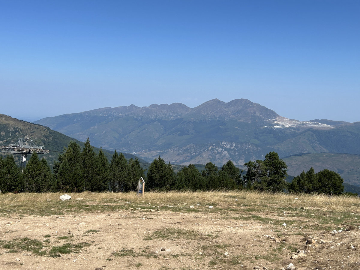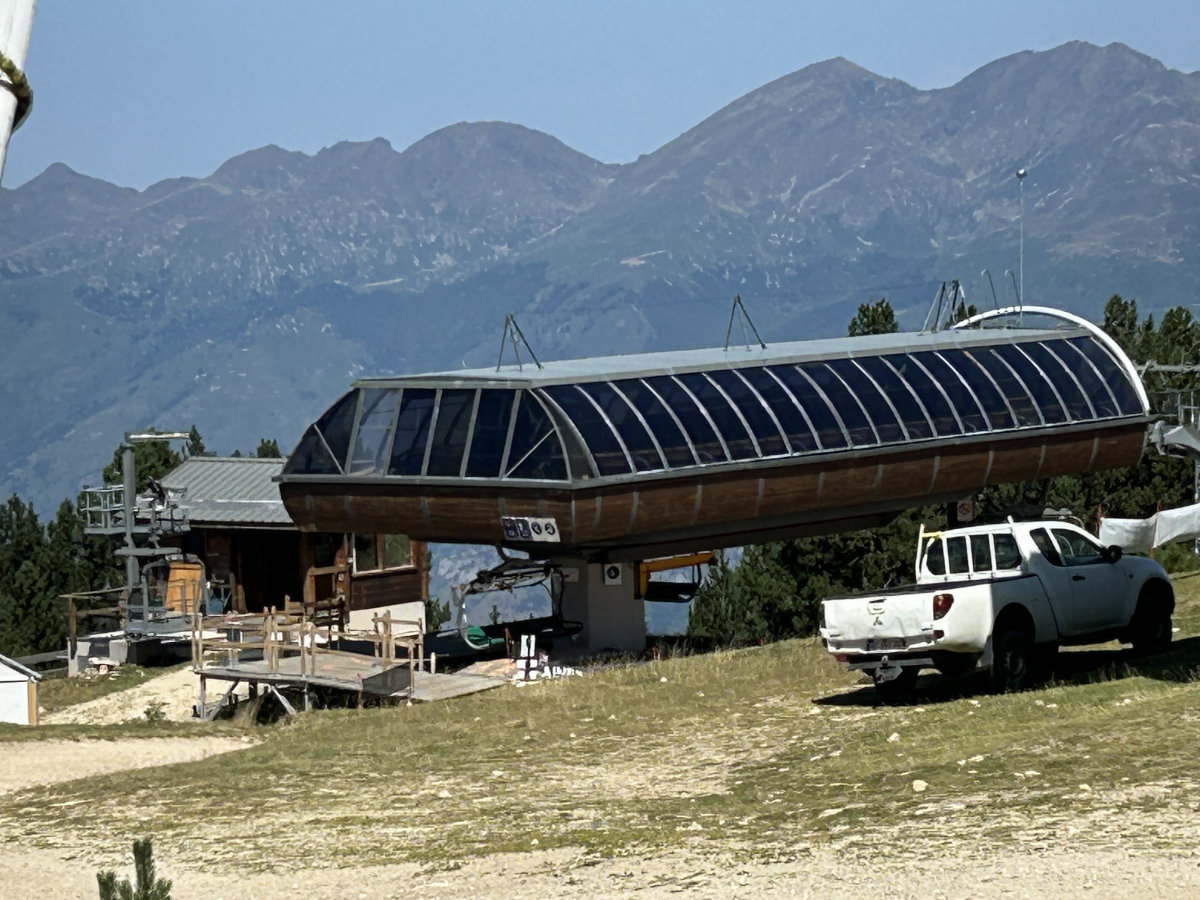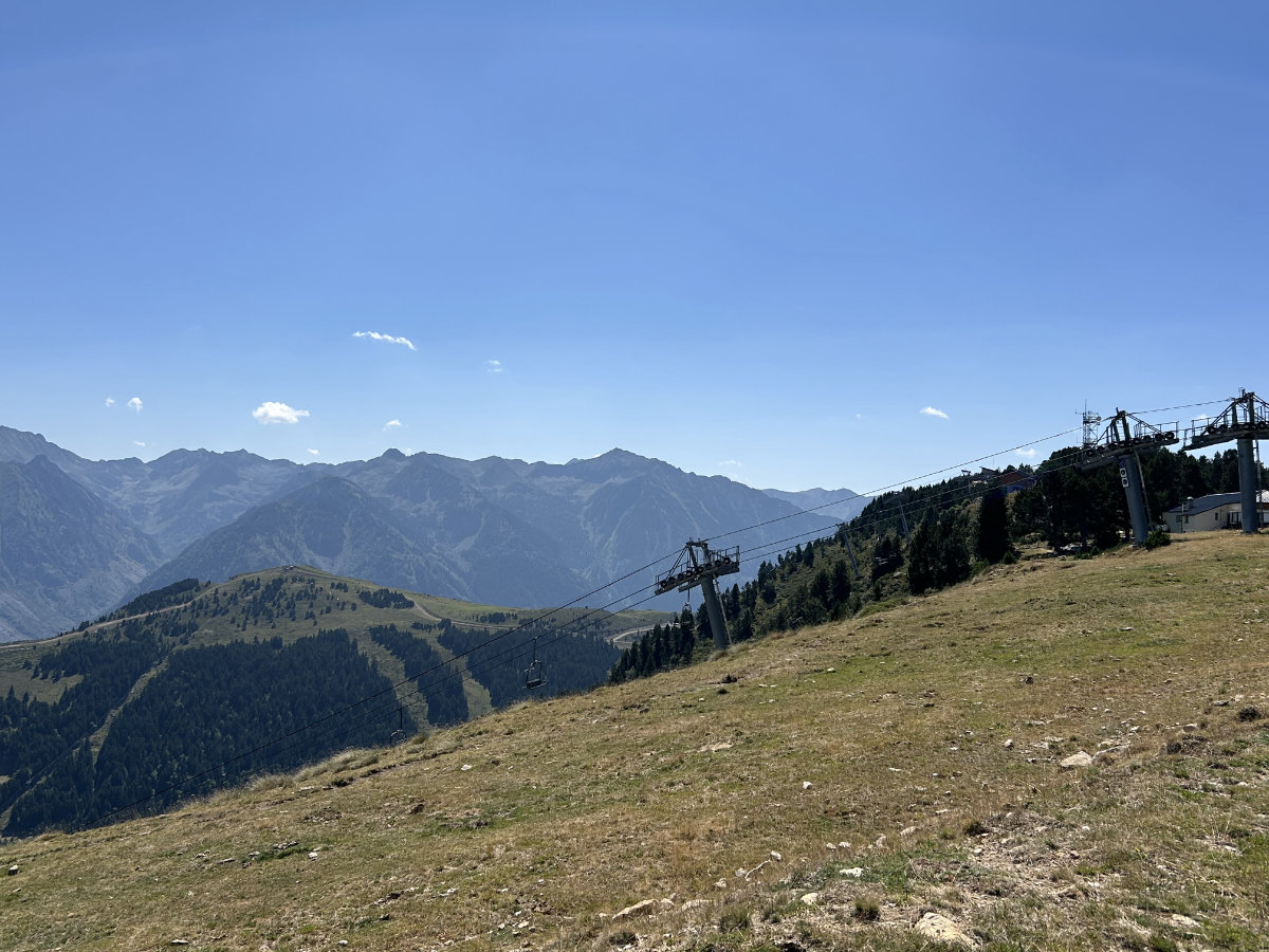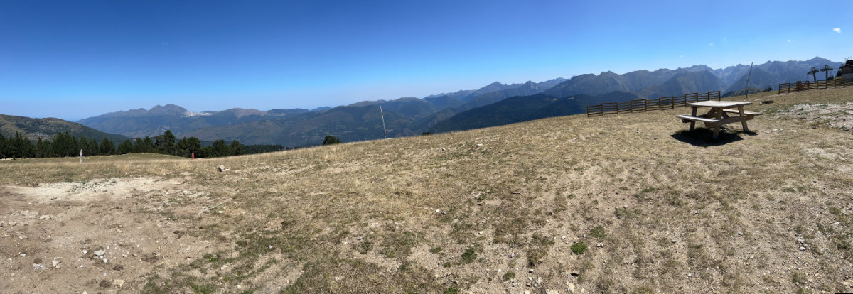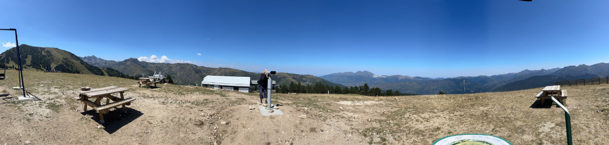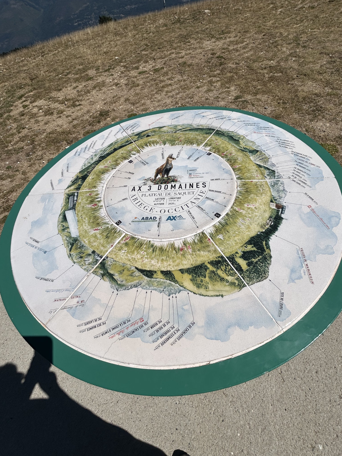 Wir benötigen knapp 40 Minuten, um auf schönen Wegen entlang der Ariège nach Ax-les-Thermes zu gelangen. Dort besteigen wir die Gondelbahn bis zum Plateau de Bonascre (1400m) und von dort mit dem Sessellift aufs Plateau de Saguet (2000m). Das Ticket für die Benutzung der Gondelbahn und des Sessellifts kostet 11 Euro pro Person. Ganz oben geniessen wir den Panoramablick auf die Berge der Pyrenäen. Mit dem im Boden einbetonierten grossen Fernglas würden wir die chinesische Mauer noch scharf zu sehen bekommen, nur die Erdkrümmung verhindert das. Die Sicht durchs Fernglas ist top, und – Sie ahnen es bereits, – genau, gratis!