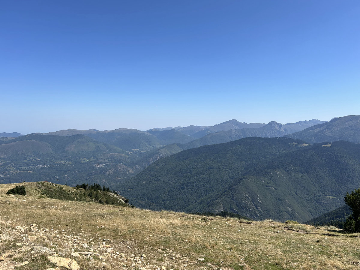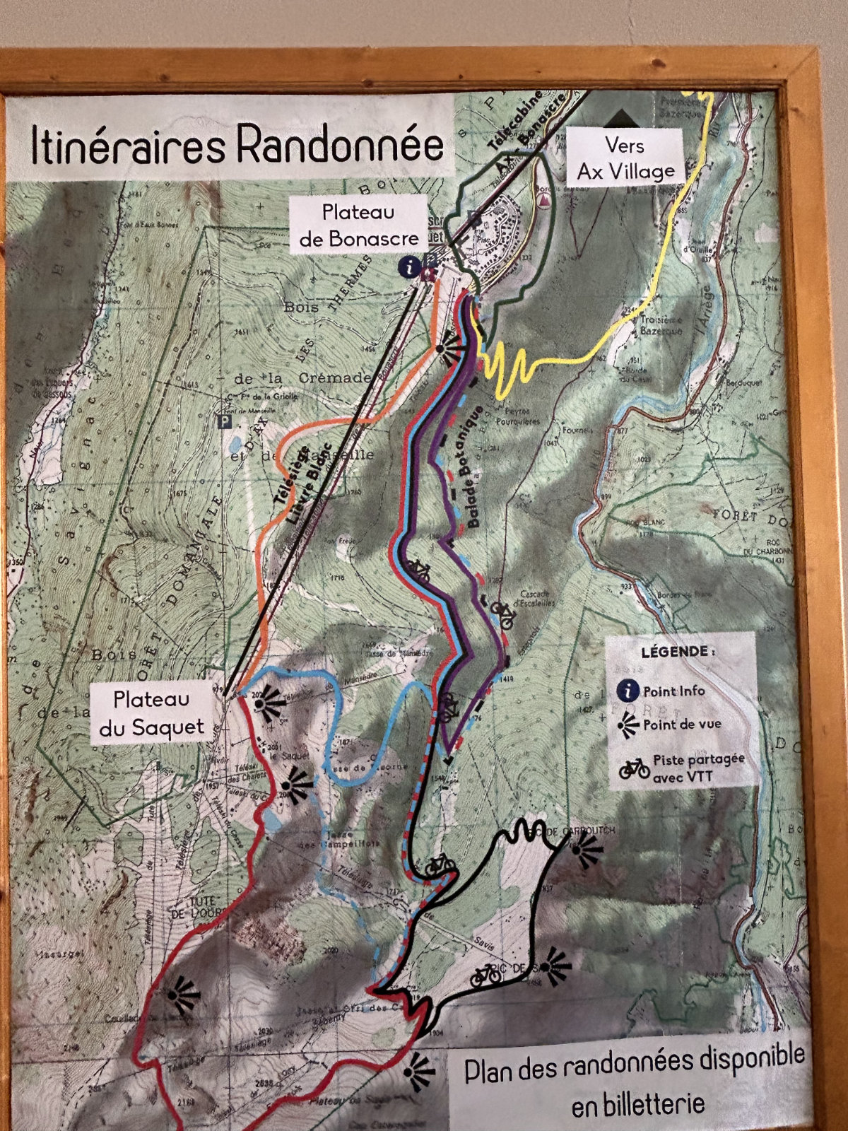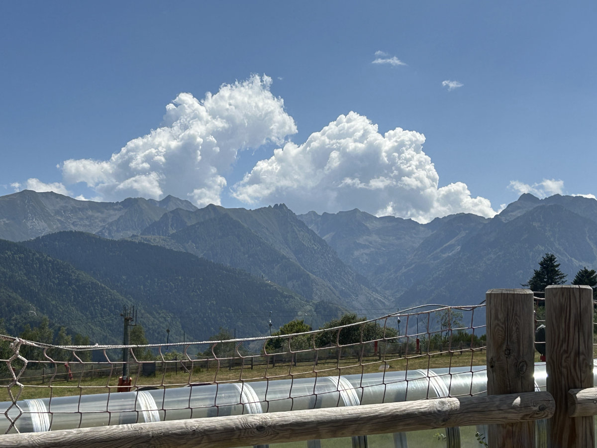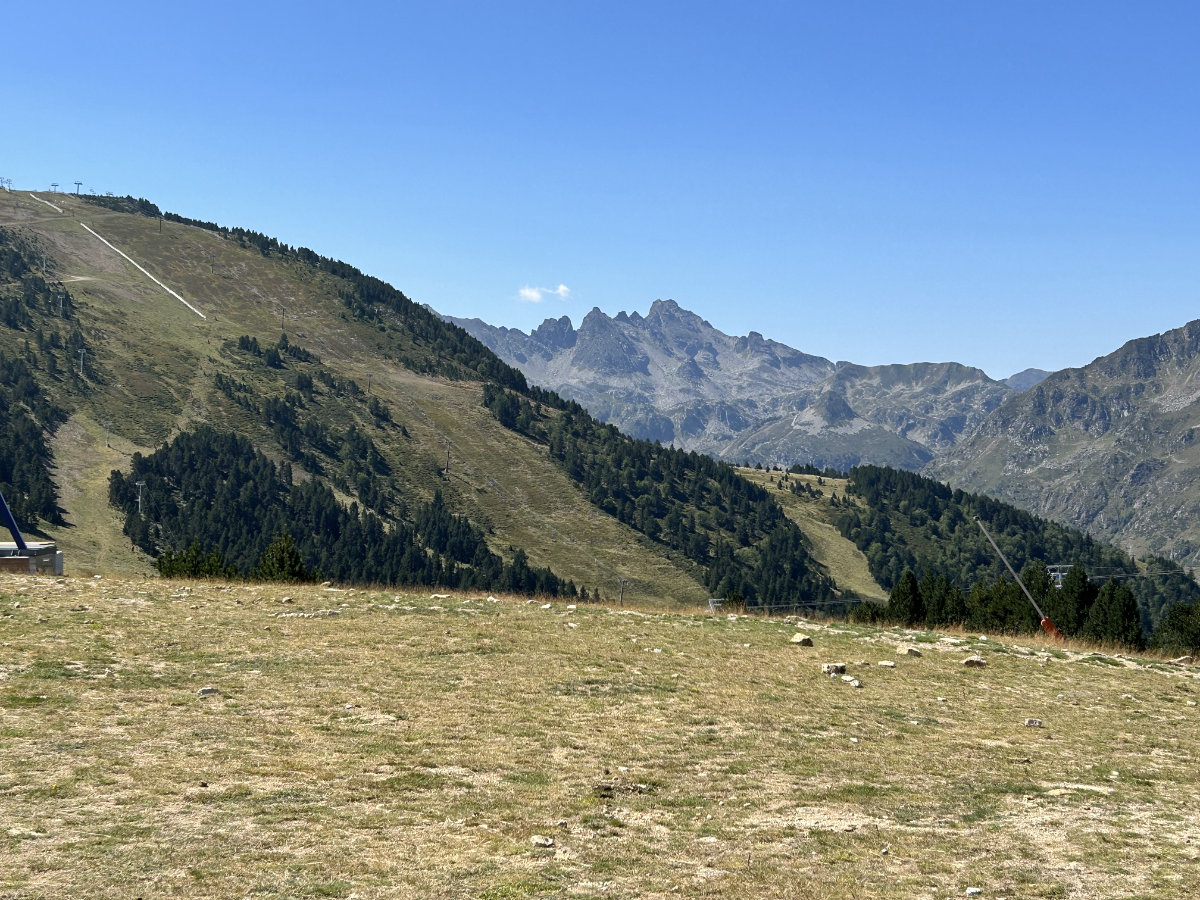 Wir benötigen knapp 40 Minuten, um auf schönen Wegen entlang der Ariège nach Ax-les-Thermes zu gelangen. Dort besteigen wir die Gondelbahn bis zum Plateau de Bonascre (1400m) und von dort mit dem Sessellift aufs Plateau de Saguet (2000m). Das Ticket für die Benutzung der Gondelbahn und des Sessellifts kostet 11 Euro pro Person. Ganz oben geniessen wir den Panoramablick auf die Berge der Pyrenäen. Mit dem im Boden einbetonierten grossen Fernglas würden wir die chinesische Mauer noch scharf zu sehen bekommen, nur die Erdkrümmung verhindert das. Die Sicht durchs Fernglas ist top, und – Sie ahnen es bereits, – genau, gratis!