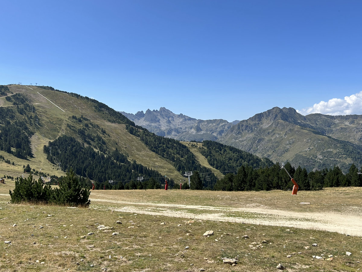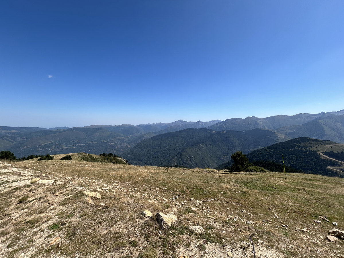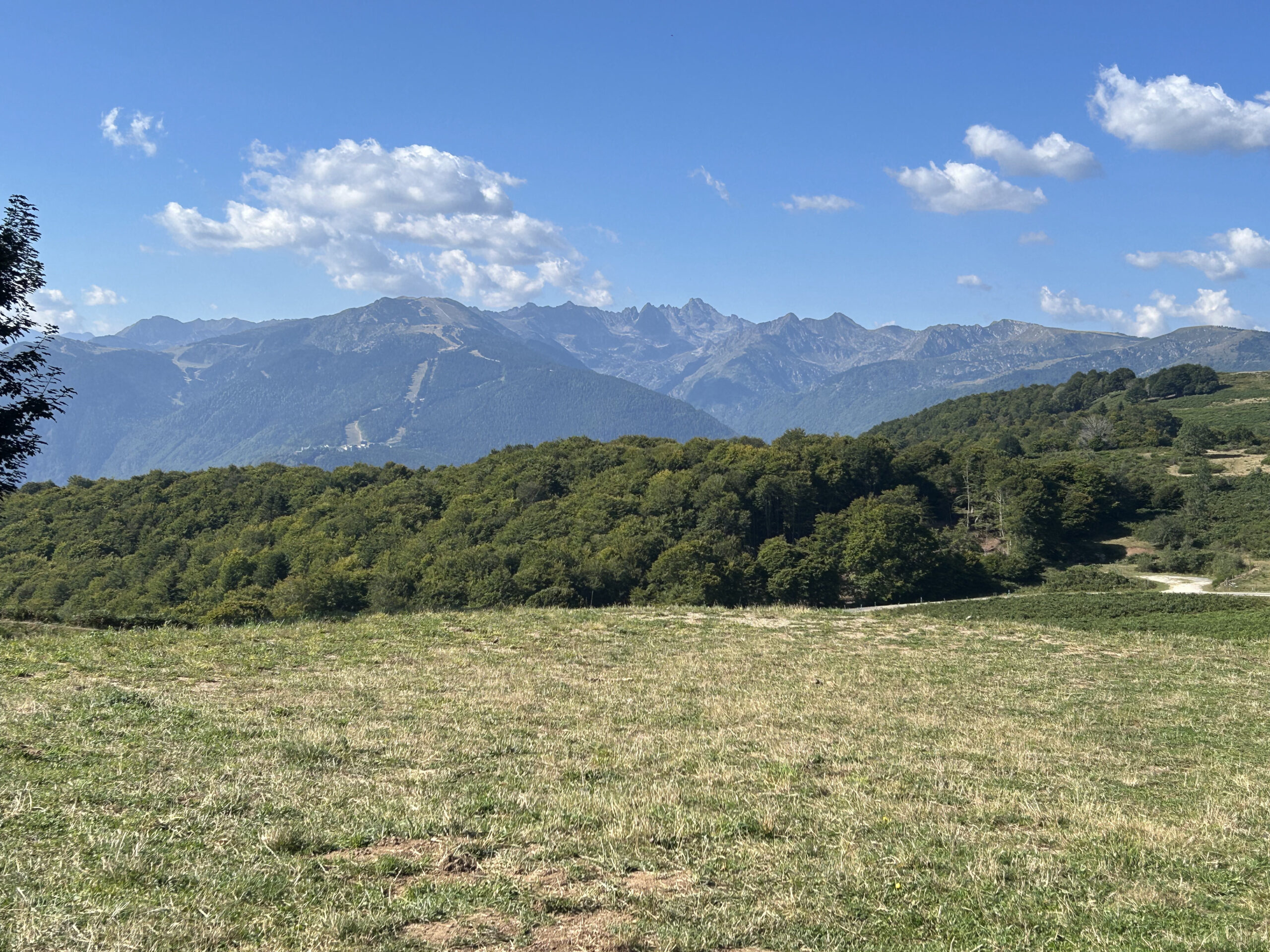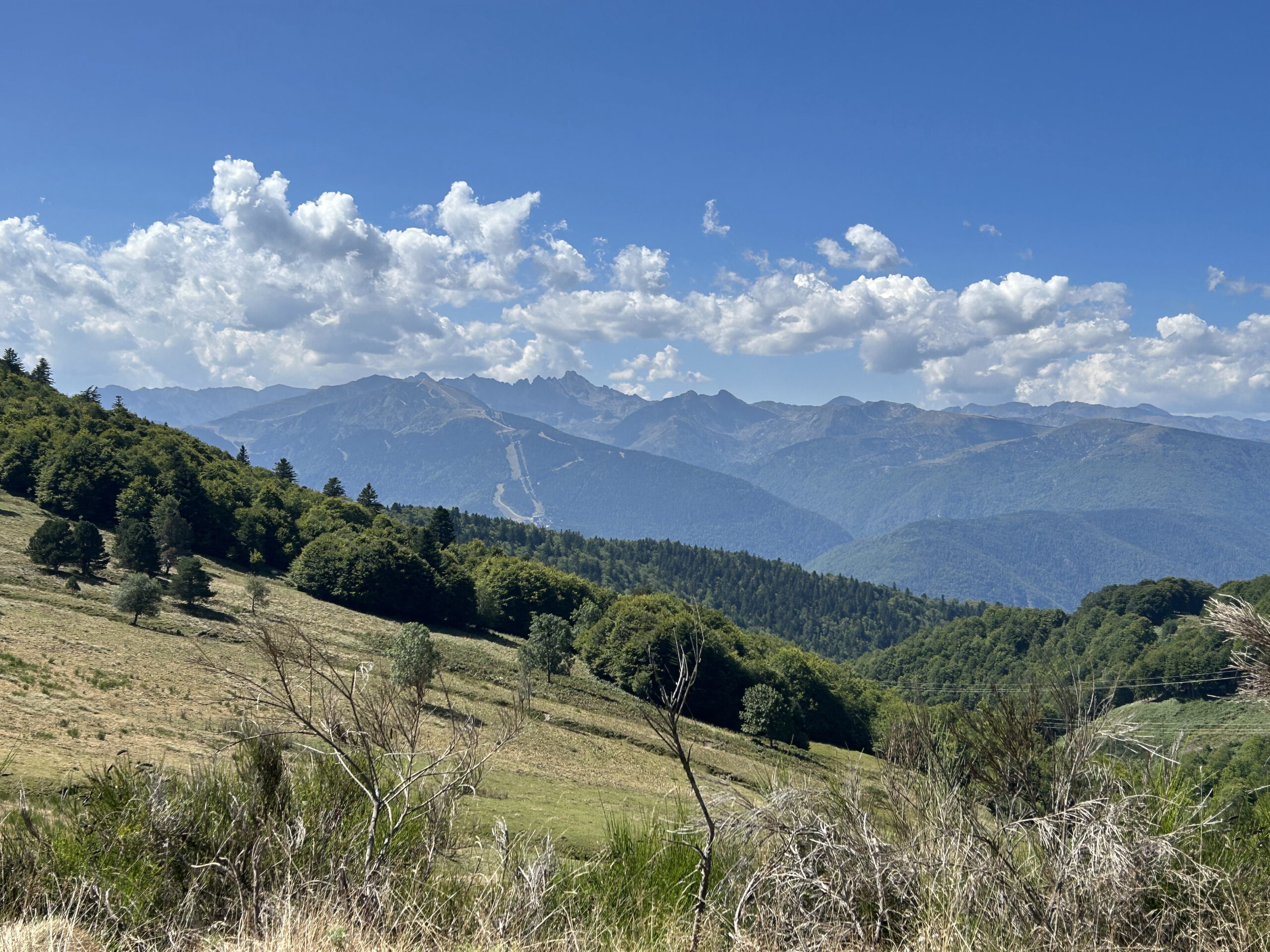 Wir benötigen knapp 40 Minuten, um auf schönen Wegen entlang der Ariège nach Ax-les-Thermes zu gelangen. Dort besteigen wir die Gondelbahn bis zum Plateau de Bonascre (1400m) und von dort mit dem Sessellift aufs Plateau de Saguet (2000m). Das Ticket für die Benutzung der Gondelbahn und des Sessellifts kostet 11 Euro pro Person. Ganz oben geniessen wir den Panoramablick auf die Berge der Pyrenäen. Mit dem im Boden einbetonierten grossen Fernglas würden wir die chinesische Mauer noch scharf zu sehen bekommen, nur die Erdkrümmung verhindert das. Die Sicht durchs Fernglas ist top, und – Sie ahnen es bereits, – genau, gratis!