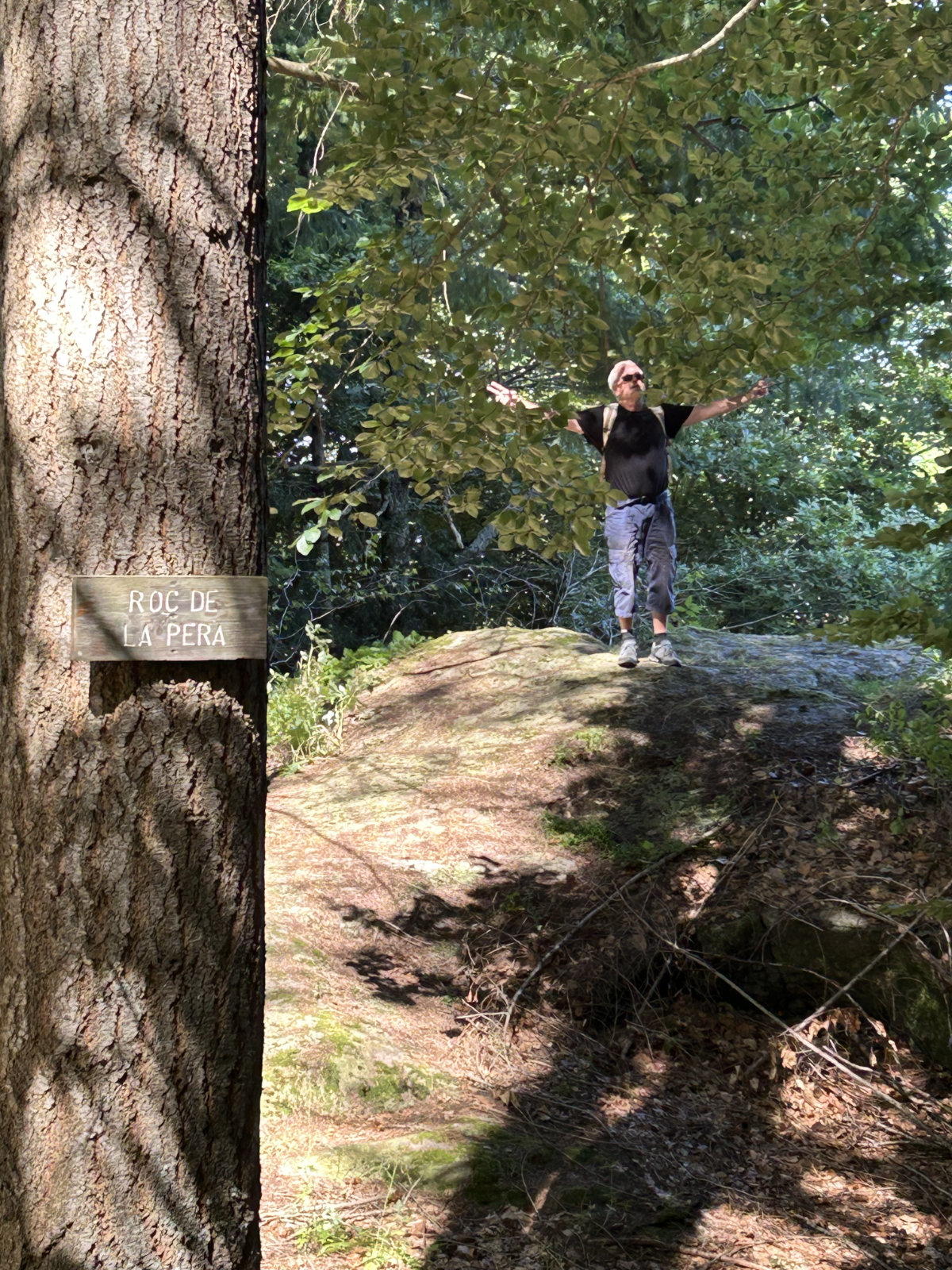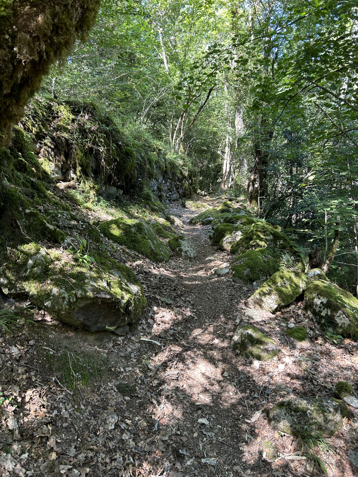 Unsere heutige Wanderung startet knapp 8 Kilometer von unserem Zeltplatz entfernt im Dorf Orlu. Der schmale Weg zwischen moosbewachsenen Felsen und Steinen führt uns steil durch den Wald hoch zum Roc de la Pera. Von dort gehts auf einem breiten Weg in weitem Bogen sanft aber stetig bergab ins Tal, dort folgen wir der Oriège zurück nach Orlu.