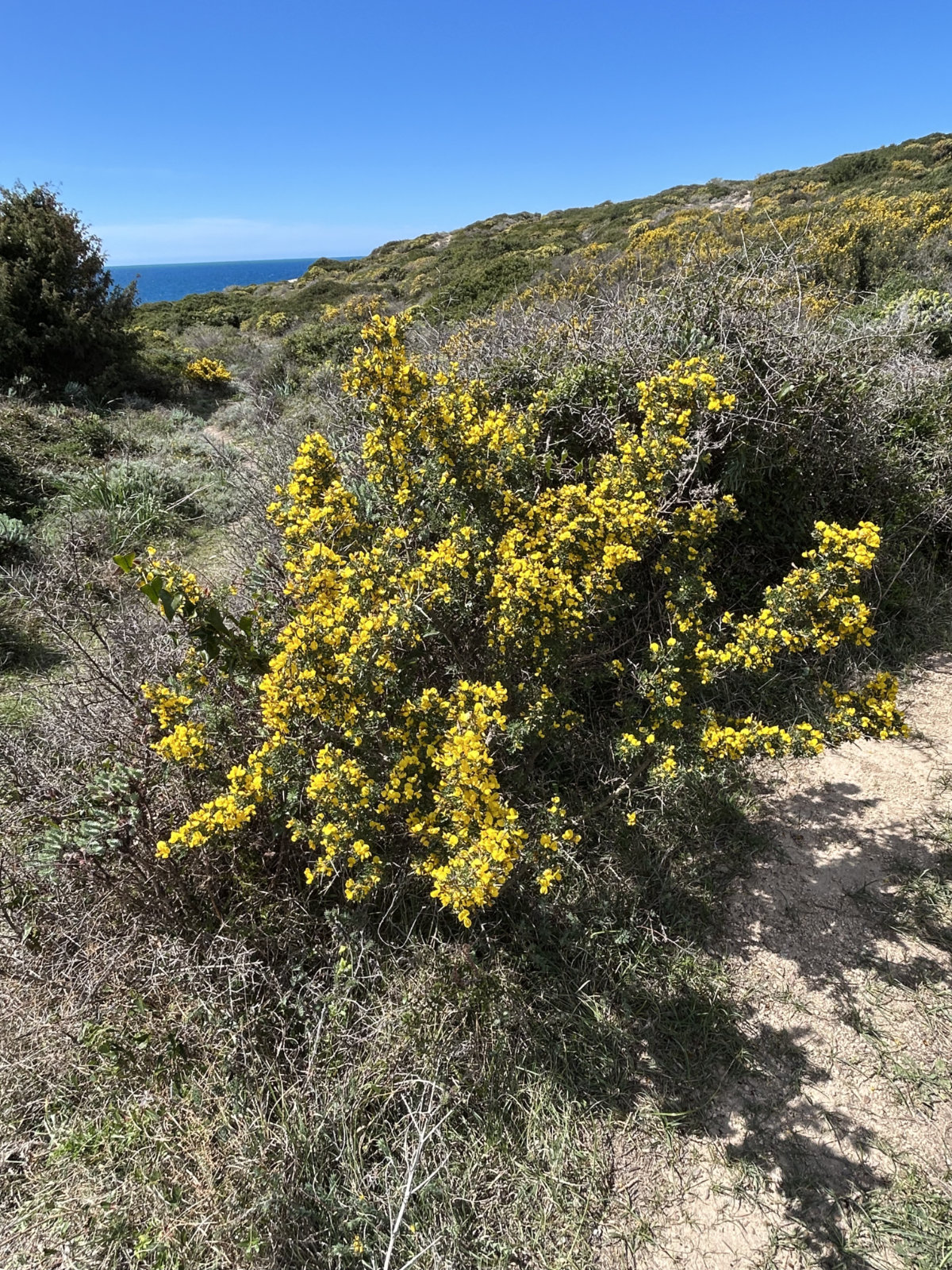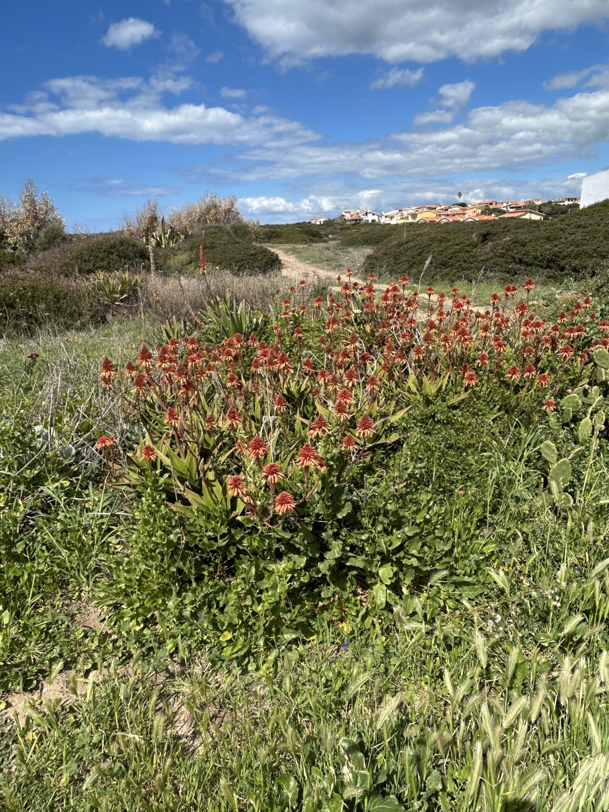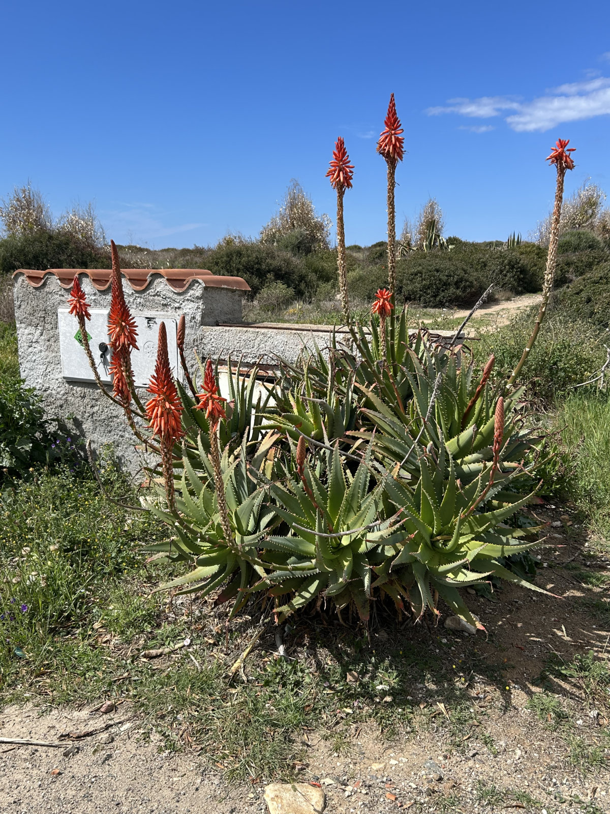 Unsere Wanderung führt uns durch die Macchia, ein für den Mittelmeerraum charakteristisches immergrünes niedriges Gehölz, das im Frühjahr in voller Pracht erblüht und sich vom Meer bis zu den Hügeln im Landesinneren erstreckt. Das dunkelgrüne Buschwerk besteht aus zahlreichen Pflanzenarten, im Mai wird die Macchia in voller Pracht erblühen, dennoch sind schon jetzt viele Farben von blühenden Pflanzen und Blumen auszumachen. Auch die Feigenkakteen oder Aloas sind vertreten, aber wie viele Pflanzen der Macchia erreichen sie nur eine geringe Wuchshöhe.