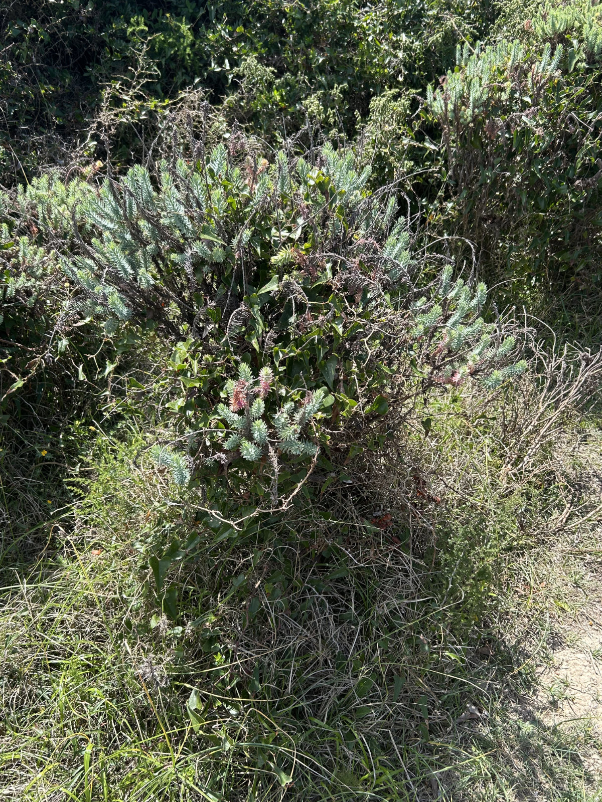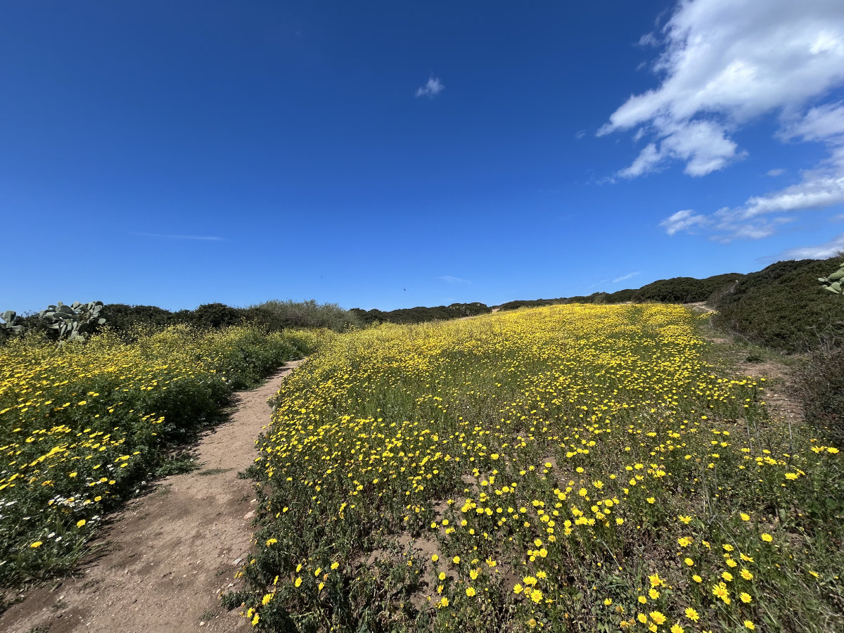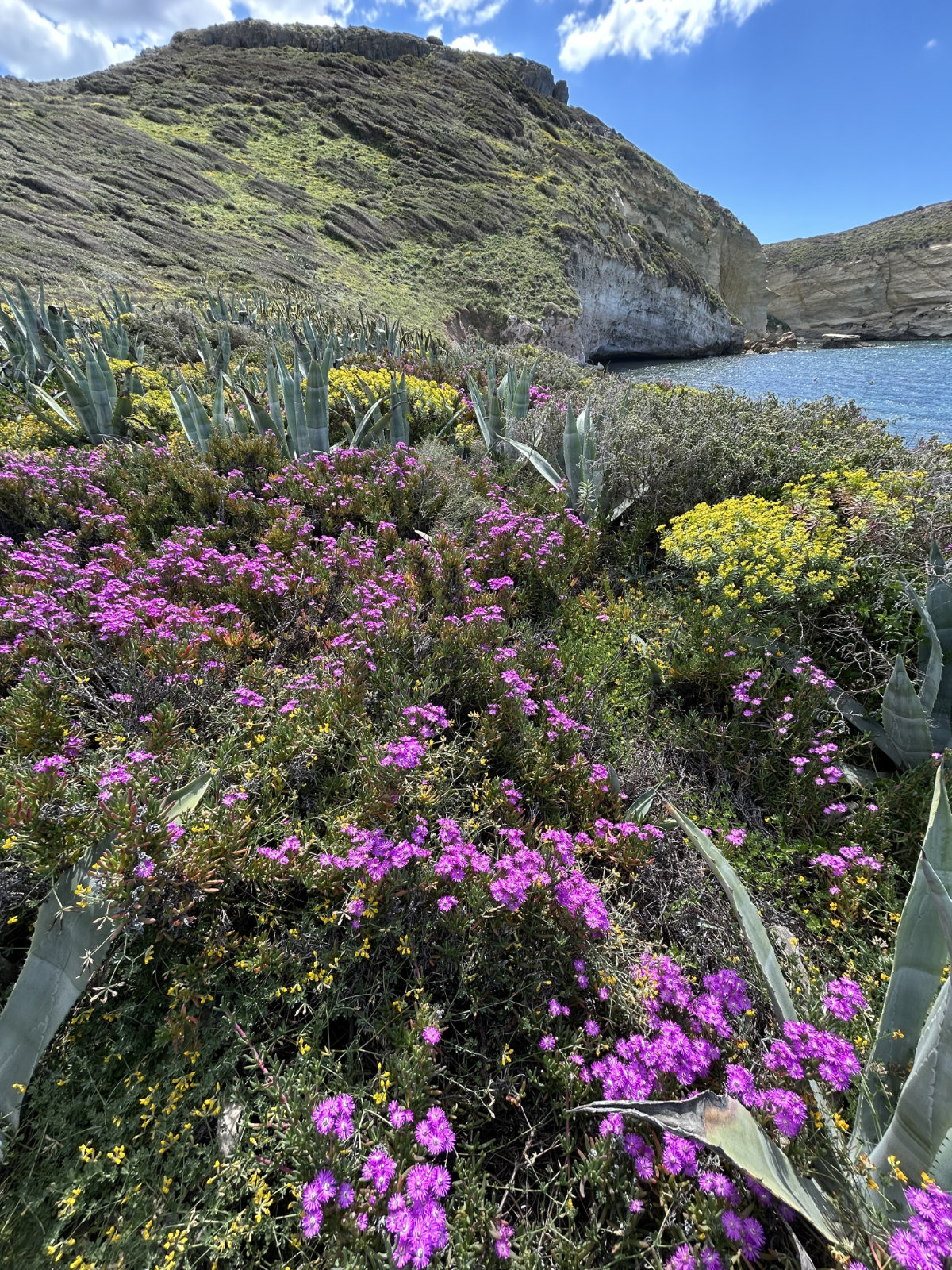 Unsere Wanderung führt uns durch die Macchia, ein für den Mittelmeerraum charakteristisches immergrünes niedriges Gehölz, das im Frühjahr in voller Pracht erblüht und sich vom Meer bis zu den Hügeln im Landesinneren erstreckt. Das dunkelgrüne Buschwerk besteht aus zahlreichen Pflanzenarten, im Mai wird die Macchia in voller Pracht erblühen, dennoch sind schon jetzt viele Farben von blühenden Pflanzen und Blumen auszumachen. Auch die Feigenkakteen oder Aloas sind vertreten, aber wie viele Pflanzen der Macchia erreichen sie nur eine geringe Wuchshöhe.