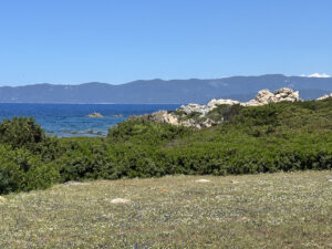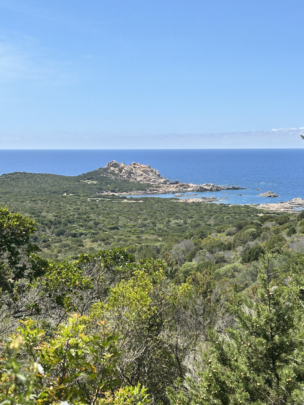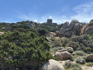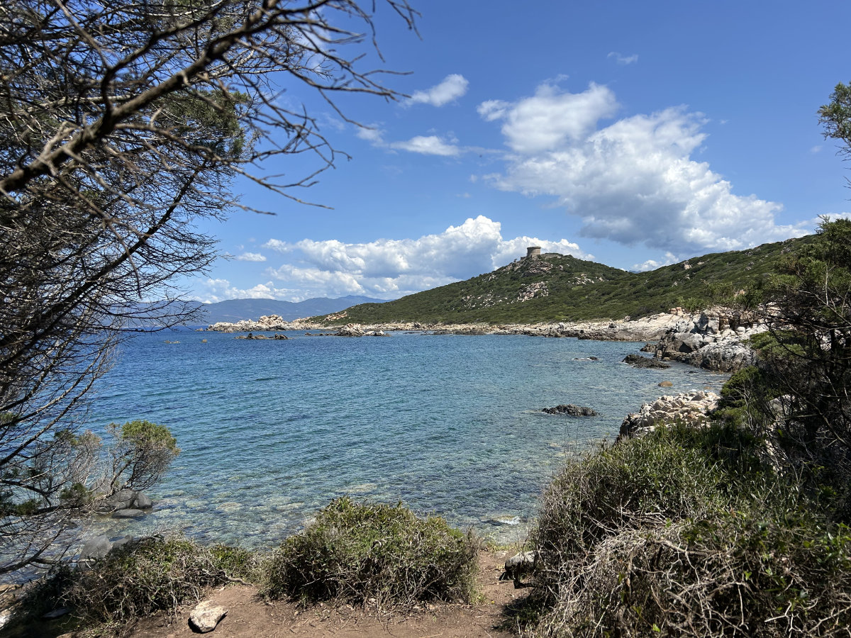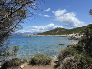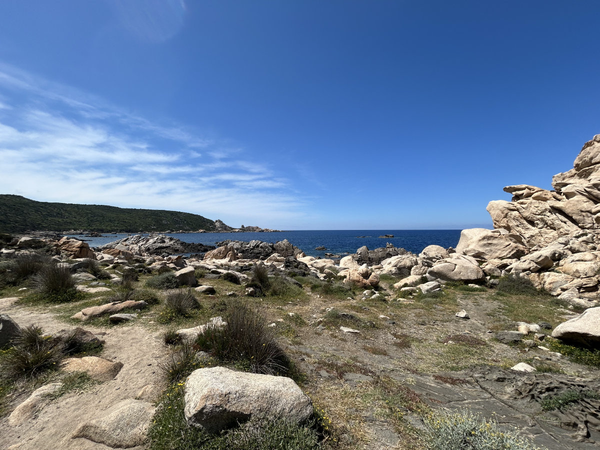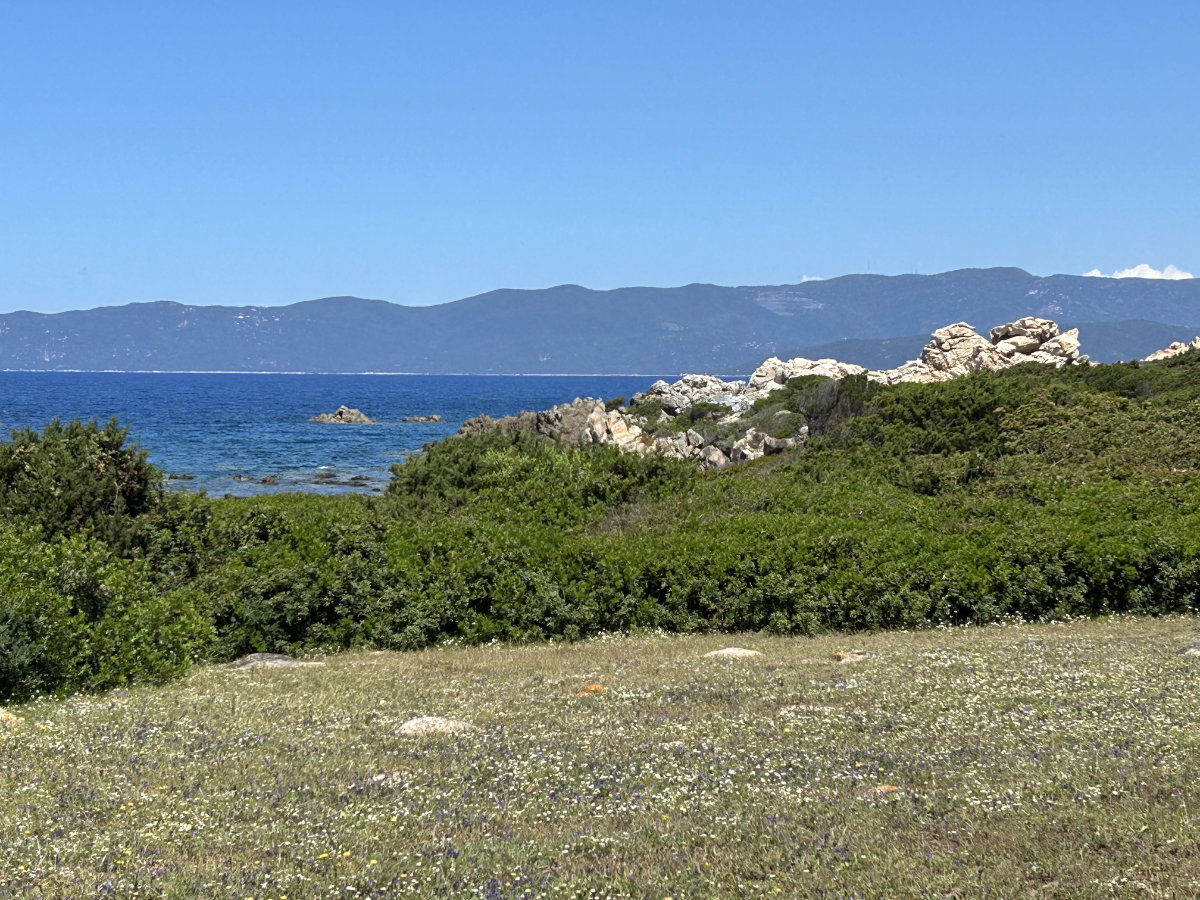 Sagenhaft schöne Wanderung von Campomoro vorbei an einem der besterhaltenen Genuesertürmen (Tour de Campomoro) auf Korsika und mit Blick auf den wunderbaren Küstenverlauf. Wir sind hier nicht so stark zwischen steilen Felsen eingekesselt wie in Porto, auf der weiten Ebene vom Strand bis zu den sanften Hügeln, breitet sich die Macchia aus. Wir gehen über blühende Wiesen, vorbei an sonderbaren Kalksteinformationen am Strand und solchen, die aus dem Meer ragen. Der gut begehbare Pfad führt uns sanft rauf und runter. Wir drehen ab ins Landesinnere und erklimmen einen Hang, die Macchia reicht uns von der Hüfte bis über den Kopf, es gibt schattige Abschitte und sonnige, mit herrlichen Aussichten hinunter auf das grosse Blau, das sich heute in seiner schönsten Farbe präsentiert. Wir folgen dem Höhenrücken zurück nach Campomoro. Ich wünschte unterwegs, eine Stunde würde so lange dauern wie ein Tag. Anstrengend an dieser Tour ist nicht die Wanderung an und für sich, sondern der Versuch, die Schönheit dieses Fleckchens Erde mit allen Sinnen zu verinnerlichen und für immer einzuprägen! Und das Tüpfelchen auf dem i? Meine bezaubernde Lebensgefährtin, die mich auf allen Wegen begleitet. Ich bin im Paradies.