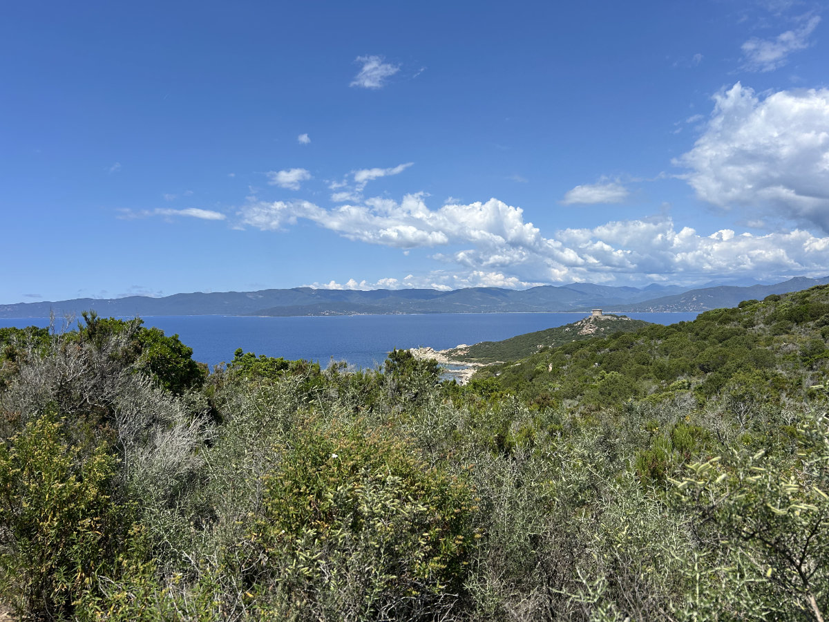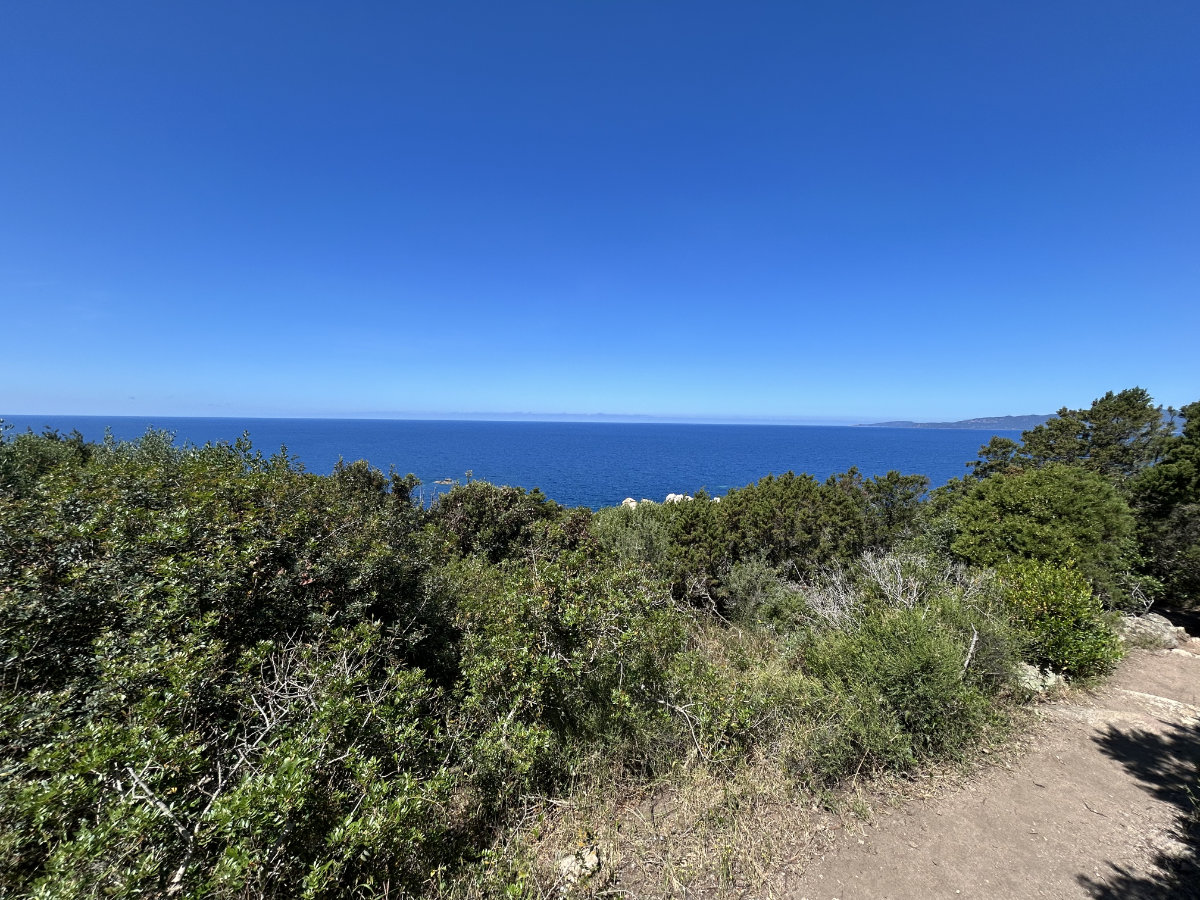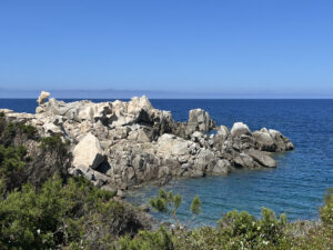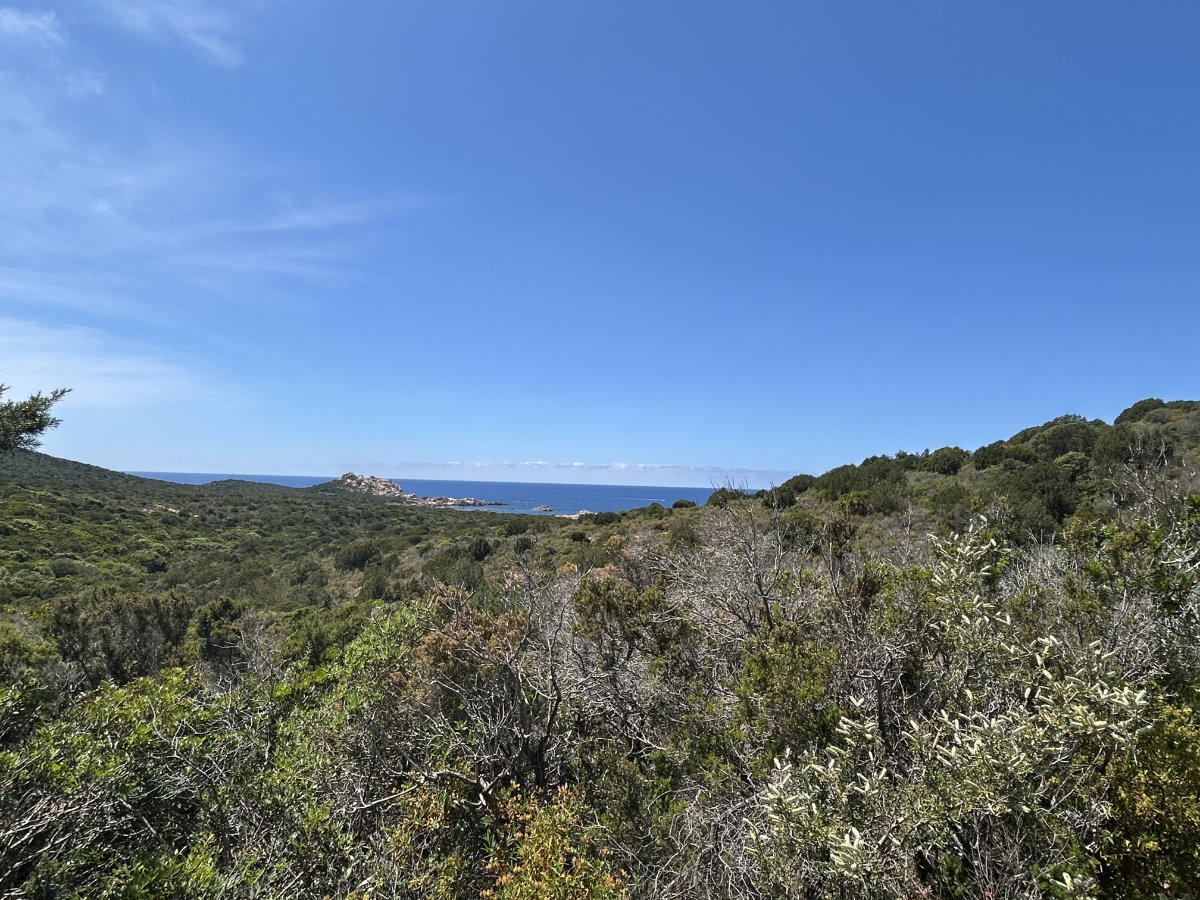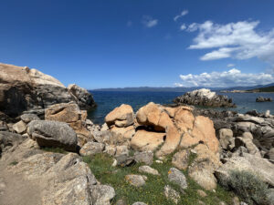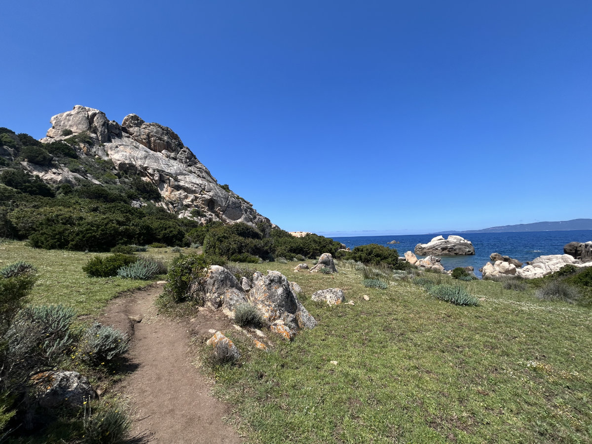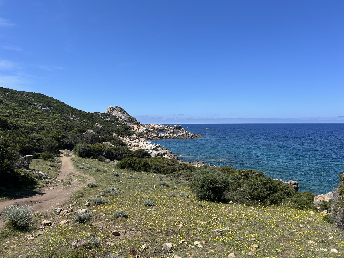 Sagenhaft schöne Wanderung von Campomoro vorbei an einem der besterhaltenen Genuesertürmen (Tour de Campomoro) auf Korsika und mit Blick auf den wunderbaren Küstenverlauf. Wir sind hier nicht so stark zwischen steilen Felsen eingekesselt wie in Porto, auf der weiten Ebene vom Strand bis zu den sanften Hügeln, breitet sich die Macchia aus. Wir gehen über blühende Wiesen, vorbei an sonderbaren Kalksteinformationen am Strand und solchen, die aus dem Meer ragen. Der gut begehbare Pfad führt uns sanft rauf und runter. Wir drehen ab ins Landesinnere und erklimmen einen Hang, die Macchia reicht uns von der Hüfte bis über den Kopf, es gibt schattige Abschitte und sonnige, mit herrlichen Aussichten hinunter auf das grosse Blau, das sich heute in seiner schönsten Farbe präsentiert. Wir folgen dem Höhenrücken zurück nach Campomoro. Ich wünschte unterwegs, eine Stunde würde so lange dauern wie ein Tag. Anstrengend an dieser Tour ist nicht die Wanderung an und für sich, sondern der Versuch, die Schönheit dieses Fleckchens Erde mit allen Sinnen zu verinnerlichen und für immer einzuprägen! Und das Tüpfelchen auf dem i? Meine bezaubernde Lebensgefährtin, die mich auf allen Wegen begleitet. Ich bin im Paradies.