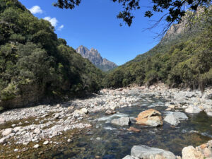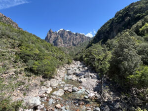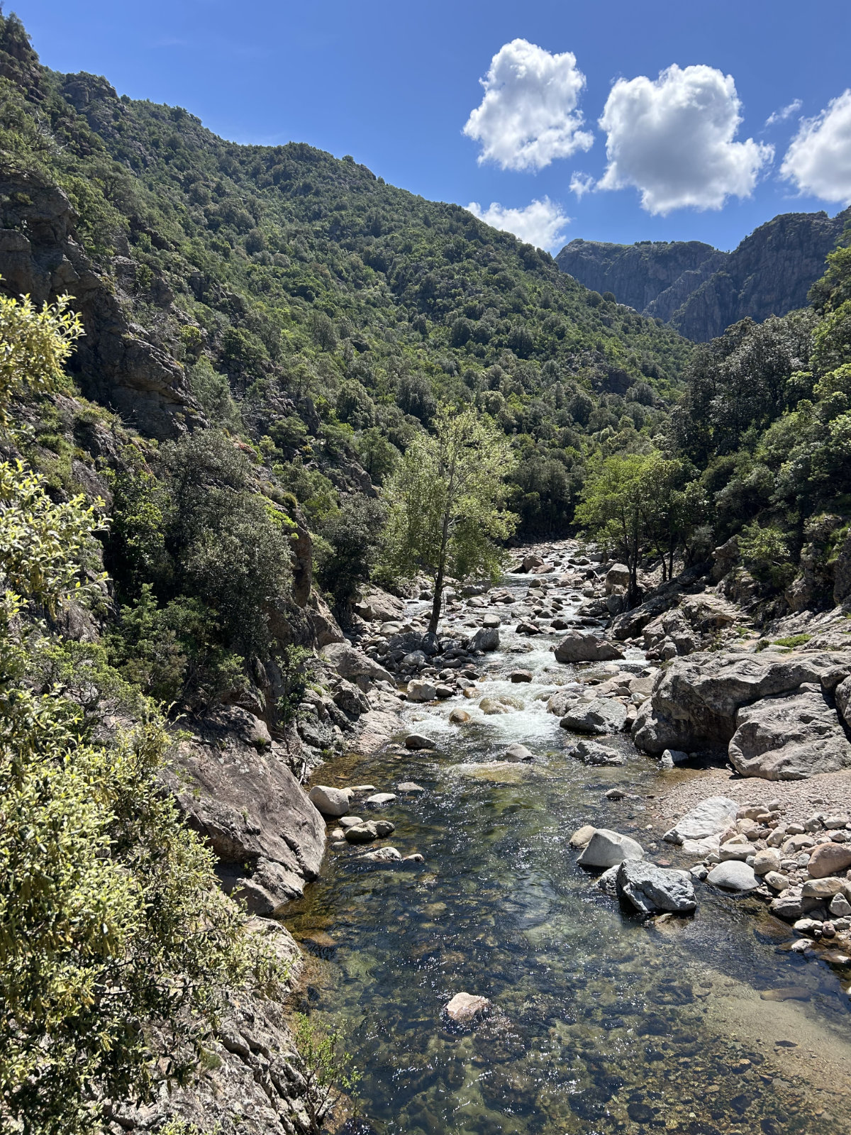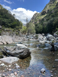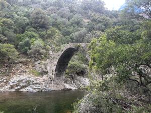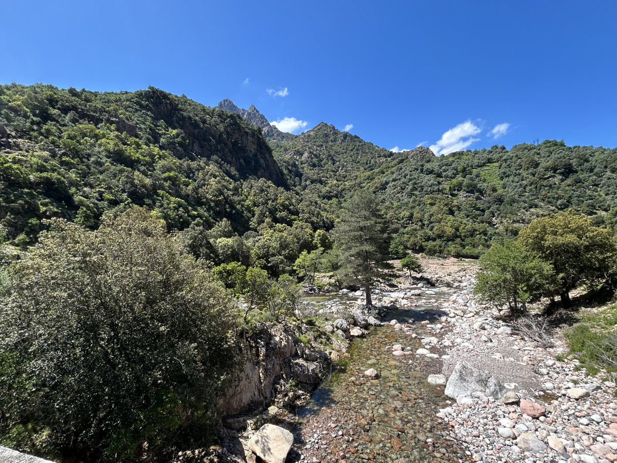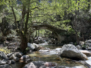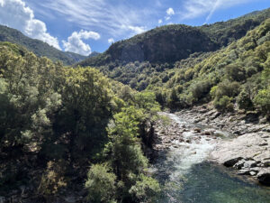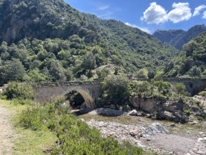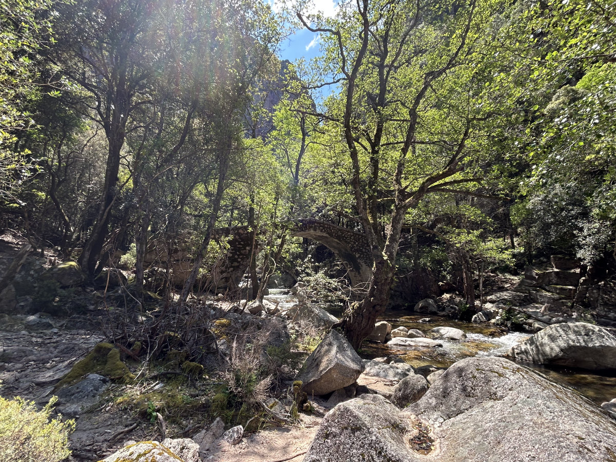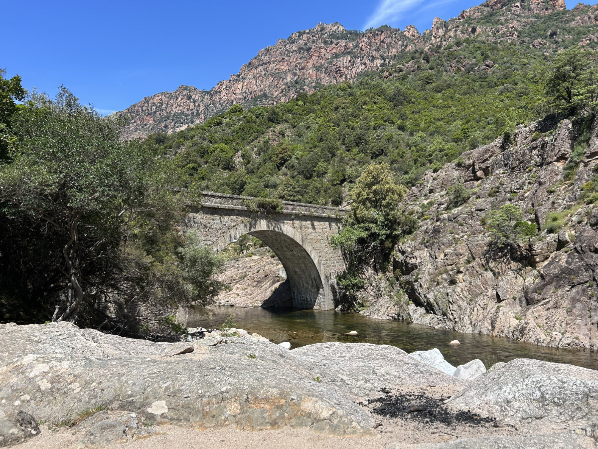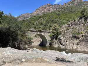 Die Spelunca-Schlucht liegt Zwischen Ota und Evisa. Hier haben sich die Portozuflüsse Lonca, Tavulella und Aitone tief in den Fels gegraben. Das Ergebnis andauernder Erosion ist ein über dreihundert Meter tiefes Tal mit stellenweise steilen Wänden und erfrischenden Naturpools. Von Ota aus steigen wir ab in die Schlucht, wir hören das Rauschen des Gebirgsflusses weit unter uns. Als wir die Talsohle erreichen, weiss ich schon, welch Aufstieg uns auf dem Rückweg erwartet. Beiderseits des Weges steigen Felswände steil empor. Wir folgen dem tosenden Fluss aufwärts, der sich in seinem breiten Bett den Weg zwischen Geröll und Felsen bahnt, über Geröllhalden und steinige Wege bis zur Genueserbrücke Pont Génois de Pianella (auch Ponte Vecchiu genannt). Wir überqueren die Brücke und kraxeln auf allen Vieren den Hang hoch, bis uns das zu blöd wird, wir kehren um und rutschen, teilweise auf dem Hosenboden, wieder runter, bis wir bei der Brücke auf sicheren Grund stossen. Wir folgen nun dem Weg auf der gegenüberliegenden Seite bis zur Brücke (Les 2 Ponts). Hier beginnt der spektakulärste Teil unserer Tour, durch die enge Spelunca-Schlucht entlang des Tavulella-Bachs zur Genueserbrücke Pont de Zaglia. Wir rasten auf grossen Felsen mitten im Flussbett und bestaunen die sagenhafte Landschaft, die uns umgibt. Als wir nach vier Stunden wieder in Ota eintreffen, bin ich einigermassen erschöpft und überwältigt von den Eindrücken, die uns das Naturschauspiel der Spelunca-Schlucht geboten hat.