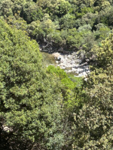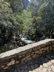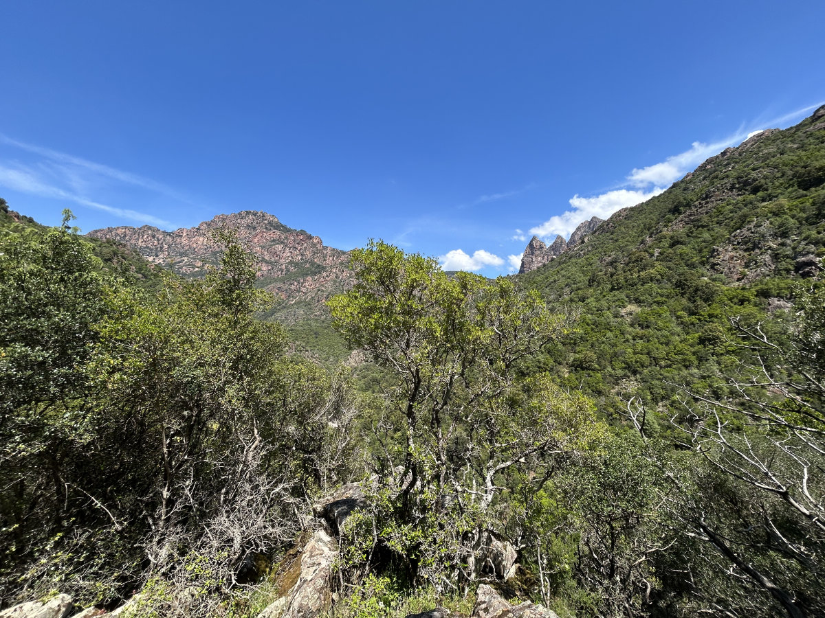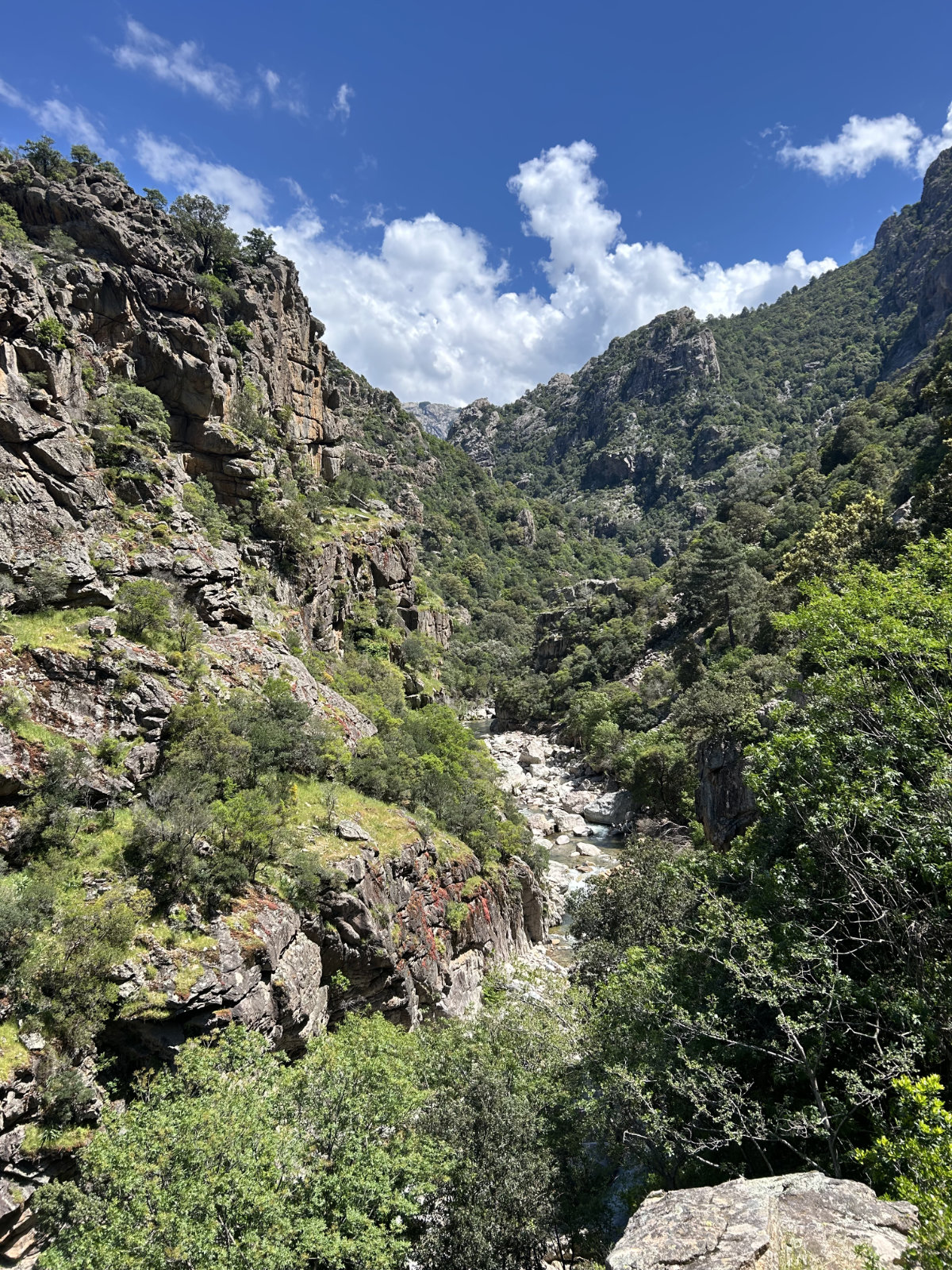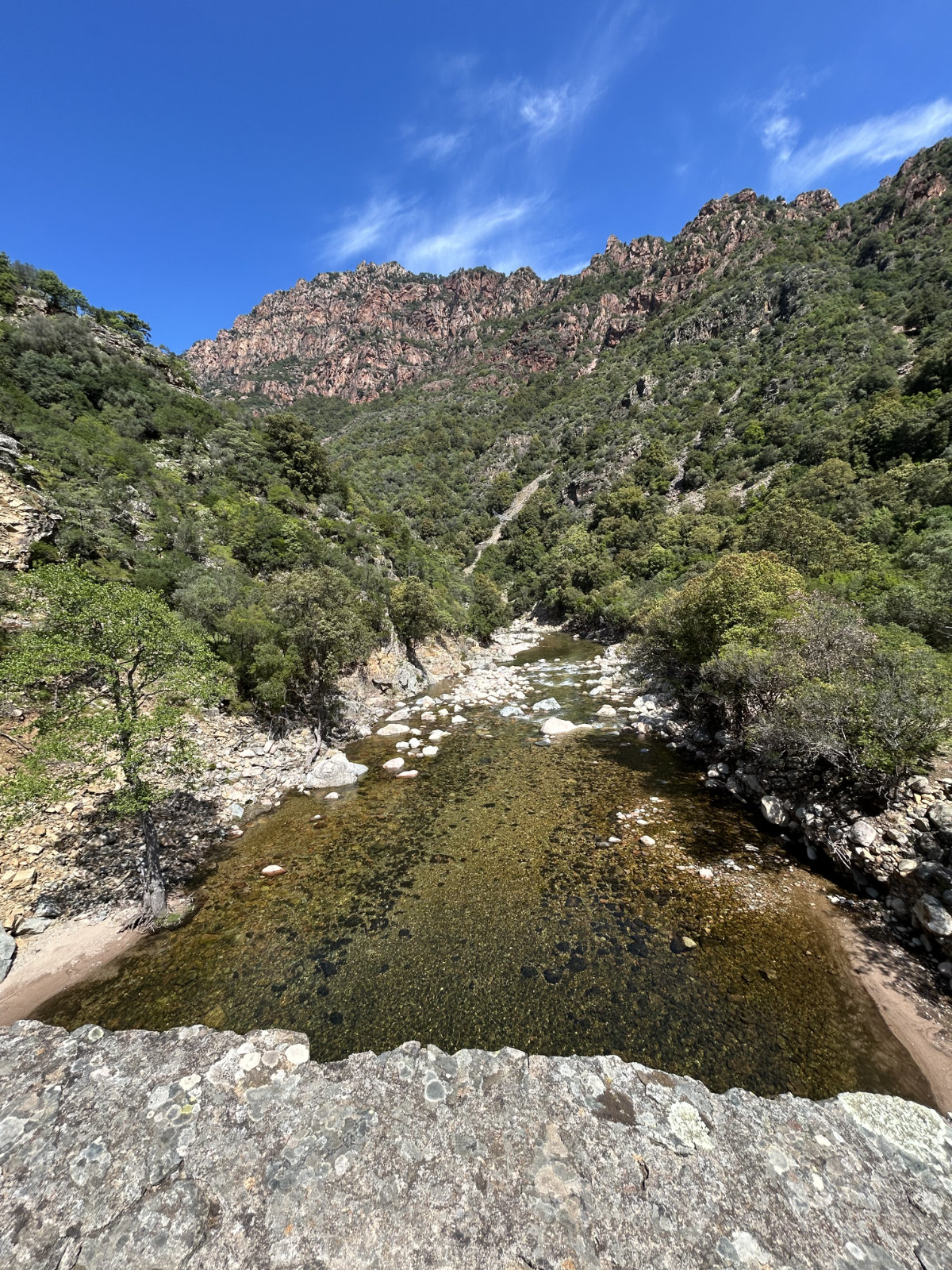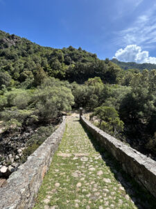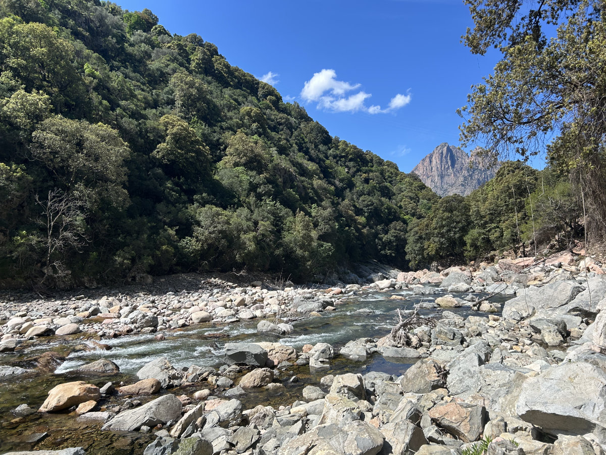 Die Spelunca-Schlucht liegt Zwischen Ota und Evisa. Hier haben sich die Portozuflüsse Lonca, Tavulella und Aitone tief in den Fels gegraben. Das Ergebnis andauernder Erosion ist ein über dreihundert Meter tiefes Tal mit stellenweise steilen Wänden und erfrischenden Naturpools. Von Ota aus steigen wir ab in die Schlucht, wir hören das Rauschen des Gebirgsflusses weit unter uns. Als wir die Talsohle erreichen, weiss ich schon, welch Aufstieg uns auf dem Rückweg erwartet. Beiderseits des Weges steigen Felswände steil empor. Wir folgen dem tosenden Fluss aufwärts, der sich in seinem breiten Bett den Weg zwischen Geröll und Felsen bahnt, über Geröllhalden und steinige Wege bis zur Genueserbrücke Pont Génois de Pianella (auch Ponte Vecchiu genannt). Wir überqueren die Brücke und kraxeln auf allen Vieren den Hang hoch, bis uns das zu blöd wird, wir kehren um und rutschen, teilweise auf dem Hosenboden, wieder runter, bis wir bei der Brücke auf sicheren Grund stossen. Wir folgen nun dem Weg auf der gegenüberliegenden Seite bis zur Brücke (Les 2 Ponts). Hier beginnt der spektakulärste Teil unserer Tour, durch die enge Spelunca-Schlucht entlang des Tavulella-Bachs zur Genueserbrücke Pont de Zaglia. Wir rasten auf grossen Felsen mitten im Flussbett und bestaunen die sagenhafte Landschaft, die uns umgibt. Als wir nach vier Stunden wieder in Ota eintreffen, bin ich einigermassen erschöpft und überwältigt von den Eindrücken, die uns das Naturschauspiel der Spelunca-Schlucht geboten hat.