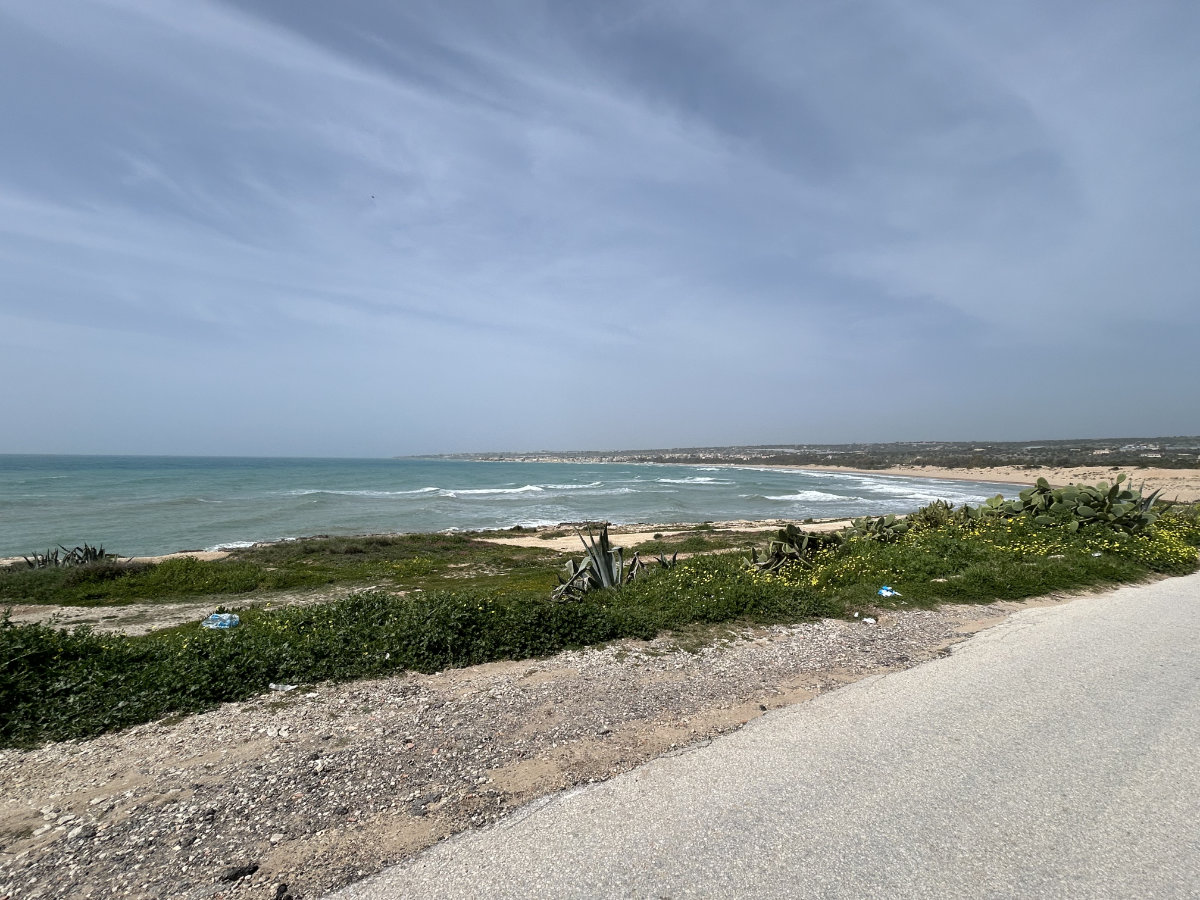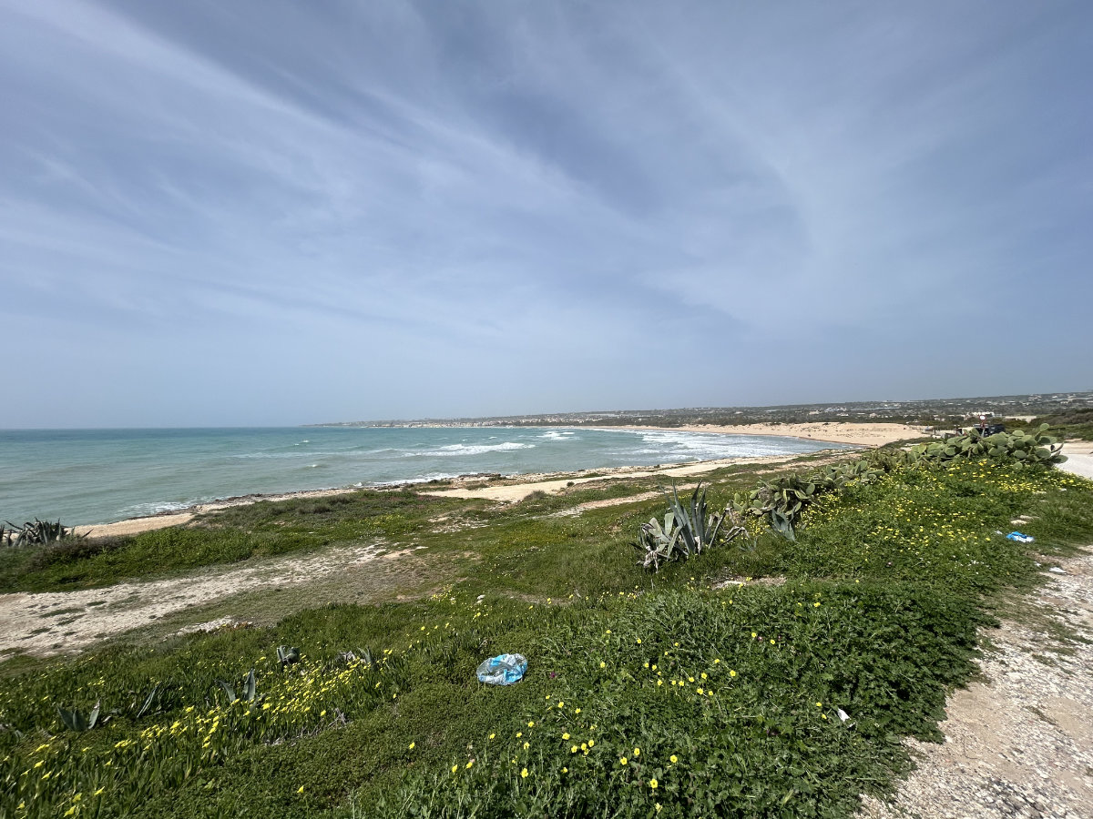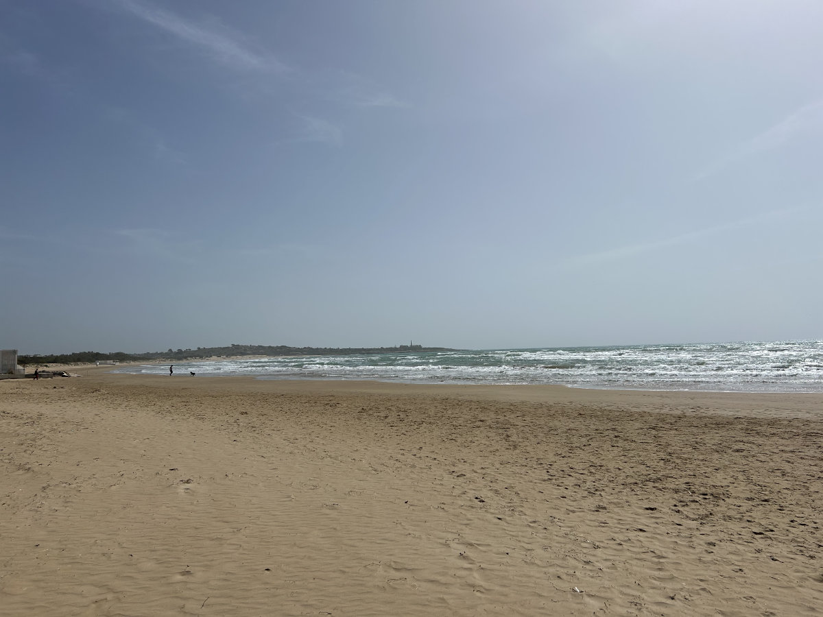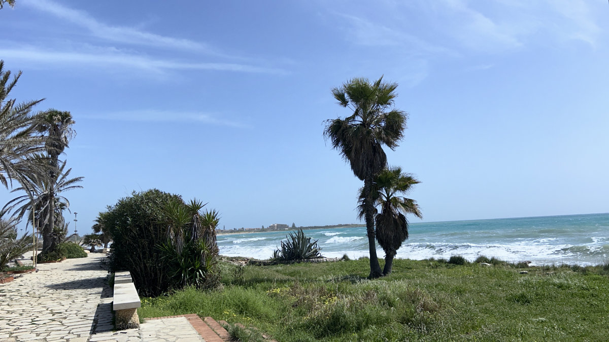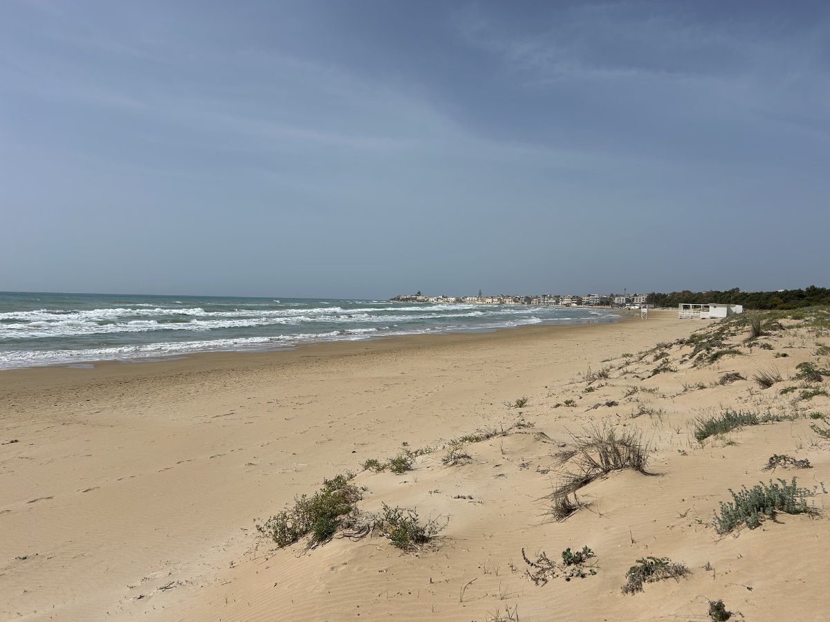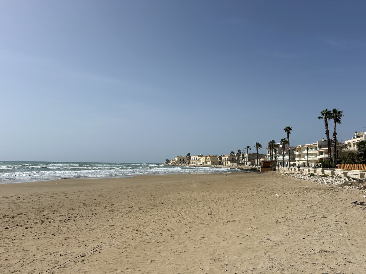 Wir stehen auf der Uferpromenade von Sampieri, am langen, schönen Sandstrand. In der vordersten Reihe stehen schmucke Ferienwohnungen, die meisten stehen noch leer. Von da könnte man morgens 30 Schritte tun, und noch vor der ersten Zigarette ein Bad im Meer nehmen. Cool.
