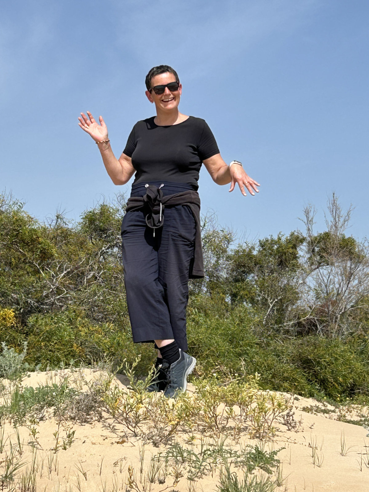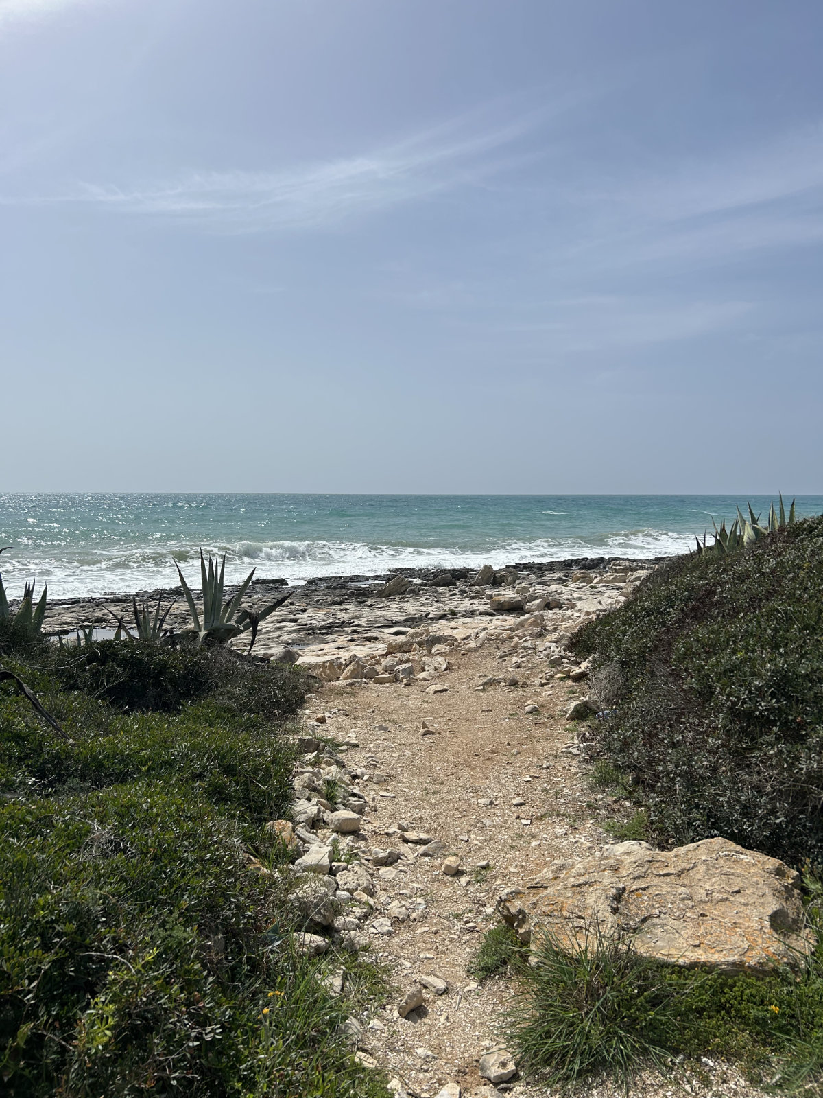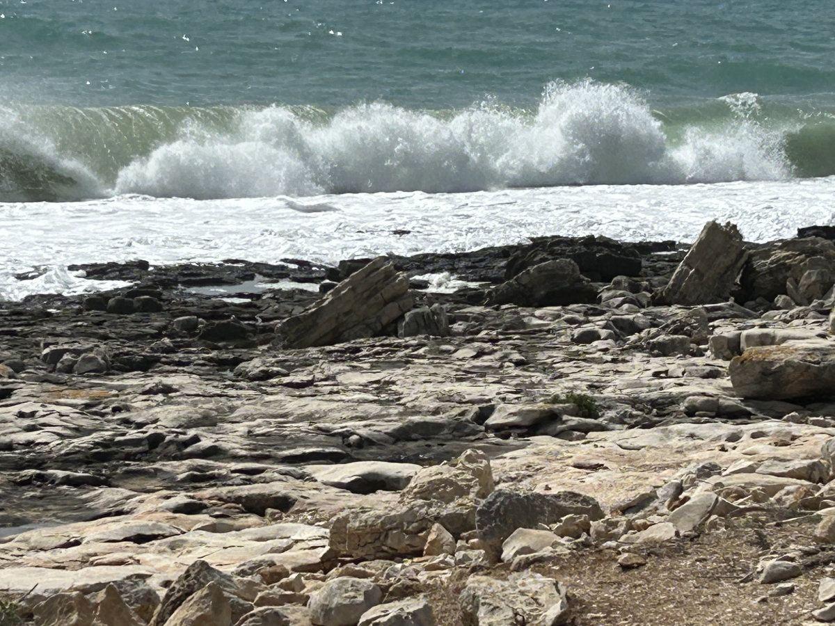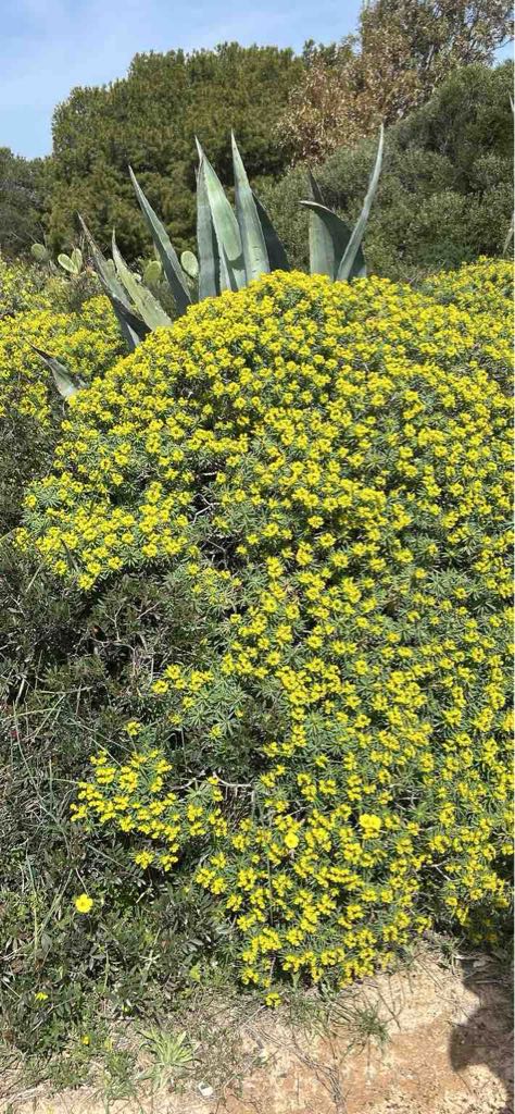 Wir spazieren in östlicher Richtung, rechterhand das Meer und der ellenlange Sandstrand, links ein schöner Park unter Pinien, mit Picknicktischen auf steinernen Podesten. Wir gehen weiter, nun türmen sich zwischen unserem Weg und dem Strand kleine, mit grünen Bodendeckern bewachsene Dünen auf. Sofort werden Erinnerungen an unseren Aufenthalt bei der Dune du Pilat wach. Bald erreichen wir einen Bach, der sich ins Meer ergiesst und folgen dem Fussgänger- und Veloweg, weg vom Meer ins Landesinnere, da entlang eines breiten, dichtbewachsenen Streifens zwischen unserem Weg und der Küstenstrasse. Zwischen uns und dem Meer liegt nun ein kleiner, dichter Dschungel mit Brackwasserseen. Nach zwei Kilometern führt der Weg wieder zur Küste, nun ist der Sandstrand schwarzer Lava gewichen, die sich einst ins Meer ergoss und dort erkaltete. Die Brandung hoher Wellen bricht mit Getöse auf die Steine, wir folgen der Küste auf einem breiten Weg, vorbei an den allgegenwärtigen, riesigen Feigenkakteen, an Hundertjährigen Agaven, an Weidenblatt-Akazien, die in voller Blüte stehen und ihren lieblichen, süssen Duft verbreiten. Grüne Sträucher und Gebüsch, gelbe, weisse und blaue Blumen, wohin das Auge reicht, Pinien und Palmen allüberall, eine wahre Pracht!