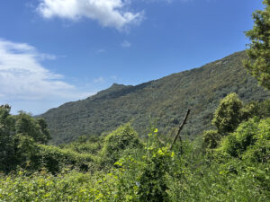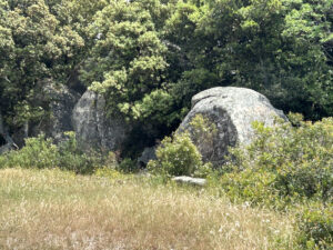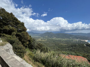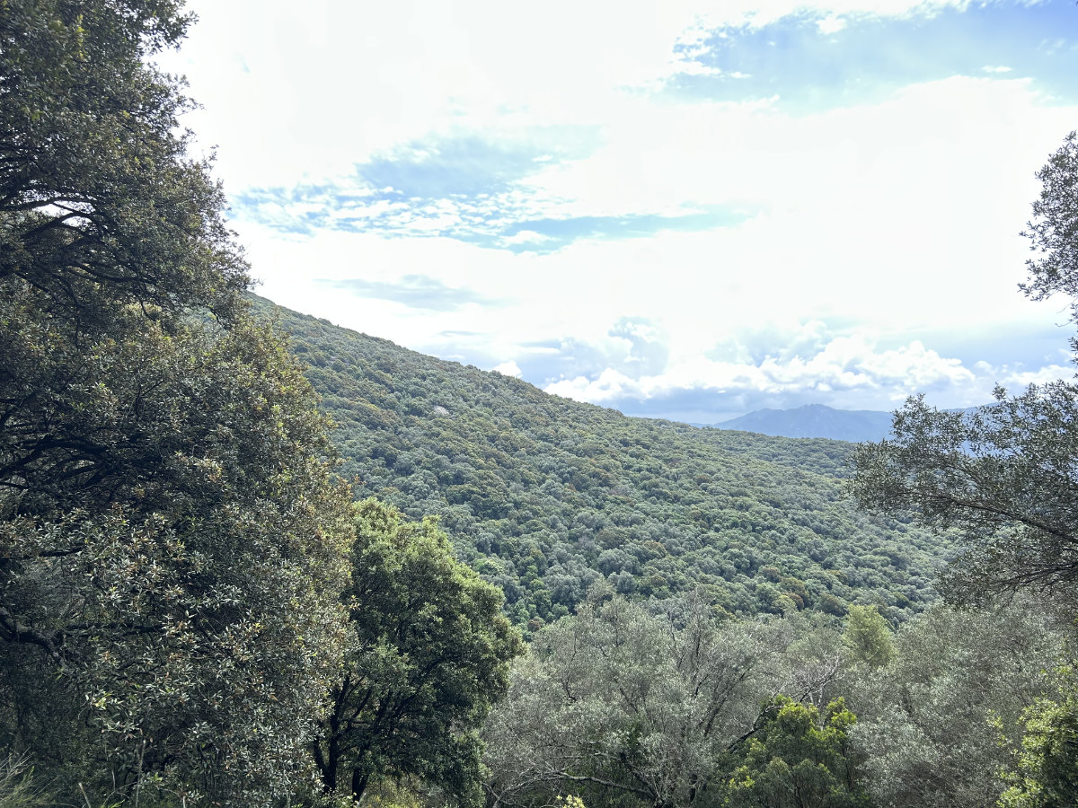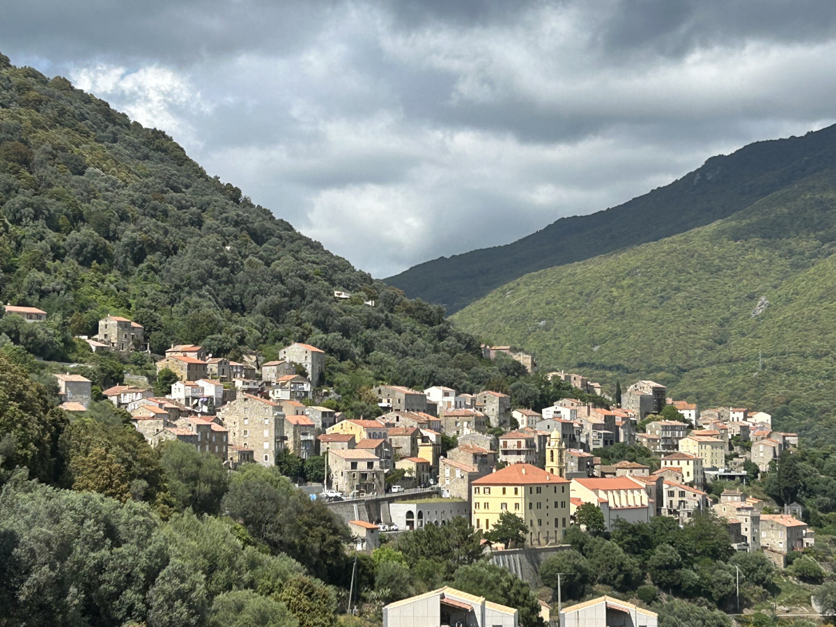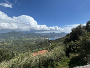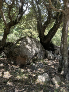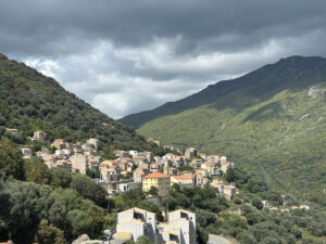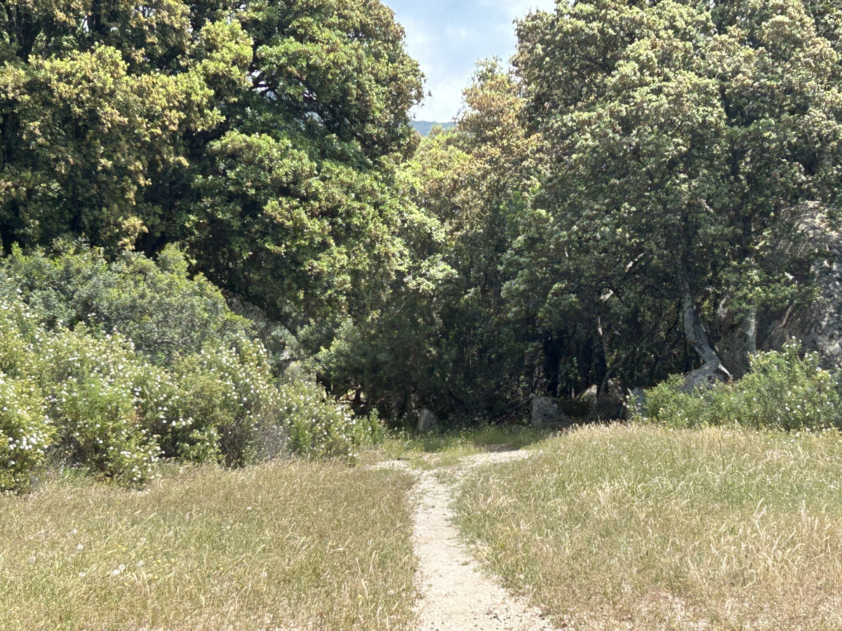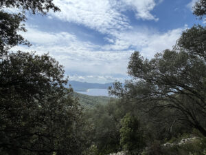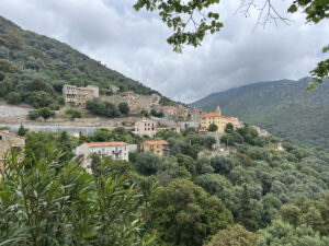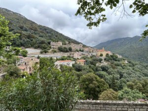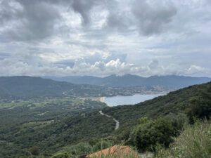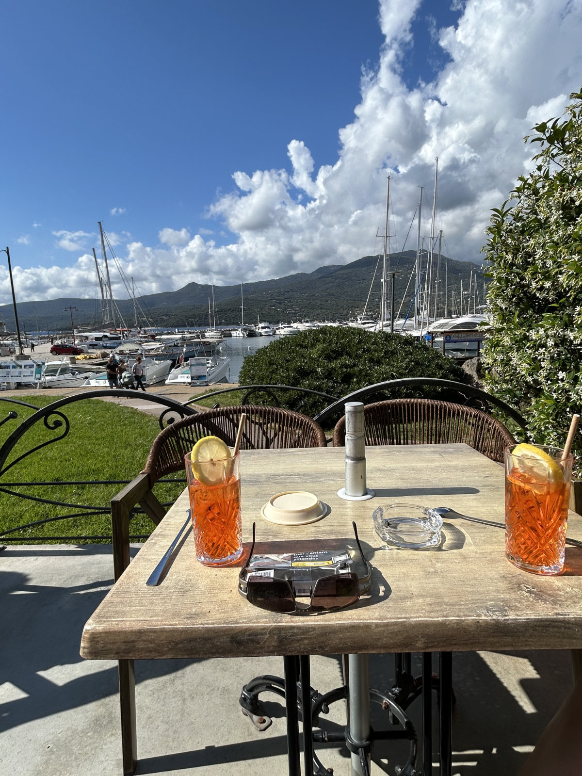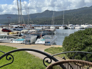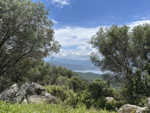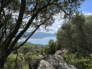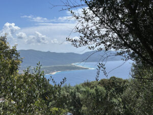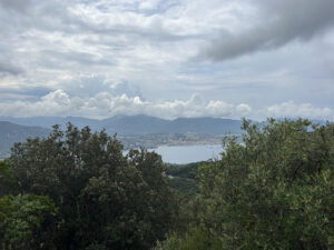 Vom Zeltplatz aus sehen wir im gegenüberliegenden Hang ein Dorf: Olmeto. Dort beginnt unsere heutige Wanderung. Wir folgen zuerst einer Nebenstrasse mit schönen Ausblicken auf die Bucht, auf Propriano und den Strand unterhalb unseres Campingplatzes. Danach führt uns ein schattiger Wanderweg durch den Wald dem Hang entlang. Wir rasten auf einer grossen Lichtung mit schönen Baumgruppen und grossen Felsen. Zurück in Olmeta hat kein einziges Restaurant geöffnet, das geht gar nicht! Wir parken auf einem grossen Parkplatz am Meer, vor dem Zentrum von Propriano, dort gibts ein schönes Restaurant – nur leider, auch dieses hat noch nicht geöffnet. Wir machen uns auf den Weg zum Hafen und kommen an einer Boutique vorbei, da findet Susanne ein schönes (grünes) Röckli. Es steht ihr prächtig, nur die Wanderschuhe, die sie trägt, passen nicht so recht dazu, als sie aus der Umkleide kommt. Wir plaudern ein wenig mit der netten Verkäuferin und dann ist es endlich soweit, wir bekommen unsere wohlverdienten Drinks auf einer sonnenbeschienen Terrasse am Hafen.