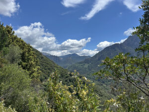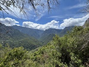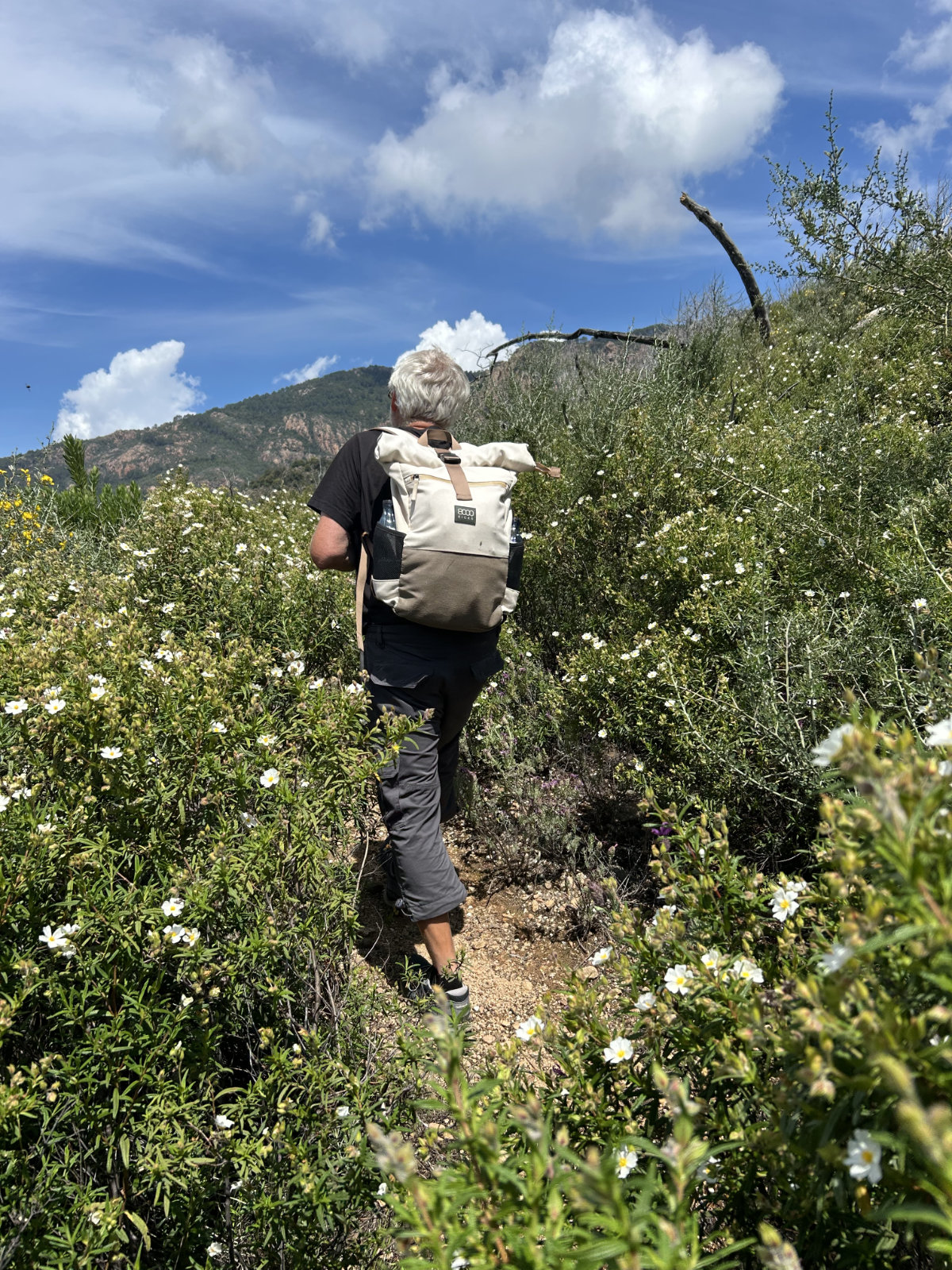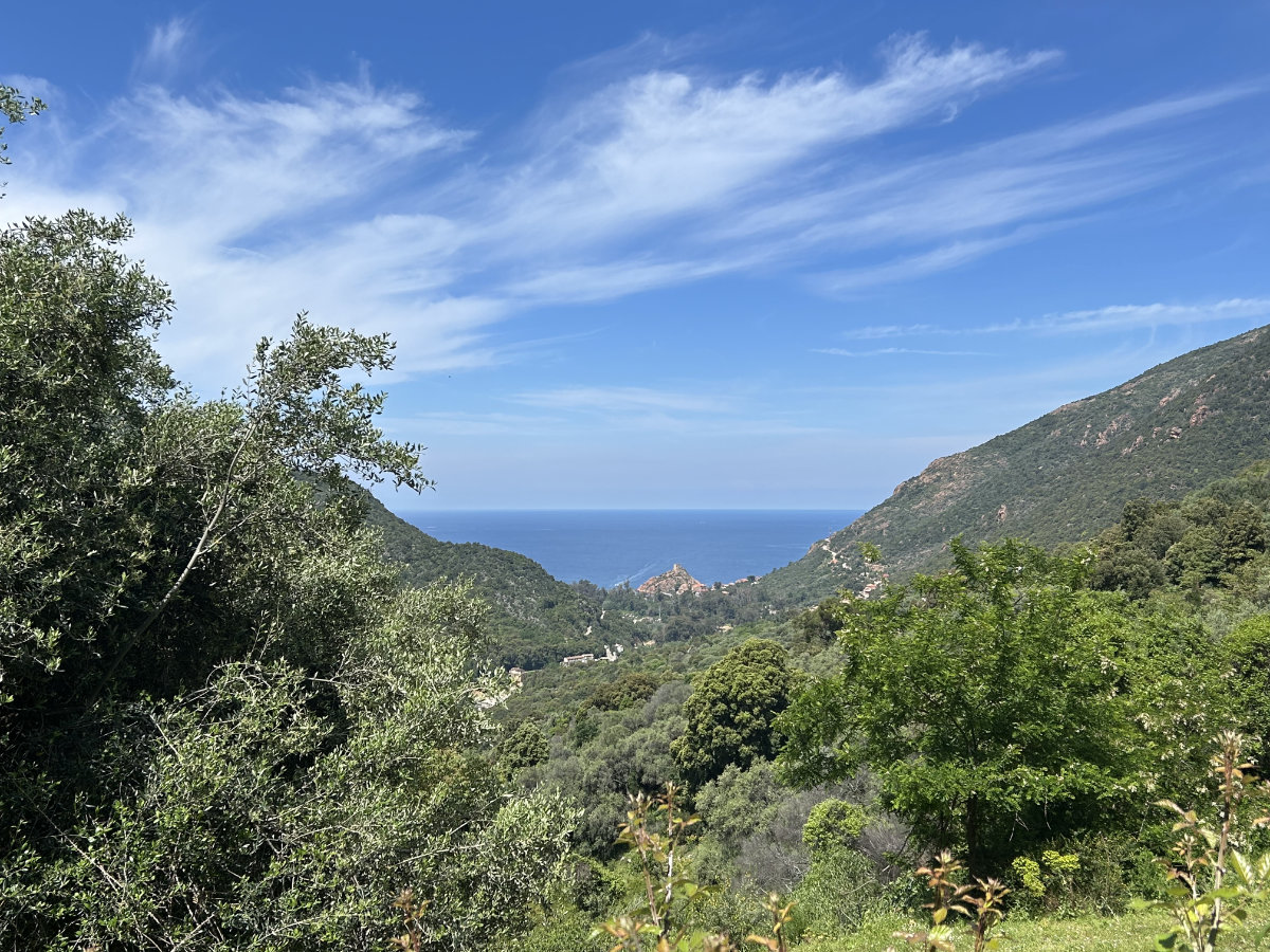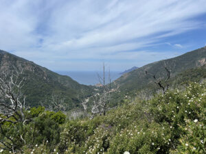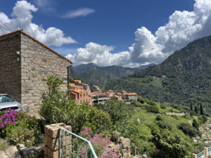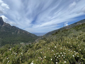 Unsere Tour führt das Tal hoch, Ziel ist das Städtchen Ota. Zuerst ist der Wanderweg leicht begehbar, doch im späteren Verlauf kämpfen wir uns durch mannshohe Macchia, zumeist Montpellier-Zistrosen, die den schmalen Pfad völlig überwuchern, aber auch dornenbewehrte Pflanzen, die uns die Schienbeine und Arme zerkratzen. Als wir endlich aus dem dschungelartigen Dickicht herauskommen, führt der Pfad über Stock und Stein, es ist ganz schön anstrengend. Nach einer Biegung sehen wir plötzlich Ota unter uns, das sich an den Hang schmiegt. Wir steigen ab in den Ort und kommen an drei Restaurants vorbei, die alle nicht geöffnet haben. Erst am Dorfausgang finden wir ein Restaurant und lassen uns ein Glas Rosé schmecken, bevor wir uns auf den Rückweg machen.