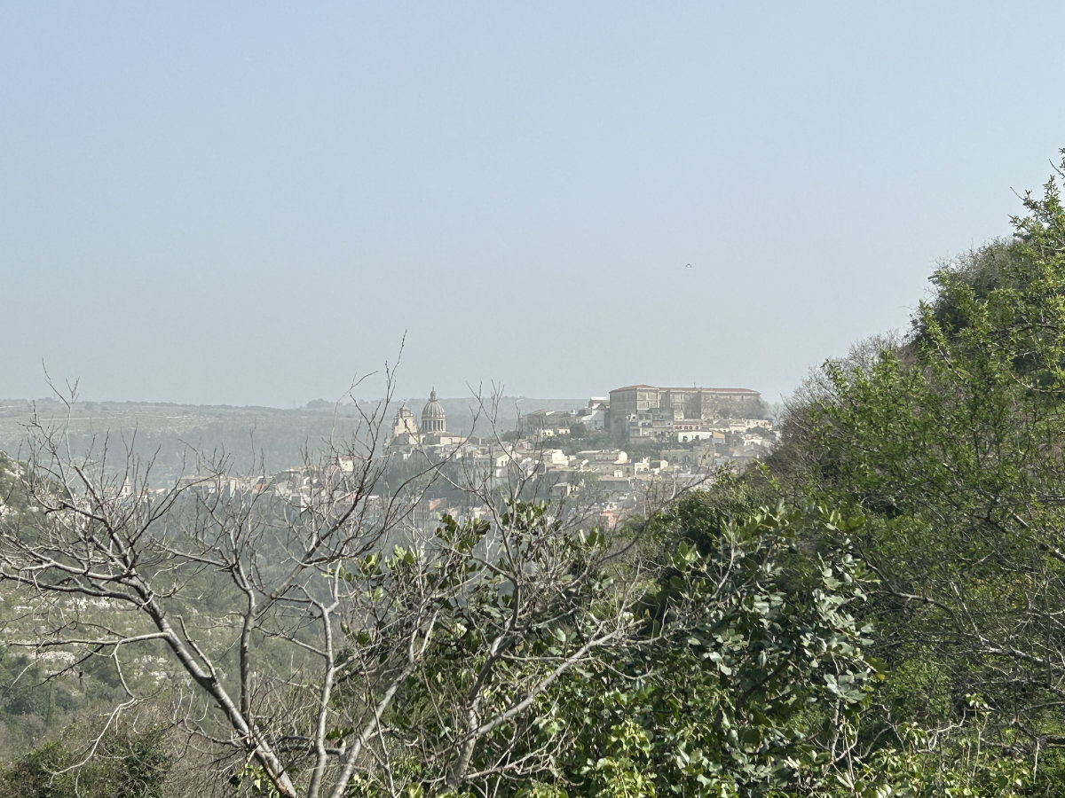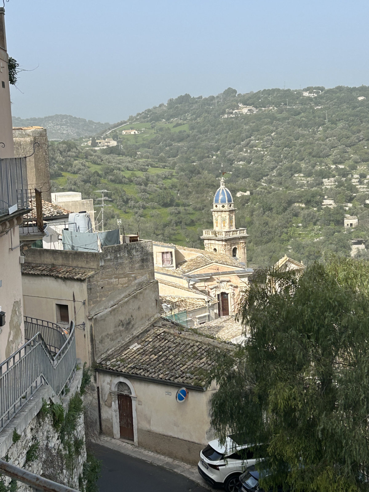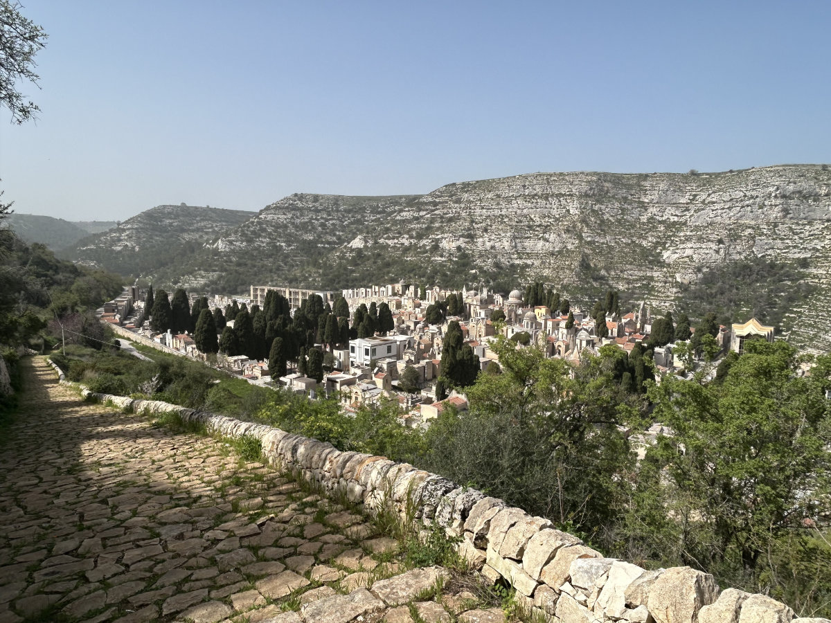 Die halbstündige Zugfahrt durch die Schlucht, von Scicli nach Ragusa, war kurzweilig, weil landschaftlich hübsch anzusehen. Kurz bevor wir eintreffen, sehen wir die die beiden Stadtteile von Ragusa, – wow, die Stadt ist ja riesig! Wir laufen los und treffen auf eine schnurgerade Strasse, die scheint von einem zum anderen Ende der Stadt zu reichen. Wir befinden uns ganz am Rand der Stadt und begehen eine alte, gepflasterte Strasse ins Grüne. Was unter uns wie ein Stadtviertel aussieht, ist in Wirklichkeit ein Friedhof. Wir steigen weiter ab und sehen vor uns die Unterstadt Ragusa Iblei, mit der markanten Kuppel des Duomo di San Giorgio.