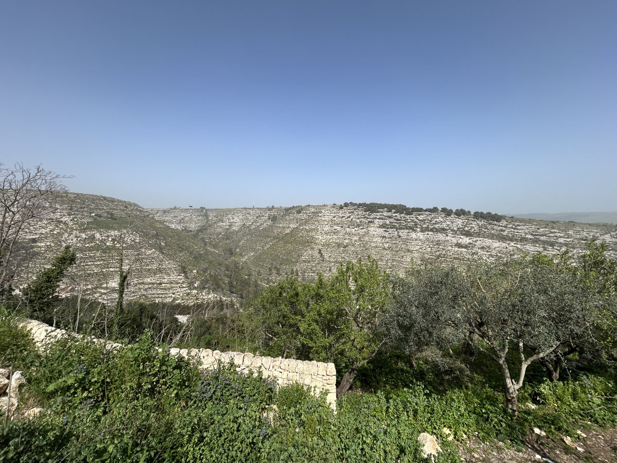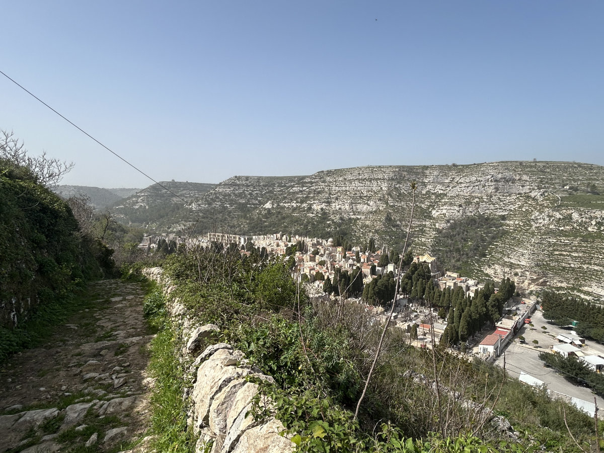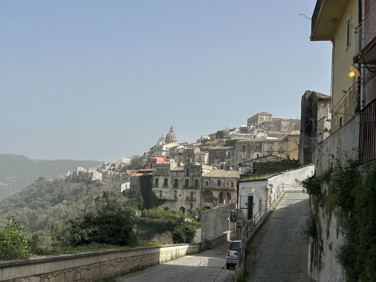 Die halbstündige Zugfahrt durch die Schlucht, von Scicli nach Ragusa, war kurzweilig, weil landschaftlich hübsch anzusehen. Kurz bevor wir eintreffen, sehen wir die die beiden Stadtteile von Ragusa, – wow, die Stadt ist ja riesig! Wir laufen los und treffen auf eine schnurgerade Strasse, die scheint von einem zum anderen Ende der Stadt zu reichen. Wir befinden uns ganz am Rand der Stadt und begehen eine alte, gepflasterte Strasse ins Grüne. Was unter uns wie ein Stadtviertel aussieht, ist in Wirklichkeit ein Friedhof. Wir steigen weiter ab und sehen vor uns die Unterstadt Ragusa Iblei, mit der markanten Kuppel des Duomo di San Giorgio.