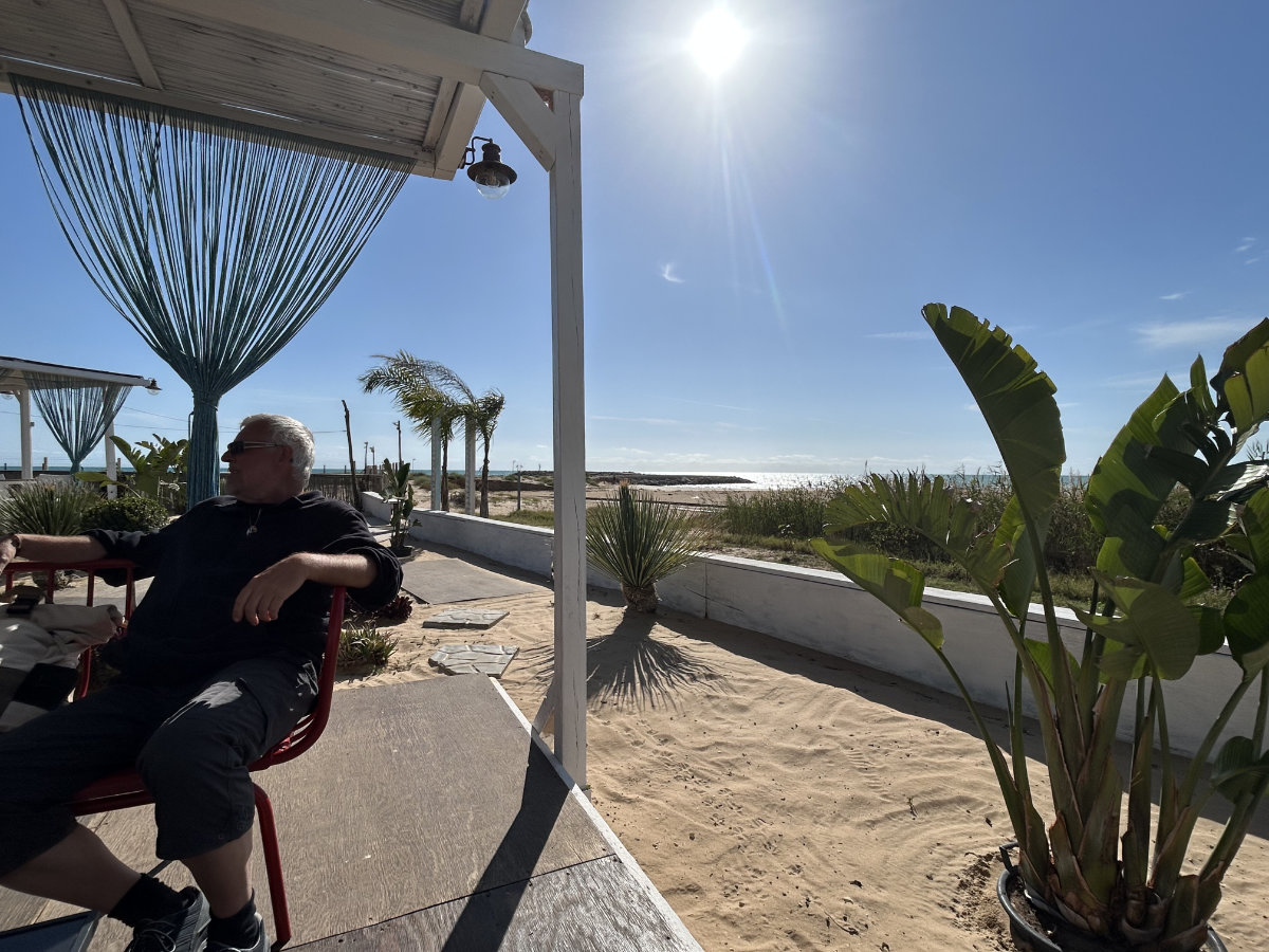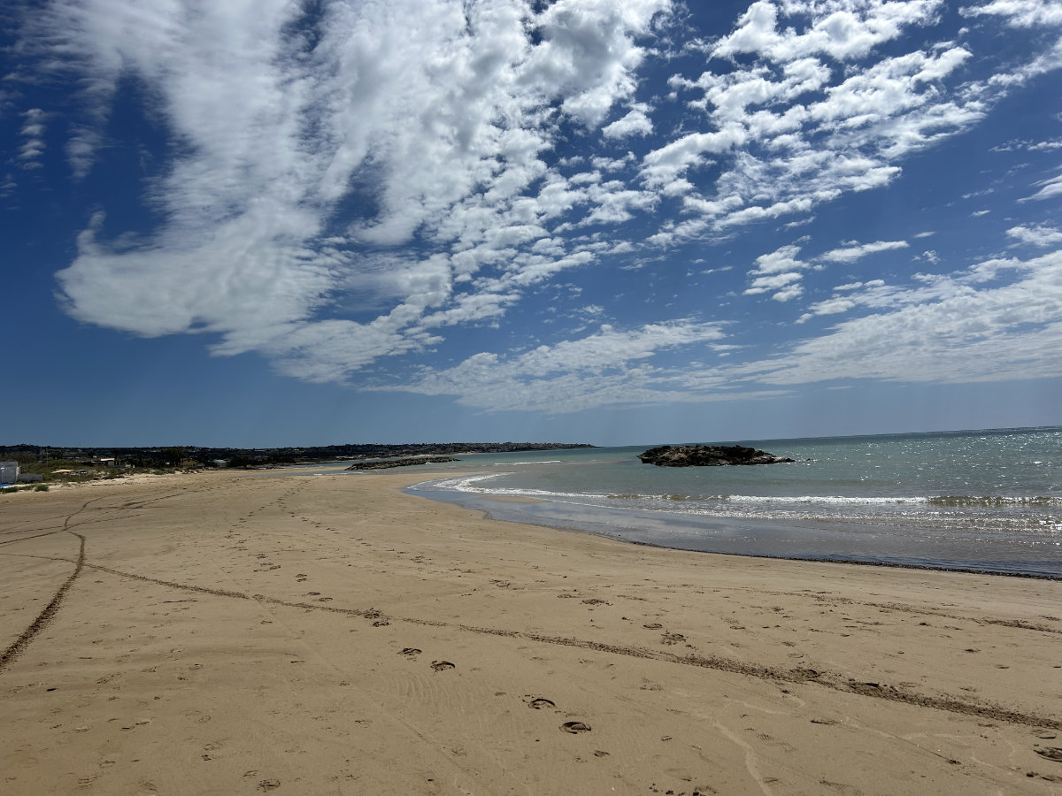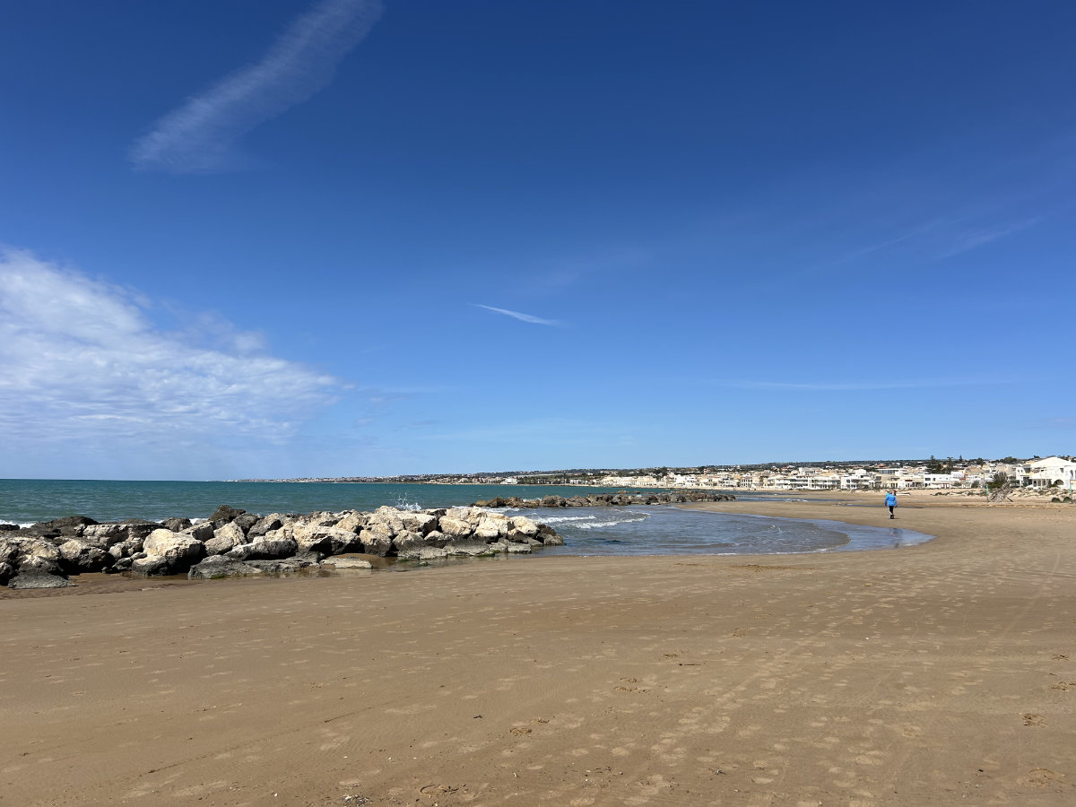 Wir beschliessen, noch einmal der Küste entlang zu gehen und fahren dafür nach Donnalucata. Wir spazieren direkt dem Meer entlang, der Sand ist fest und gut begehbar. Wir kommen von einer, durch Wellenbrecher aus Lavastein gebildeten, Bucht zur anderen. An diesen breiten und langen Sandstränden kann auch in der Hochsaison kein Dichtestress entstehen. Wir gehen weiter als vorgesehen, um ins Städtchen zu gelangen, das wir vor uns sehen. Dort angekommen, stellen wir fest, es ist Cava d’Aliga, unser Zeltplatz liegt gleich um die Ecke. Wir hätten uns die Fahrt mit dem Auto also auch sparen können! Macht nichts, wir können gut über uns selber lachen.