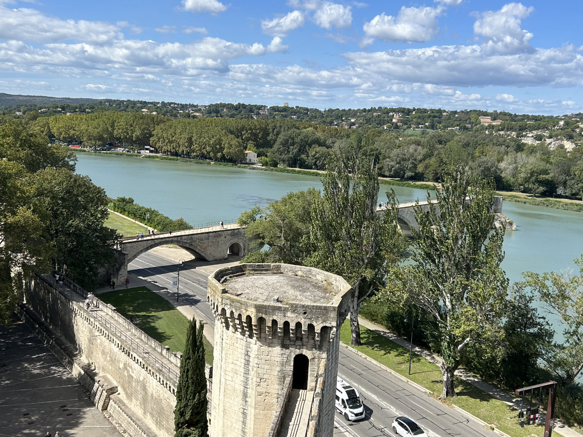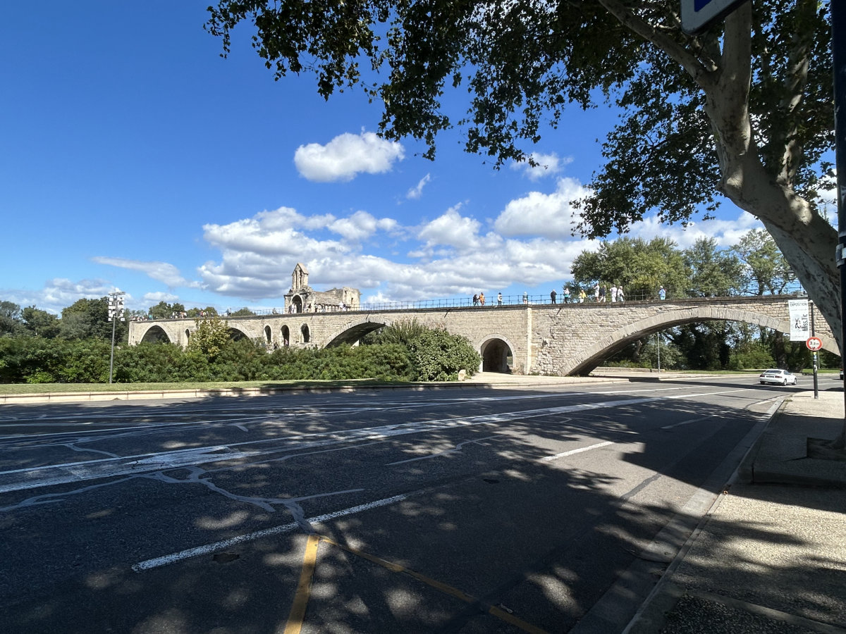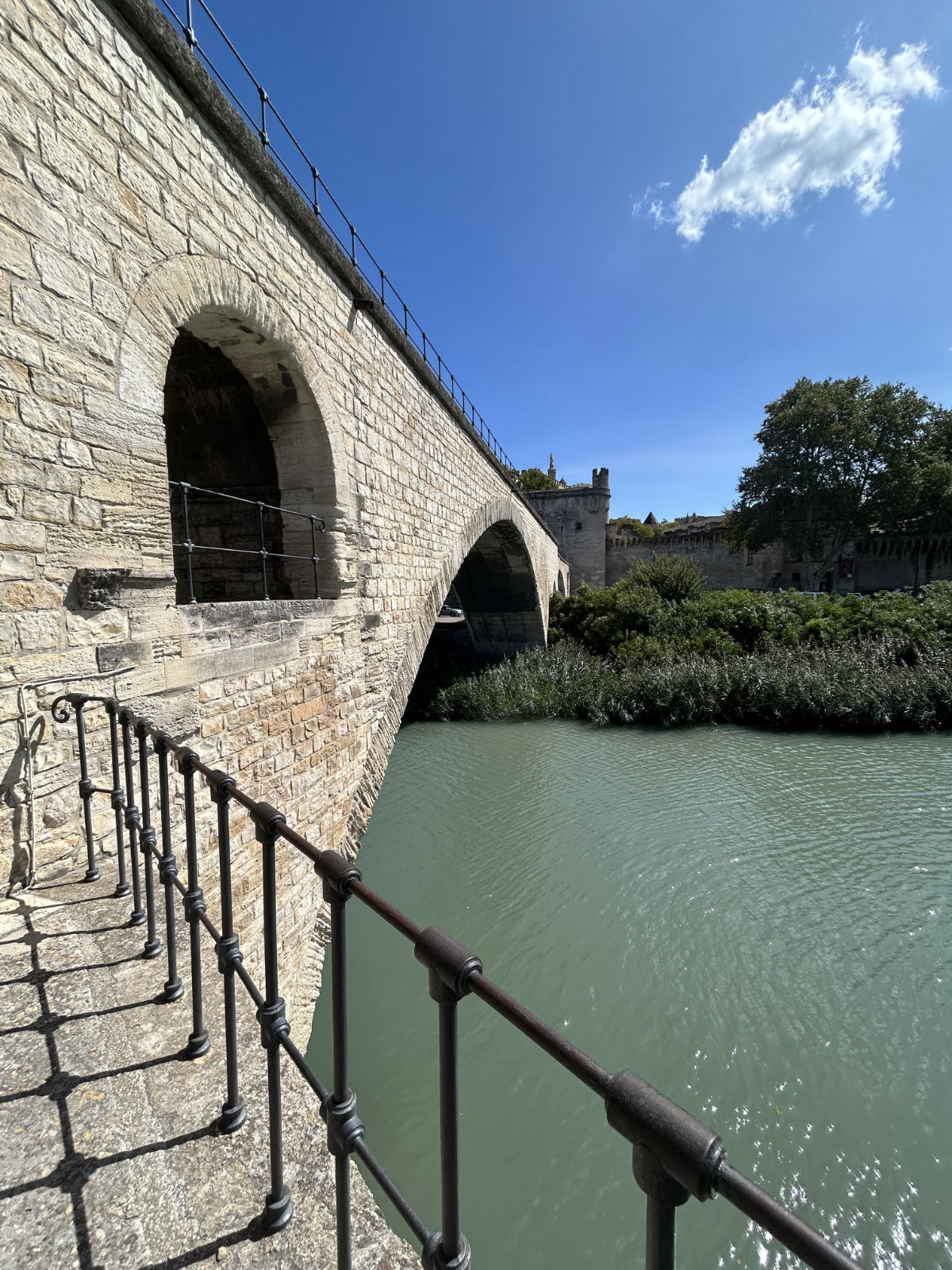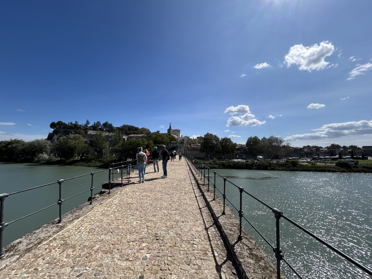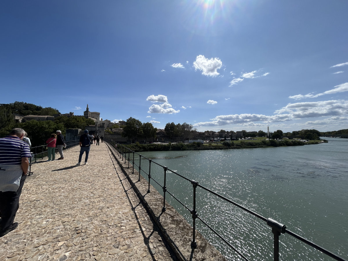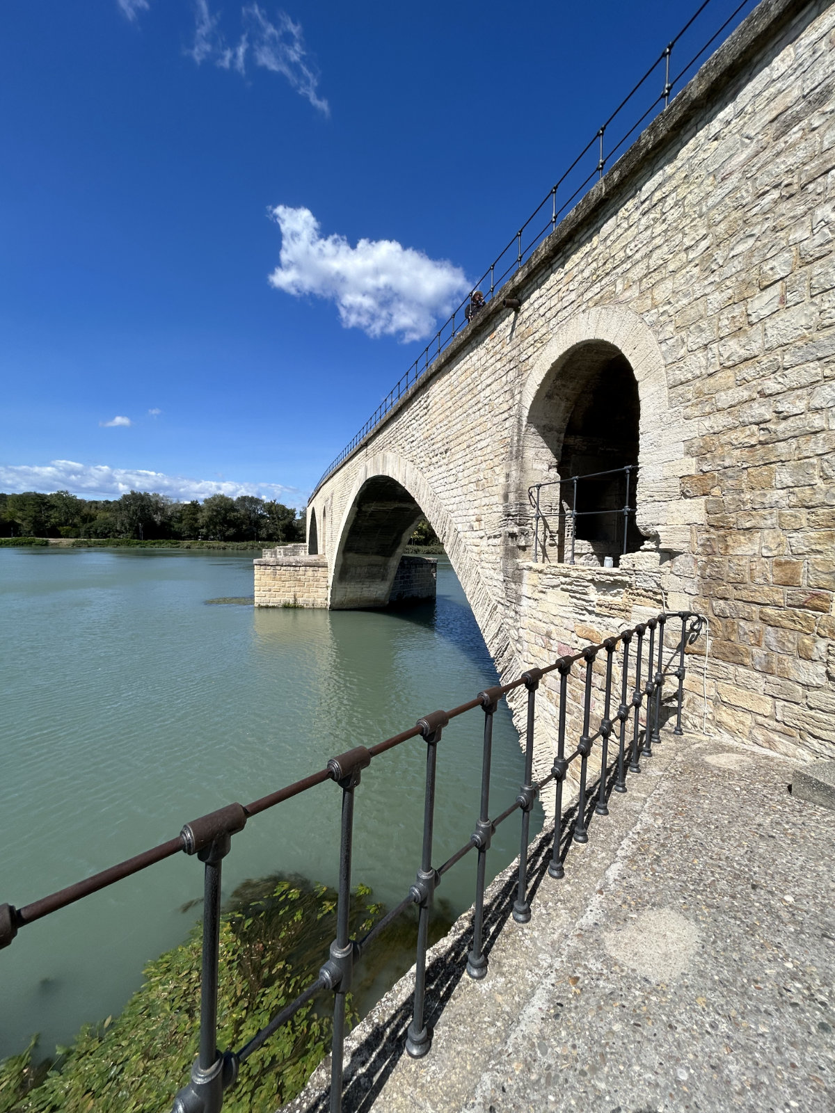 Wir spazierten um den gewaltigen Palais des Papes, wo die Touristen Schlange standen, um ins Innere zu gelangen. Uns interessierte das weniger, aber wir wollten auf die berühmte Brücke und zahlten dafür 5 Euro pro Person. Von ihren zweiundzwanzig Brückenbogen, die im 14. Jahrhundert über die Rhone gebaut wurden, hielten der Flut von 1668 nur vier Bogen stand, so dass die Brücke heute im Fluss endet.